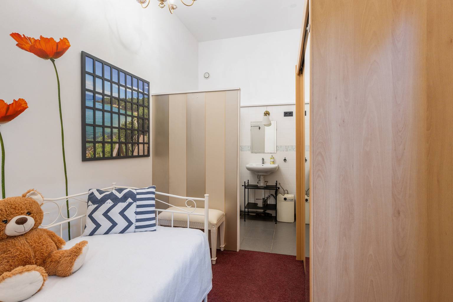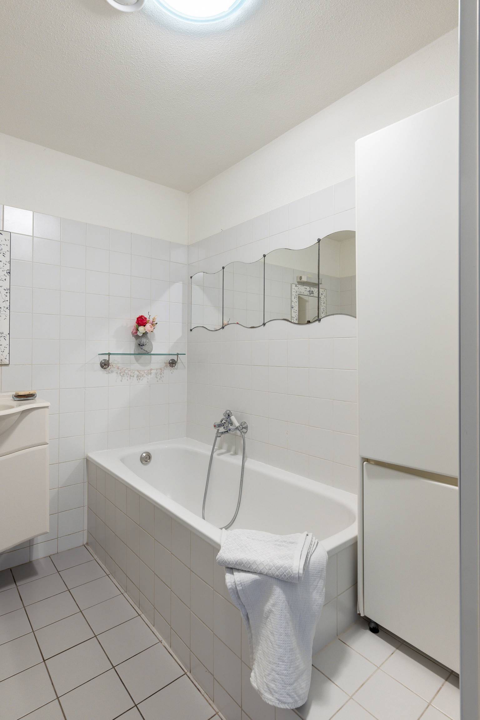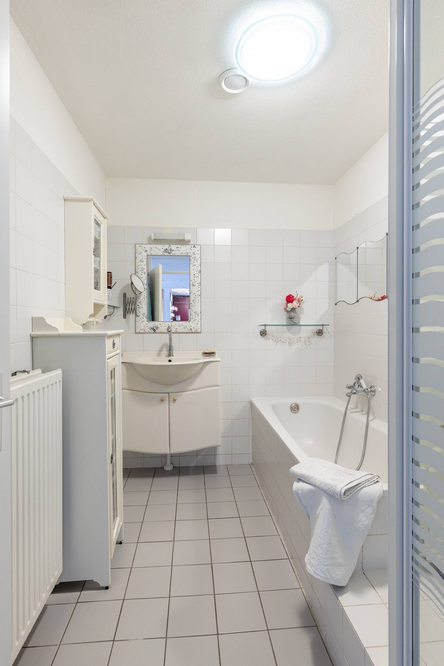 De inpandige badkamer is grotendeels betegeld en uitgerust met een ligbad, een douchecabine, een wastafelmeubel en verwarming.