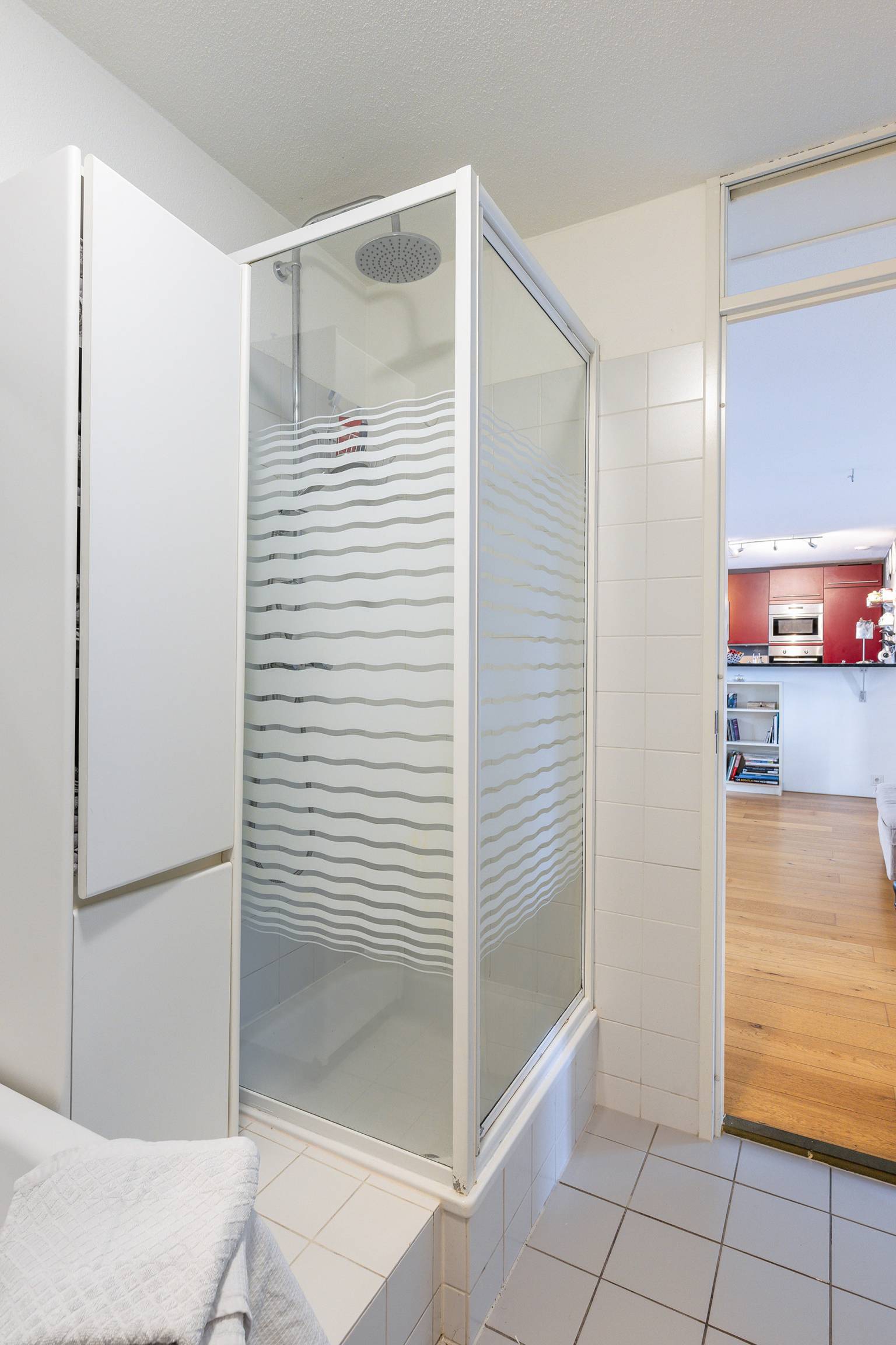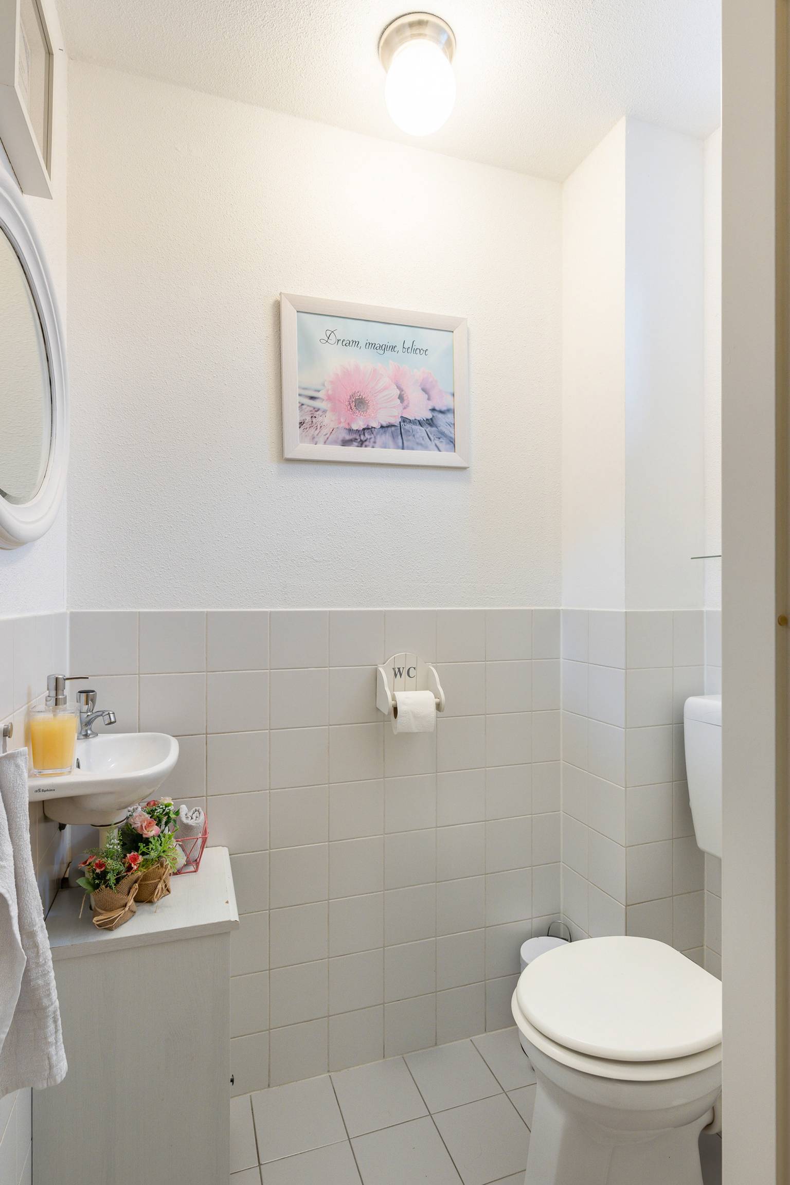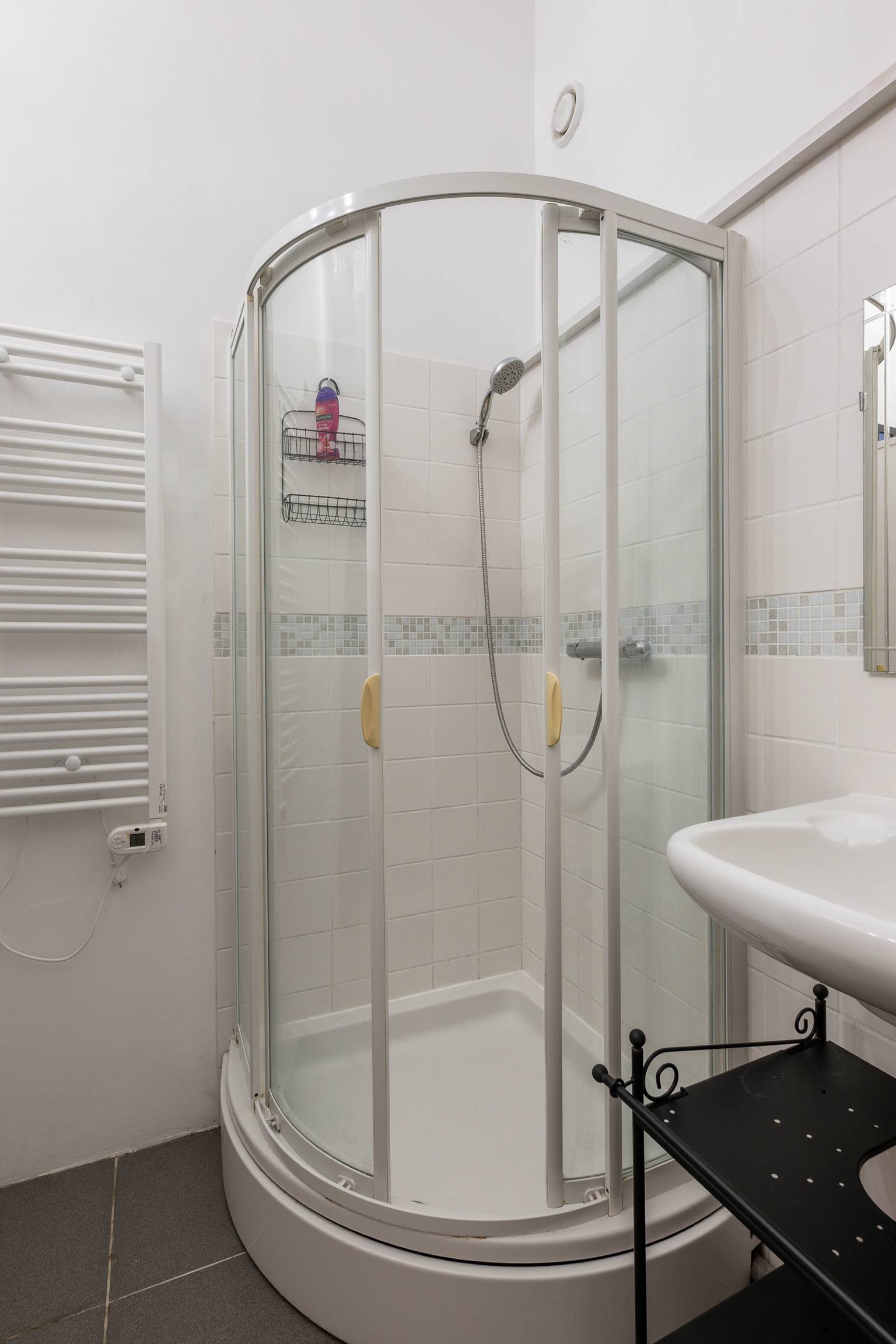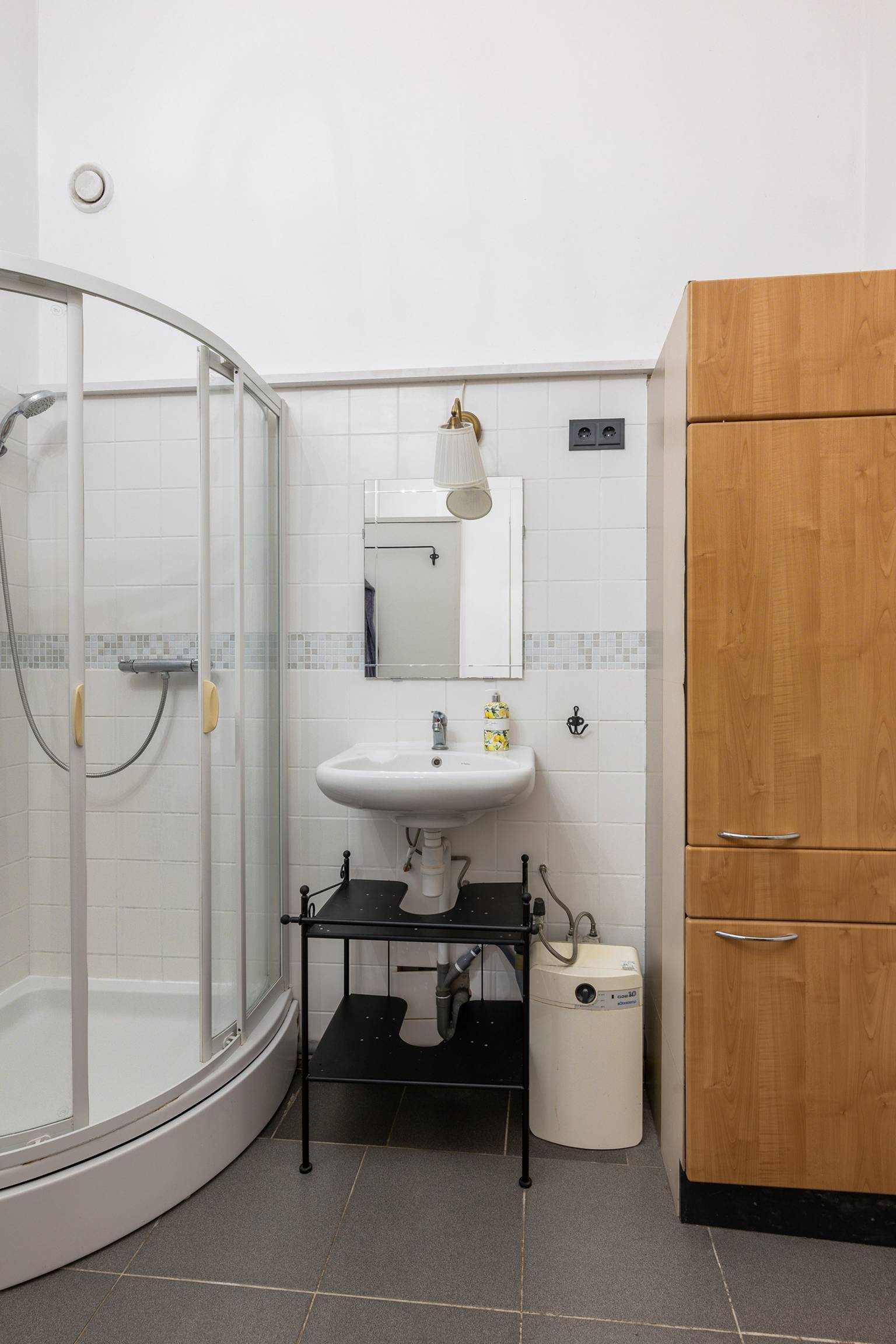 De badkamer is deels betegeld en uitgerust met een douchecabine en een wastafel. Daarnaast hangt er een elektrische handdoeken radiator, is er een close-in boiler aanwezig en staat er een hoge kast met een inbouw koelkast.