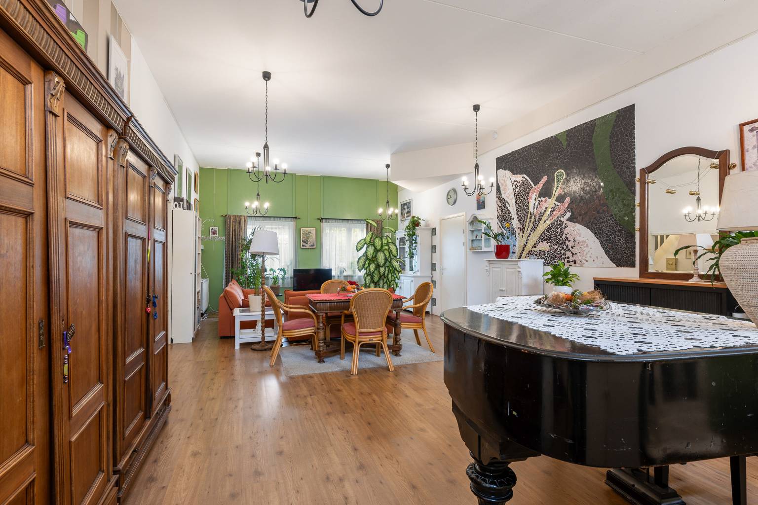 De woonkamer is een grote ruimte die eventueel naar wens te gebruiken is als bedrijfsruimte, het is eenvoudig zelfs de garage hierbij te betrekken. De ruimte is anderzijds ook gemakkelijk op te delen voor het creëren van extra kamers. Er is verwarming aanwezig en aan weerszijden zijn ramen aanwezig voor daglichttoetreding. Op de vloer ligt laminaat en de wanden zijn deels behangen. Vanuit de woonkamer is er toegang tot een aparte kamer, de garage en het toilet, dat handig is voorzien van een voorportaal met een fonteintje.