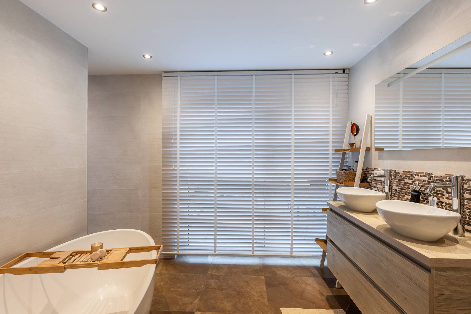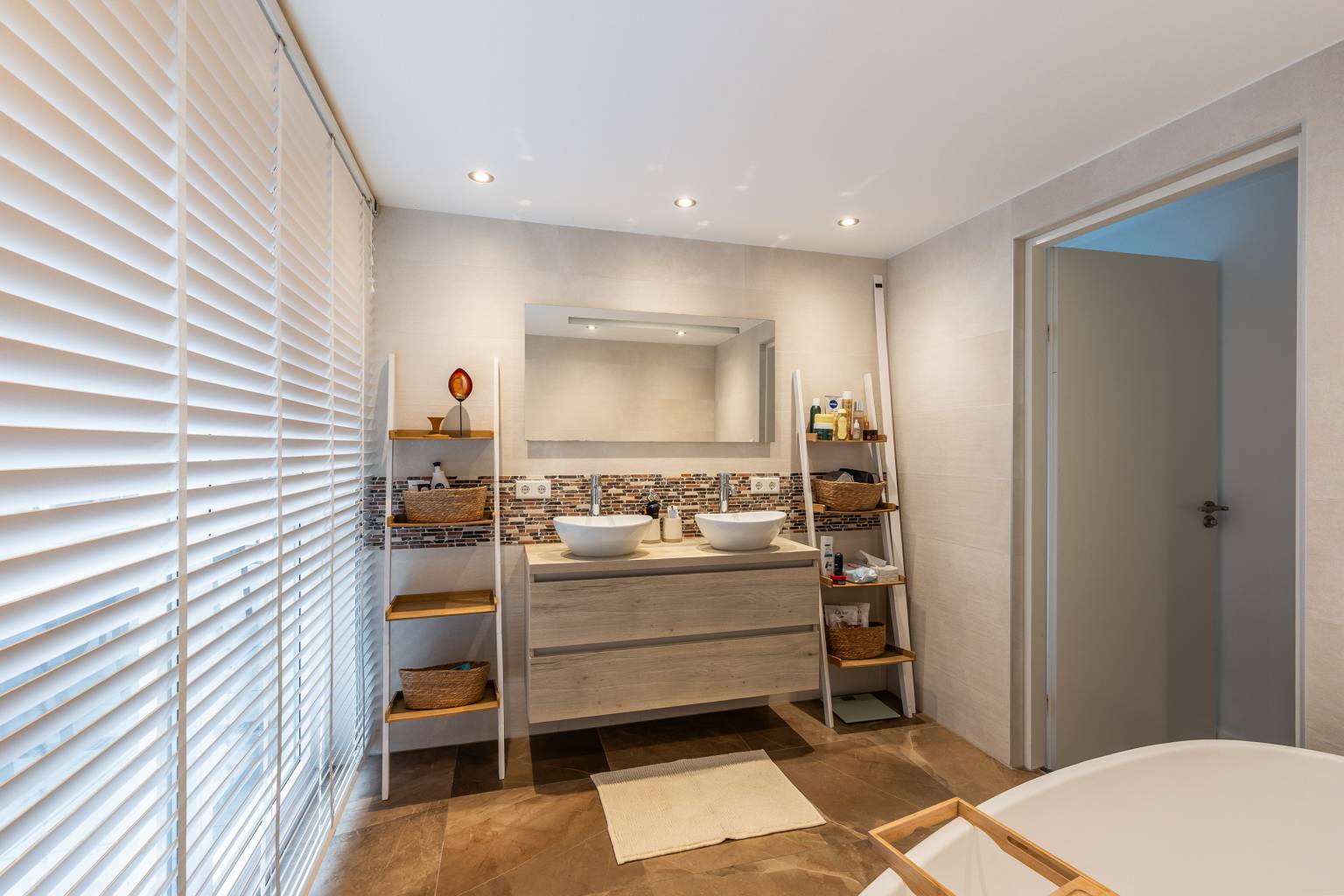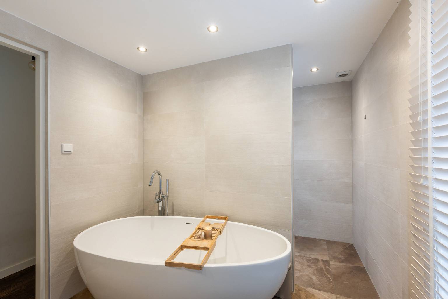 De luxe badkamer is volledig betegeld en uitgerust met een vrijstaand bad, een inloopdouche en een wastafelmeubel dat is voorzien van twee waskommen met daarboven een spiegel met verlichting. Het plafond is voorzien van inbouw spots en er is een groot te openen raam aanwezig.