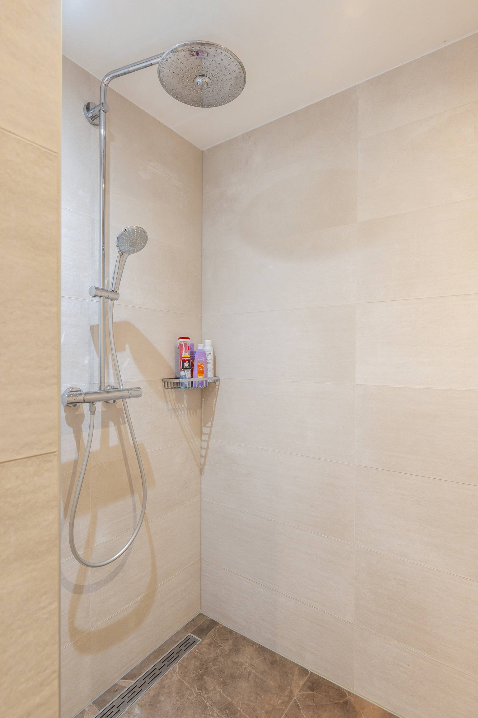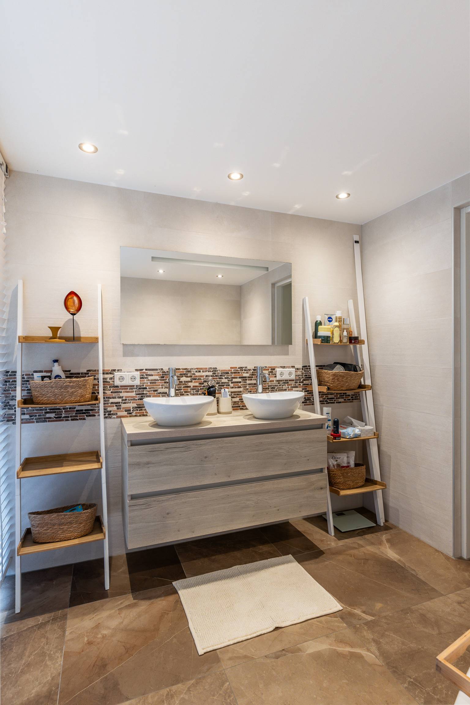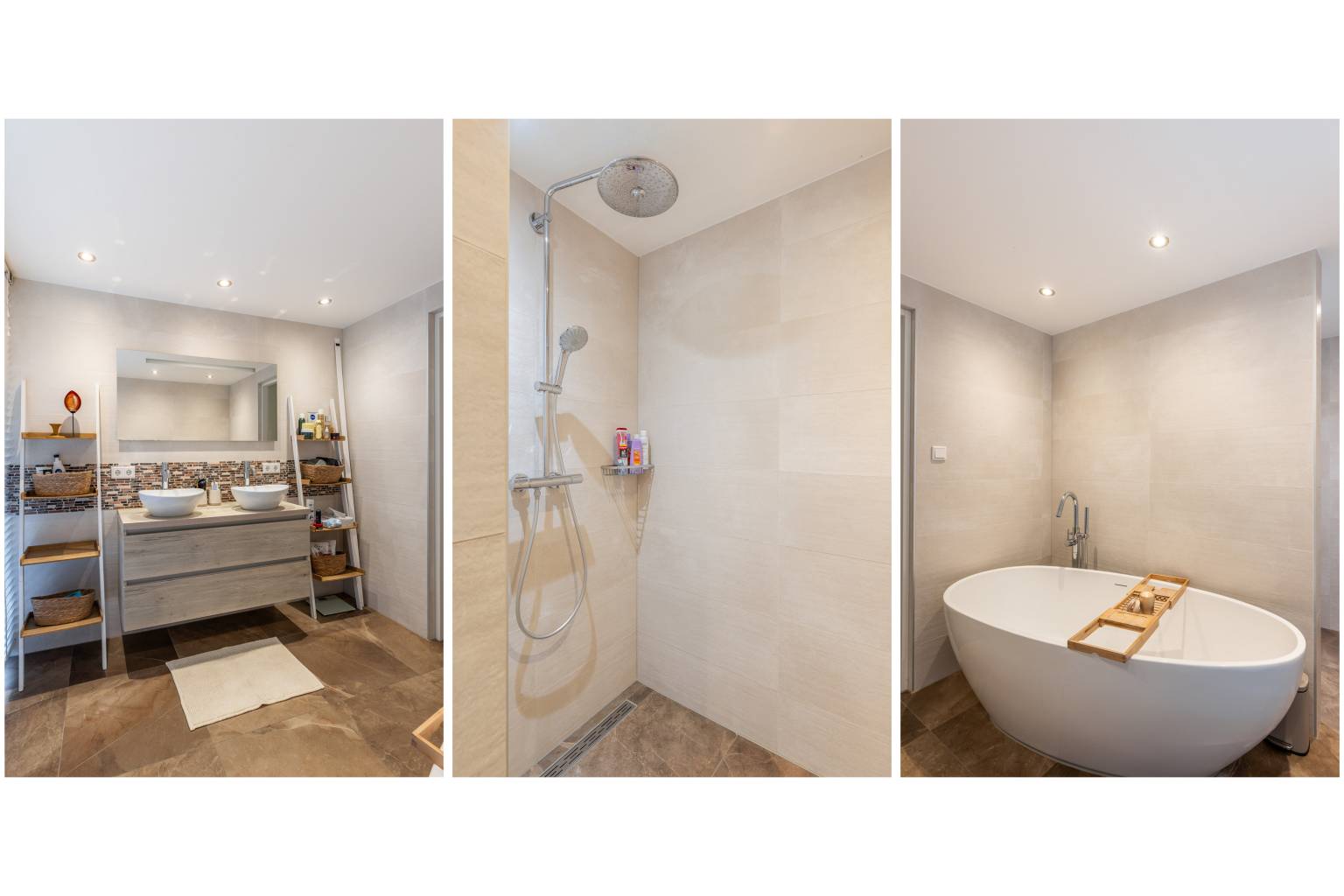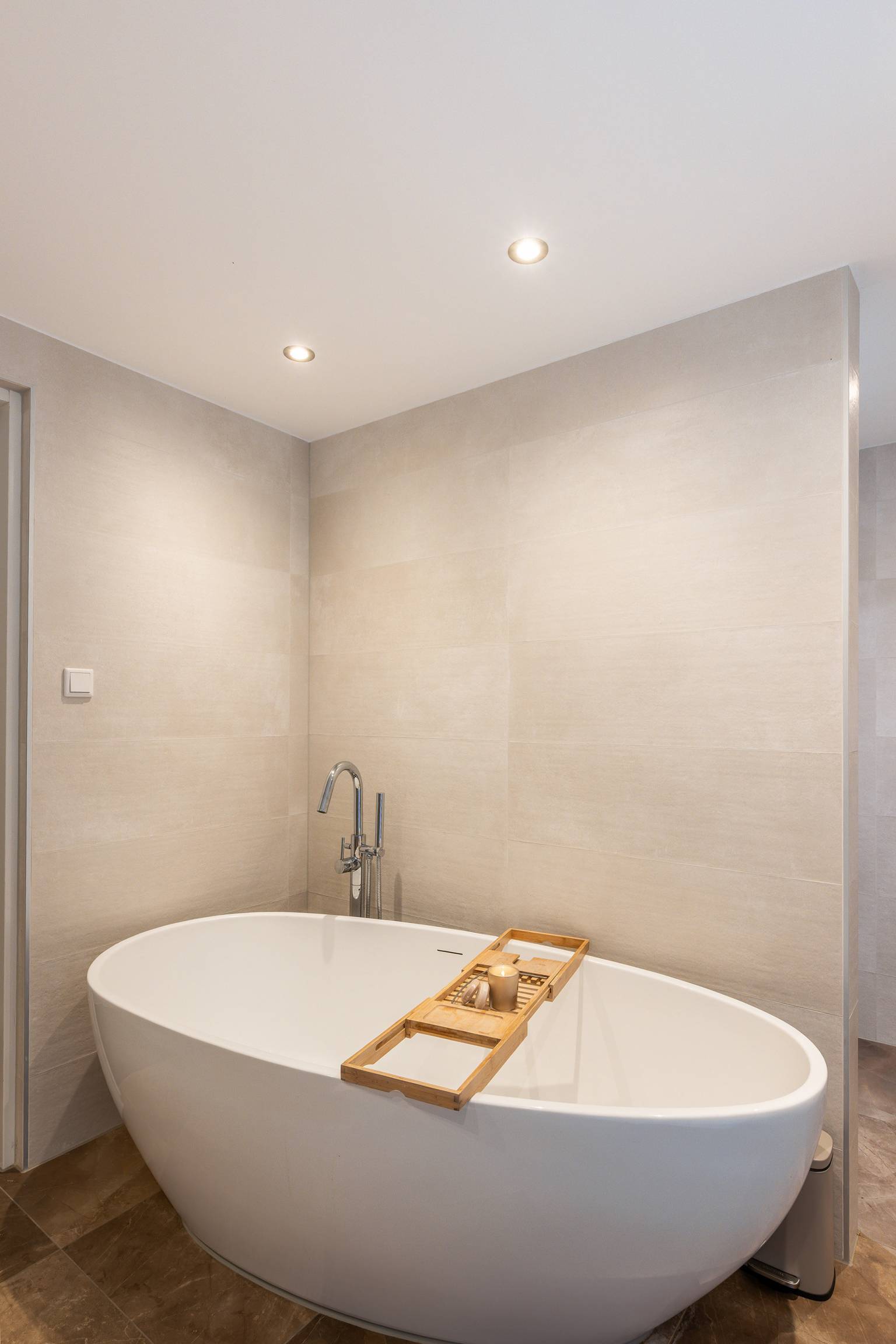 De luxe badkamer is volledig betegeld en uitgerust met een vrijstaand bad, een inloopdouche en een wastafelmeubel dat is voorzien van twee waskommen met daarboven een spiegel met verlichting. Het plafond is voorzien van inbouw spots en er is een groot te openen raam aanwezig.