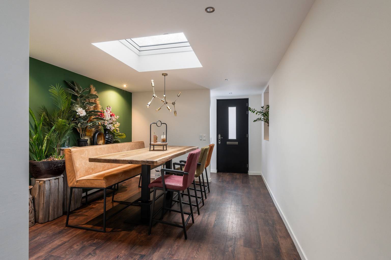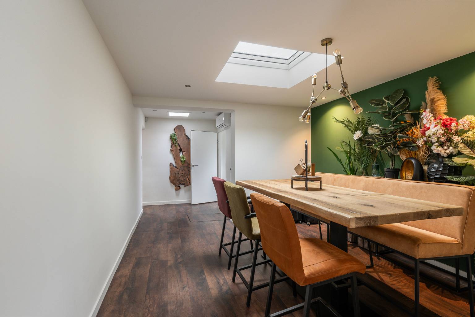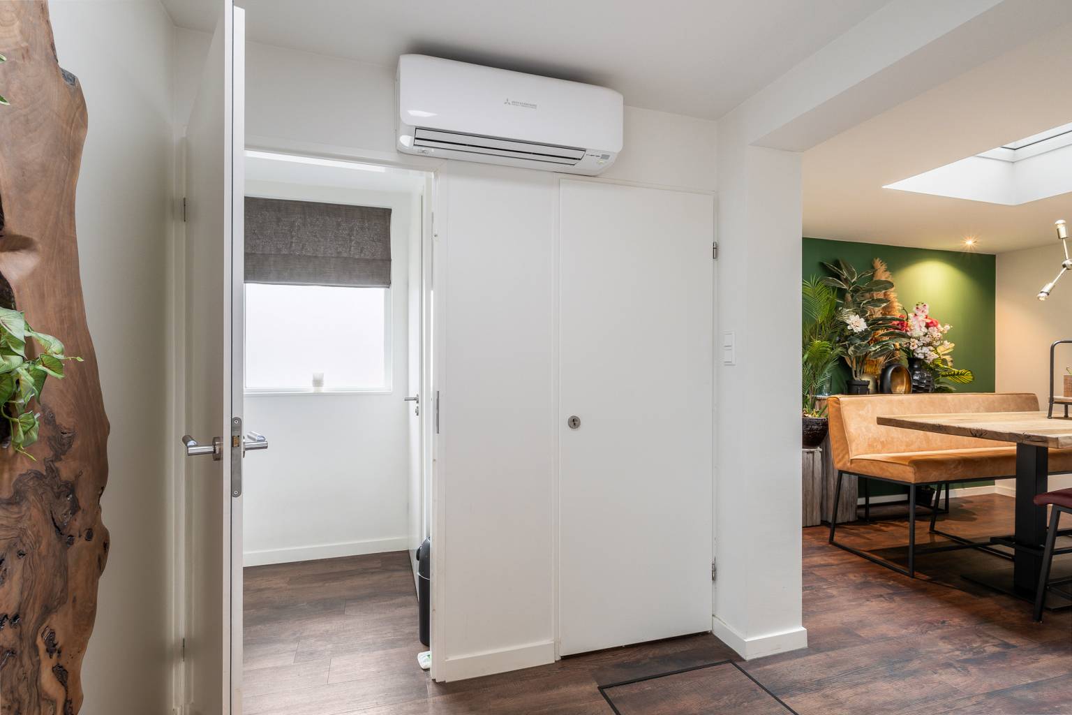 De eetkamer is inpandig gelegen, maar het elektrische daklicht met regensensor zorgt voor daglichttoetreding. In het verlengde is er een open verbindingsruimte die eveneens beschikt over een daklicht, maar ook is voorzien van de meterkast en airconditioning. Vanuit hier is er toegang tot de tussenhal en er is een open verbinding naar de keuken.