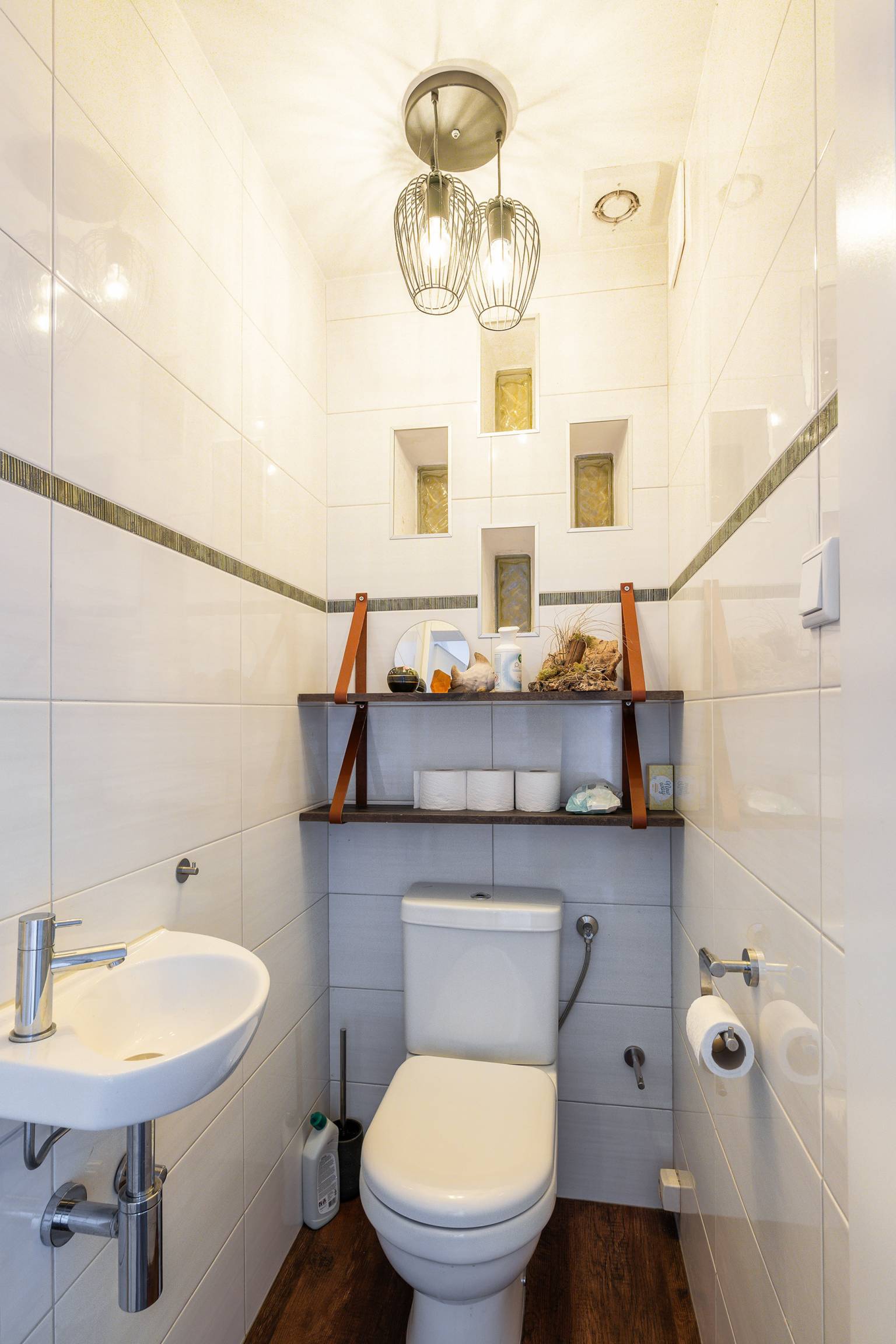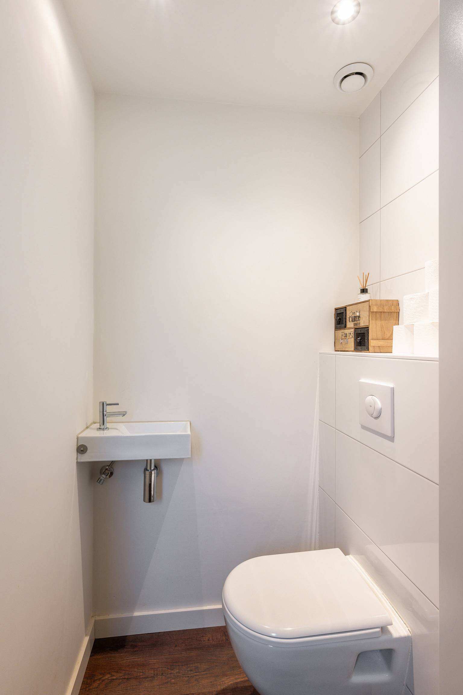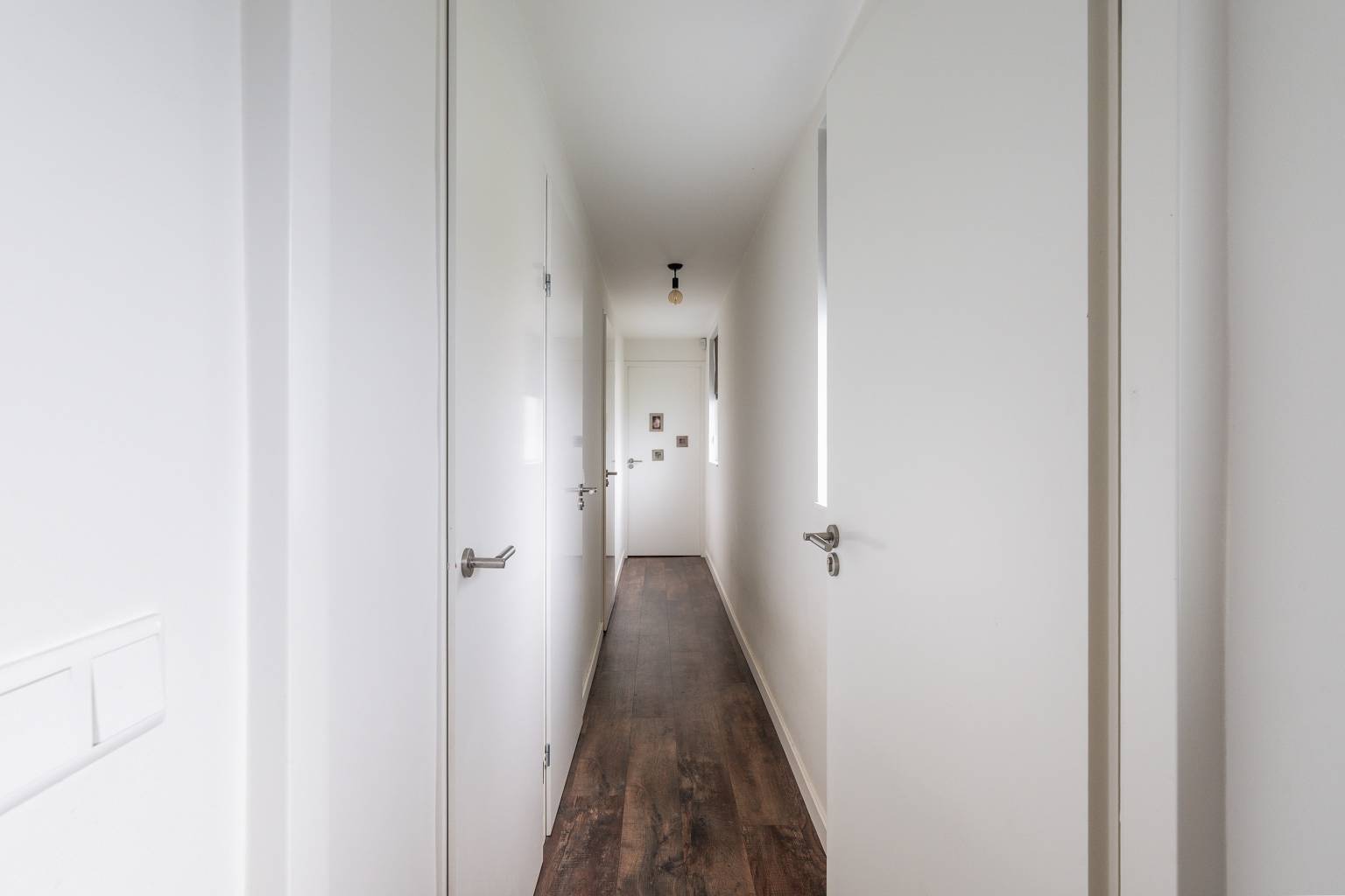 De tussenhal geeft toegang tot het volledig betegelde toilet en is de verbinding naar de aansluitende hal, die toegang geeft tot de werk/slaapkamer, de badkamer, het tweede toilet en de inpandige berging met de wasmachine aansluiting.