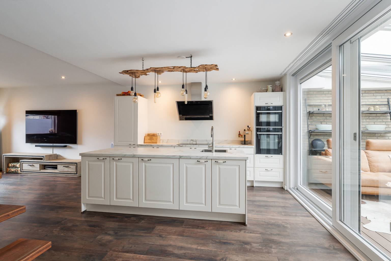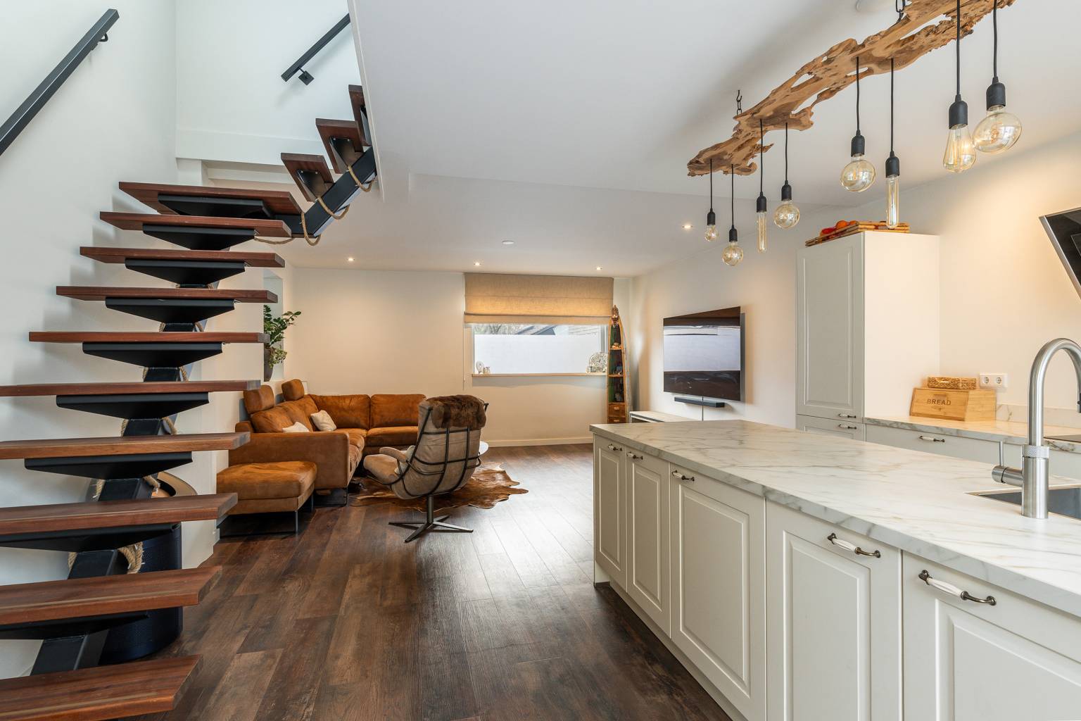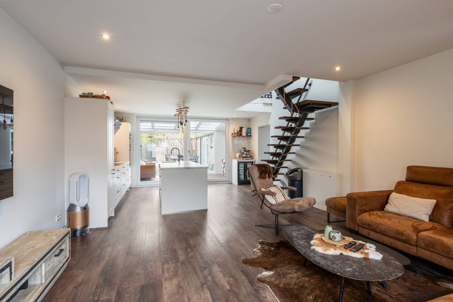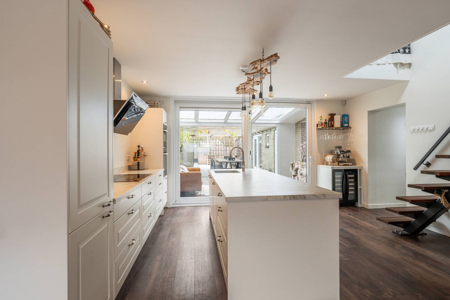 De open keuken is ruim van opzet en beschikt over een recht keukenblok tegen de wand en een vrijstaand eiland. Er is naast voldoende kastruimte ook diverse apparatuur aanwezig, zoals een combi magnetron/oven, een combi oven met stoomfunctie, een vaatwasser, een kookplaat, een afzuigkap, een koelkast, een vriezer en een separaat geplaatste wijnkoeler met twee aparte zones voor temperatuur. Vanuit de keuken is er een grote schuifpui naar de serre en de open trap geeft toegang tot de verdieping. De keuken loopt naar de voorzijde over in de woonkamer, waar voldoende ruimte is voor een gezellige zithoek. Het raam geeft een fijn zicht over de straat en het plafond is voorzien van inbouw spots.
