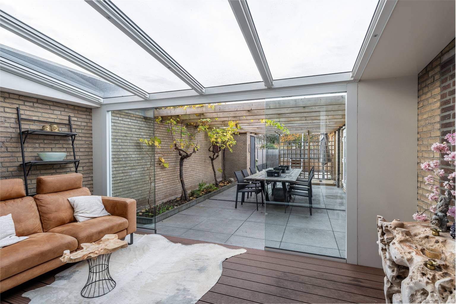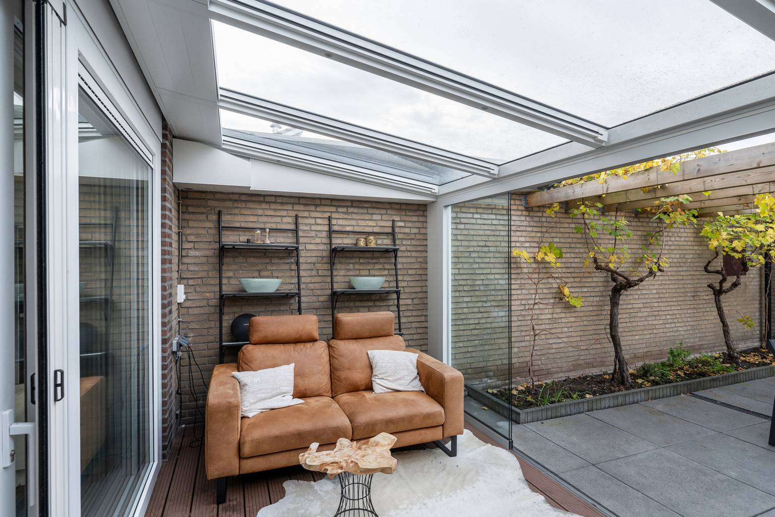 De serre is gebouwd tegen de buitengevel, waarbij het dak is voorzien van glazen panelen met een elektrisch zonnescherm. De glazen schuifdeuren zorgen ervoor dat de serre kan worden afgesloten van buiten, maar dat het zicht over de tuin behouden blijft. Er zijn stopcontacten aanwezig voor elektra en de ondergrond is voorzien van vlonderplanken.
