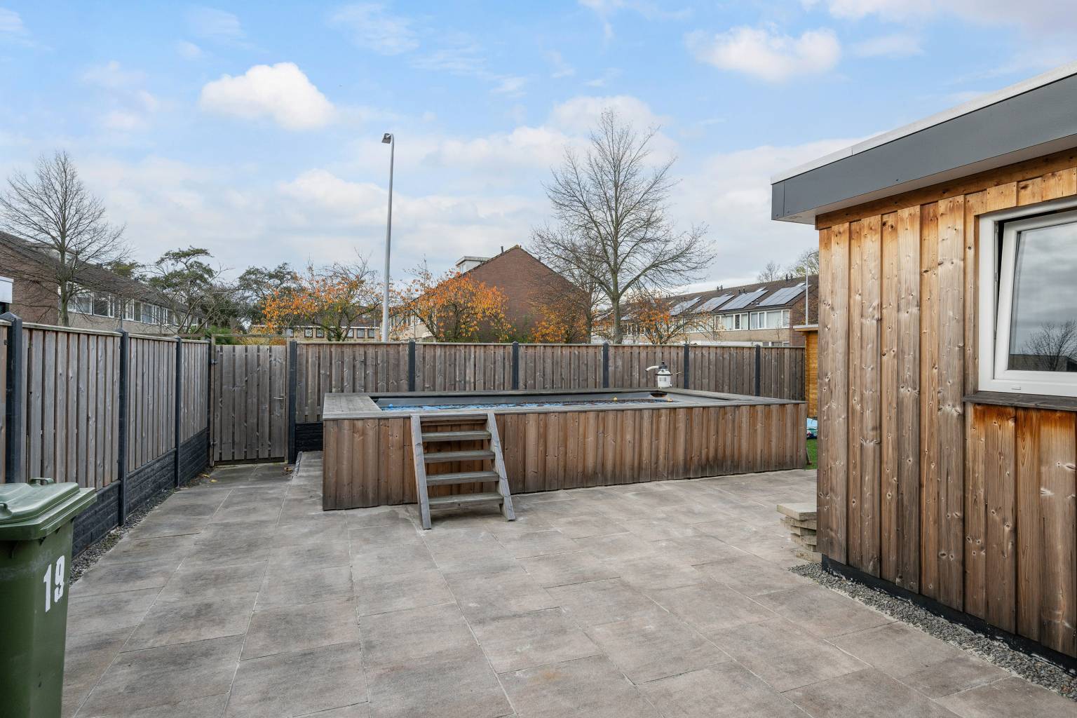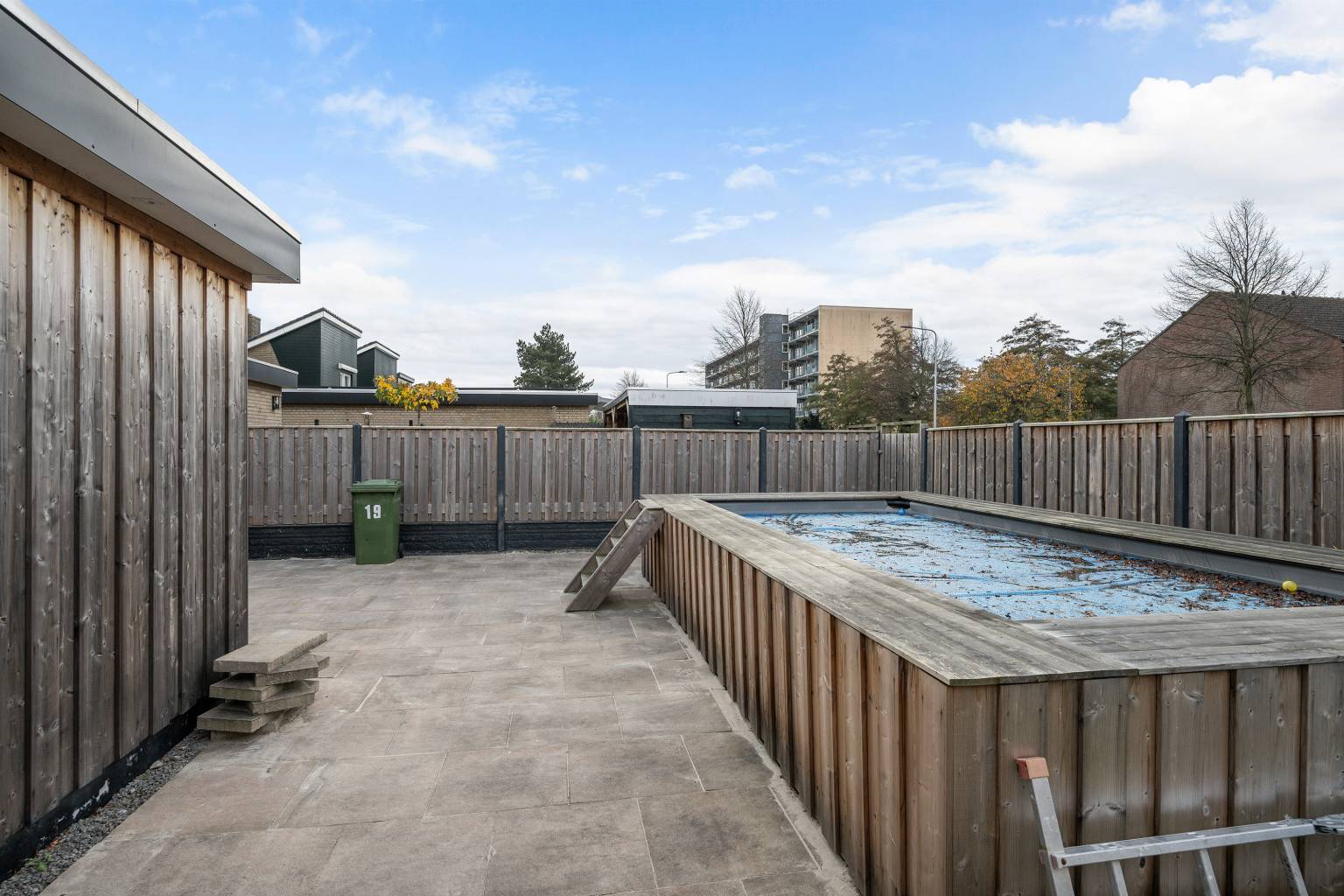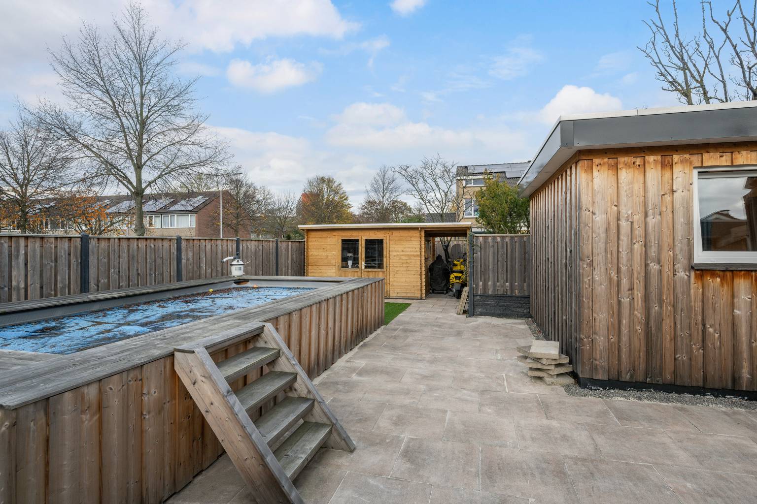 De riante achtertuin is opgedeeld in zones. Zo is er in het verlengde van de serre een groot betegeld terras met een stenen border met beplanting en een houten pergola. Aan de gevel hangt een waterkraantje en er staat een kleine stenen berging. Het achterste gedeelte van de tuin is eveneens voorzien van tegels en is volledig omheind door een houten schutting met een achteruitgang. Er staat een groot verhoogd zwembad, dat rondom met hout is afgewerkt en er ligt een stukje kunstgras. Daarnaast staat er nog een houten schutting met een overkapping, die is voorzien van verlichting en elektra.