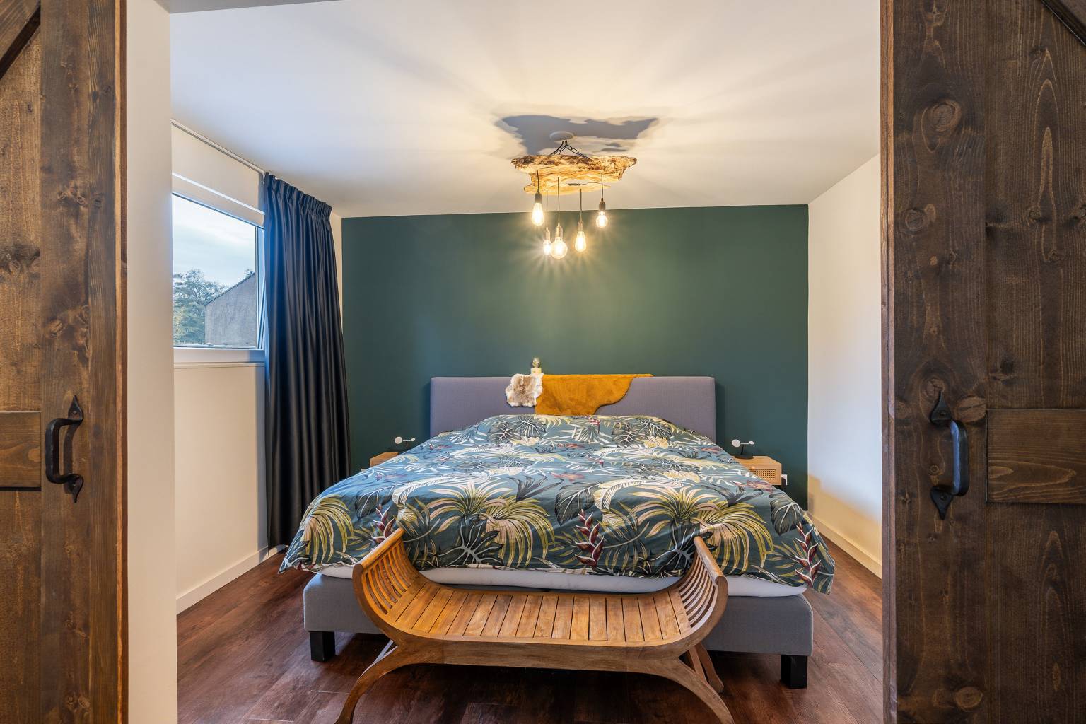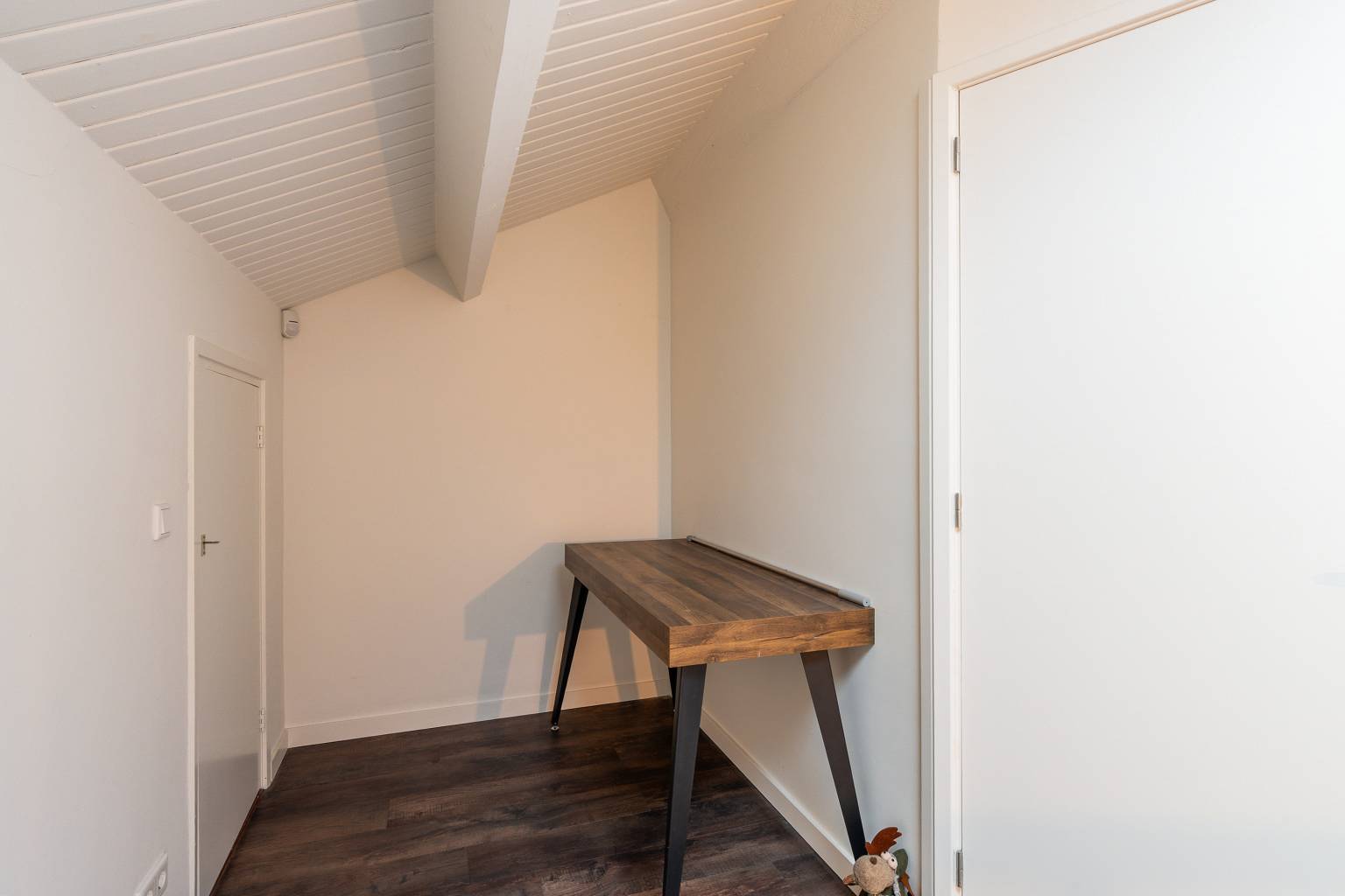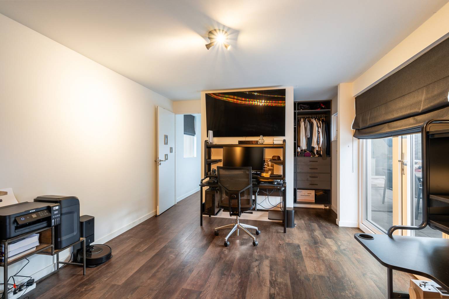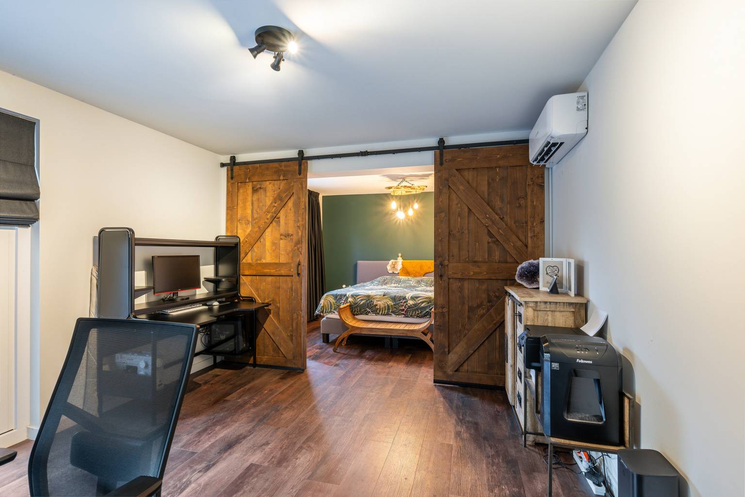 De werk/slaapkamer is doormiddel van houten schuifdeuren opgedeeld in twee ruimtes. Zo is het slaapgedeelte fijn gescheiden van de werkkamer. Er is een inloopkast aanwezig en de openslaande deuren geven toegang tot de tuin.