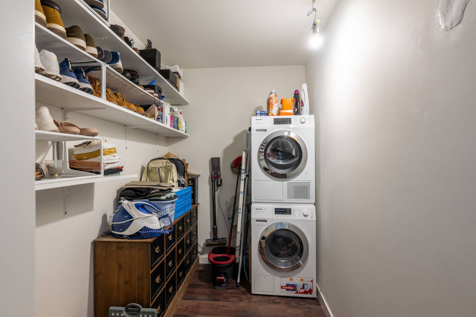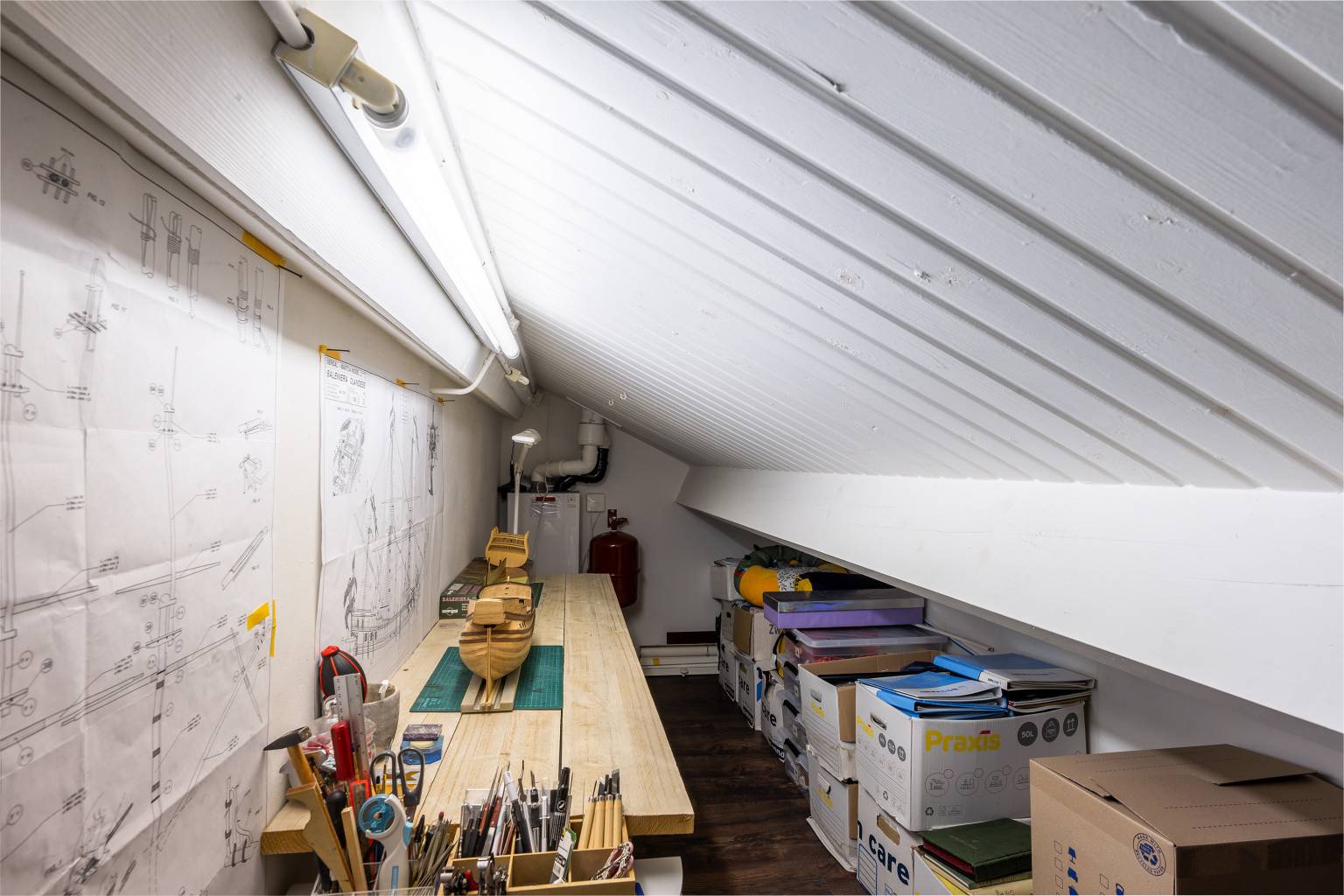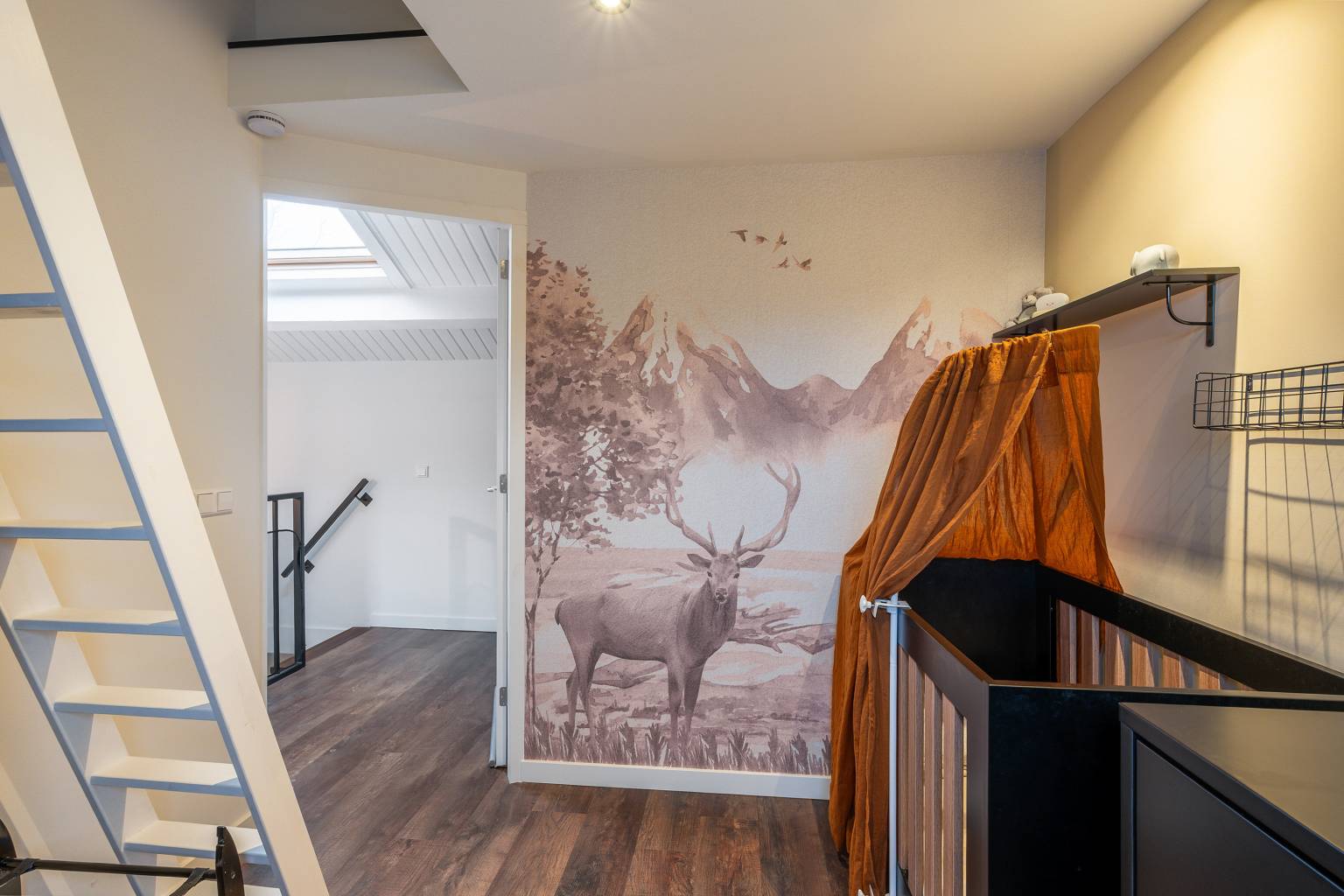 De handige extra berging onder de schuine kap is voorzien van verlichting en kan handige gebruikt worden voor het opbergen van spullen, maar ook als hobbyruimte. In deze ruimte hangt tevens de opstelling van de Cv-ketel.