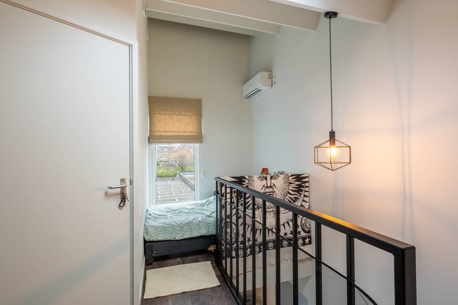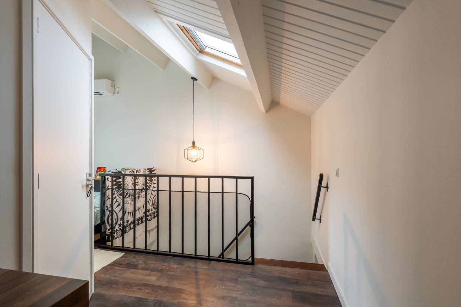 Na de trapopgang is de overloop bereikbaar. Deze biedt voldoende ruimte voor het plaatsen van een extra bed en een bureau en er hangt airconditioning. Vanaf de overloop is er toegang tot de tweede slaapkamer en de berging onder de schuine kap. Ook op deze verdieping zijn de wanden gestuukt en ligt er een PVC vloer.