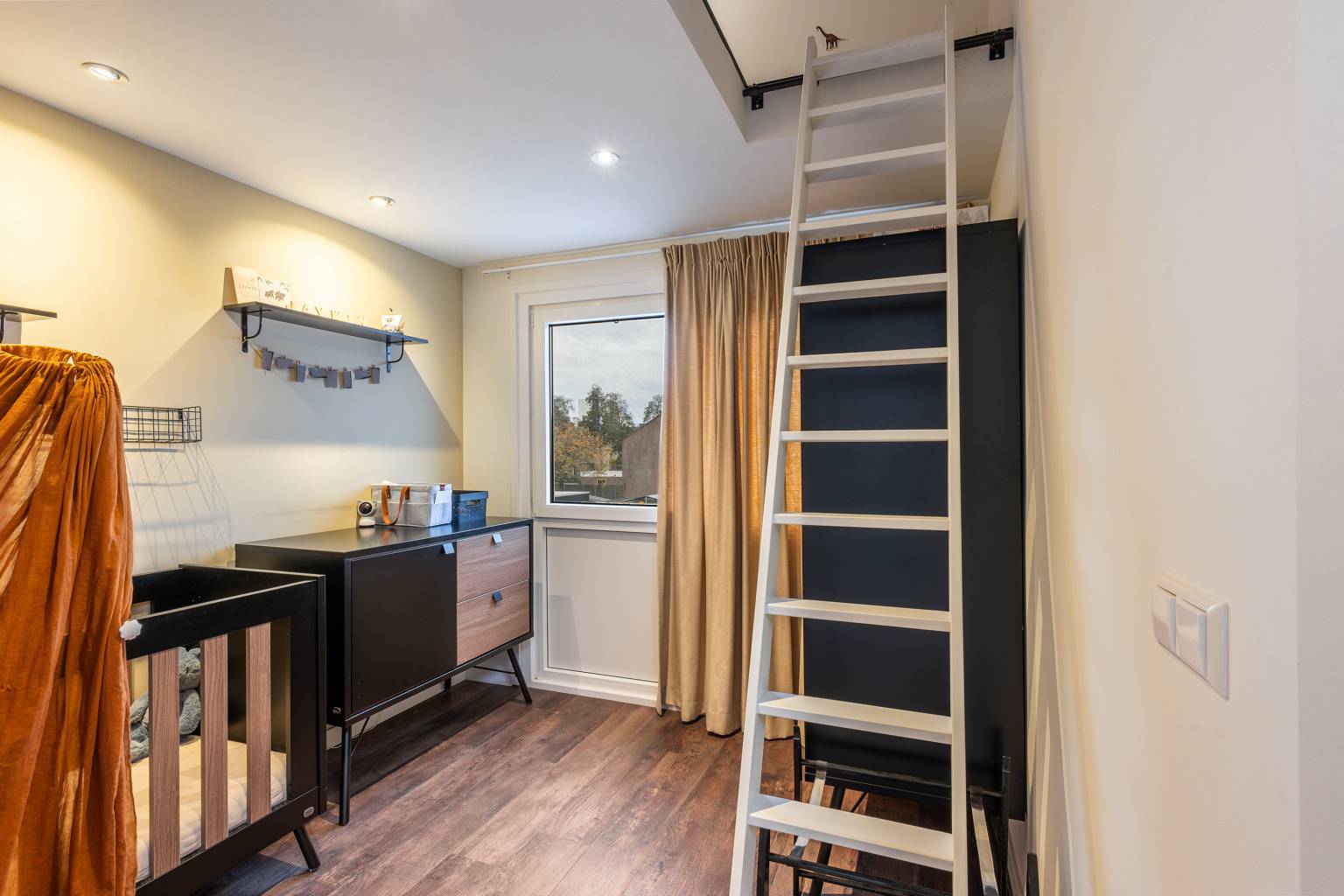 De tweede slaapkamer is gelegen aan de achterzijde is voorzien van een trap naar de open vliering met verlichting en elektra. Een wand is hier behangen en het plafond is voorzien van inbouw spots.