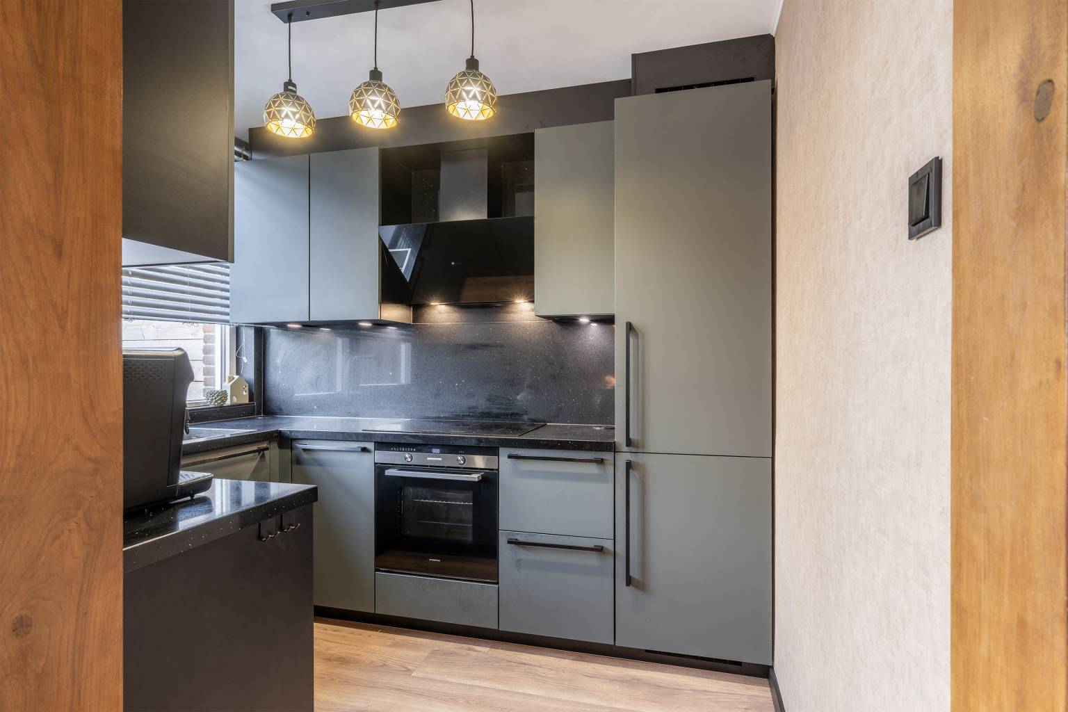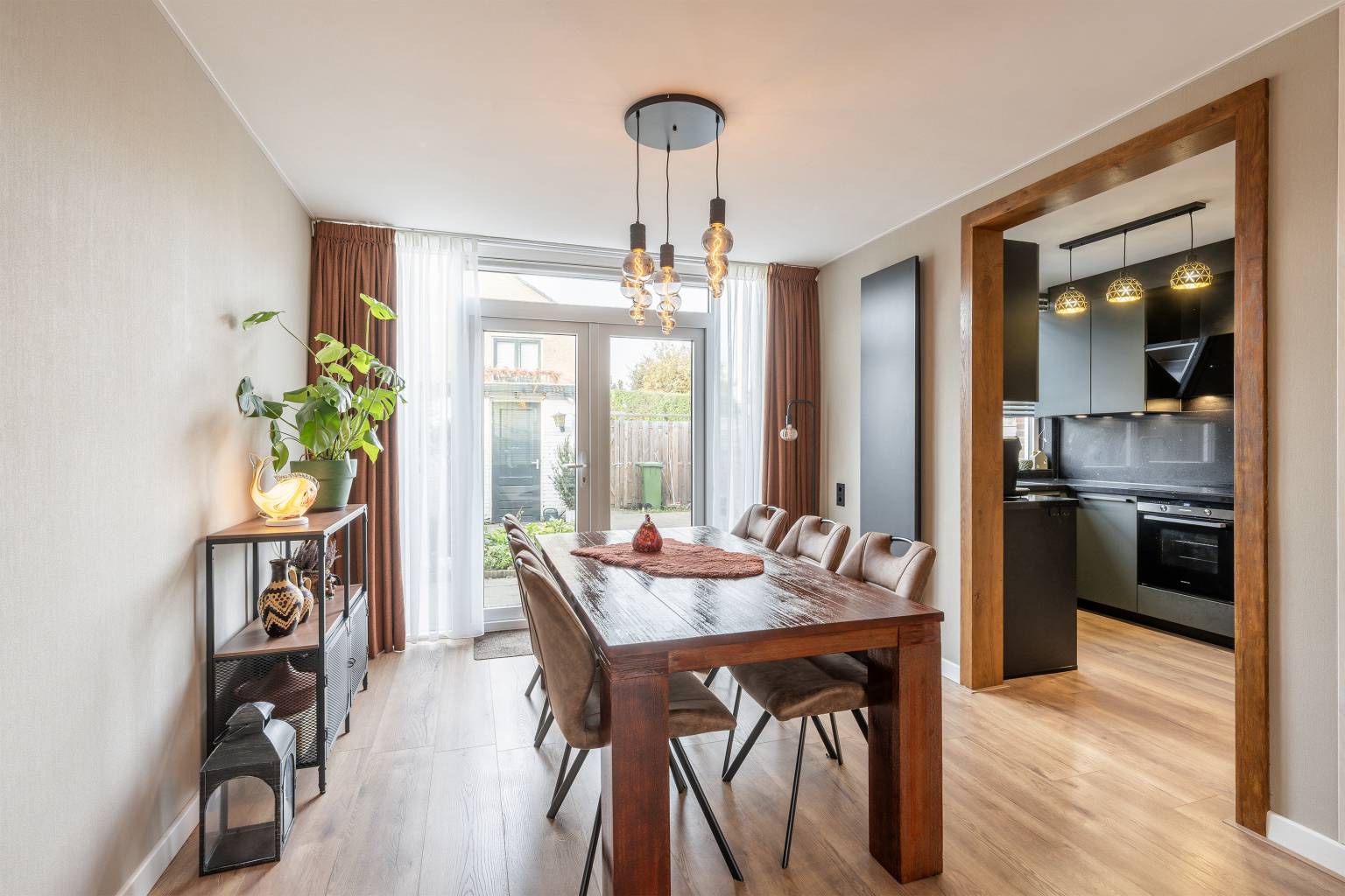 De woonkamer is gesitueerd aan de voorzijde en beschikt over een erker met een brede vensterbank. Er hangen plaatradiatoren tegen de wanden die zijn behangen en het akoestische paneel zorgt voor een extra detail. In het verlengde, naar de achterzijde, is er plaats voor een eethoek en geven de openslaande deuren toegang tot de achtertuin. Ook is er via een houten toog toegang tot de keuken. Deze is opgesteld in een verlengde U-vorm en beschikt over diverse inbouwapparatuur, waaronder een vaatwasser, een oven, een koel-/vriescombinatie, een quooker, een inductiekookplaat en een afzuigkap. Daarnaast is er een close-in boiler aanwezig en zijn de bovenkasten voorzien van verlichting. Het aanrechtblad loopt door naar de achterwand en zijn er stopcontacten in verwerkt.
