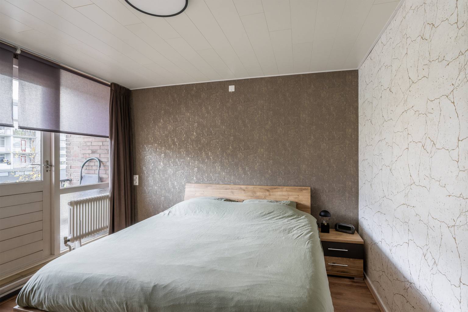 De hoofdslaapkamer is gelegen aan de voorzijde en beschikt naast twee vaste kasten ook over een deur naar het balkon. De wanden zijn hier behangen en de vloer is voorzien van laminaat.