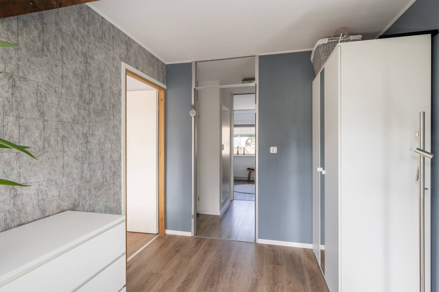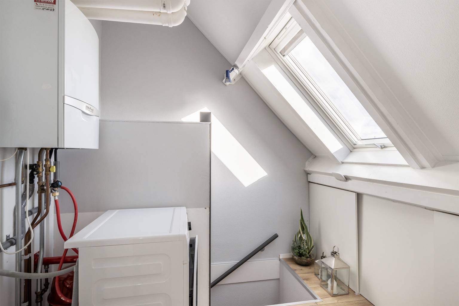 Na de trapopgang is er toegang tot de 2e overloop. Hier bevindt zich de aansluiting van de wasmachine en de opstelling van de Cv-ketel. In de schuine kap is een dakraam met zonwering geplaatst en onder de schuine kap zijn knieschotten aanwezig. Op de vloer ligt laminaat, de wanden zijn gesausd en er is vanaf hier toegang tot de vierde slaapkamer.