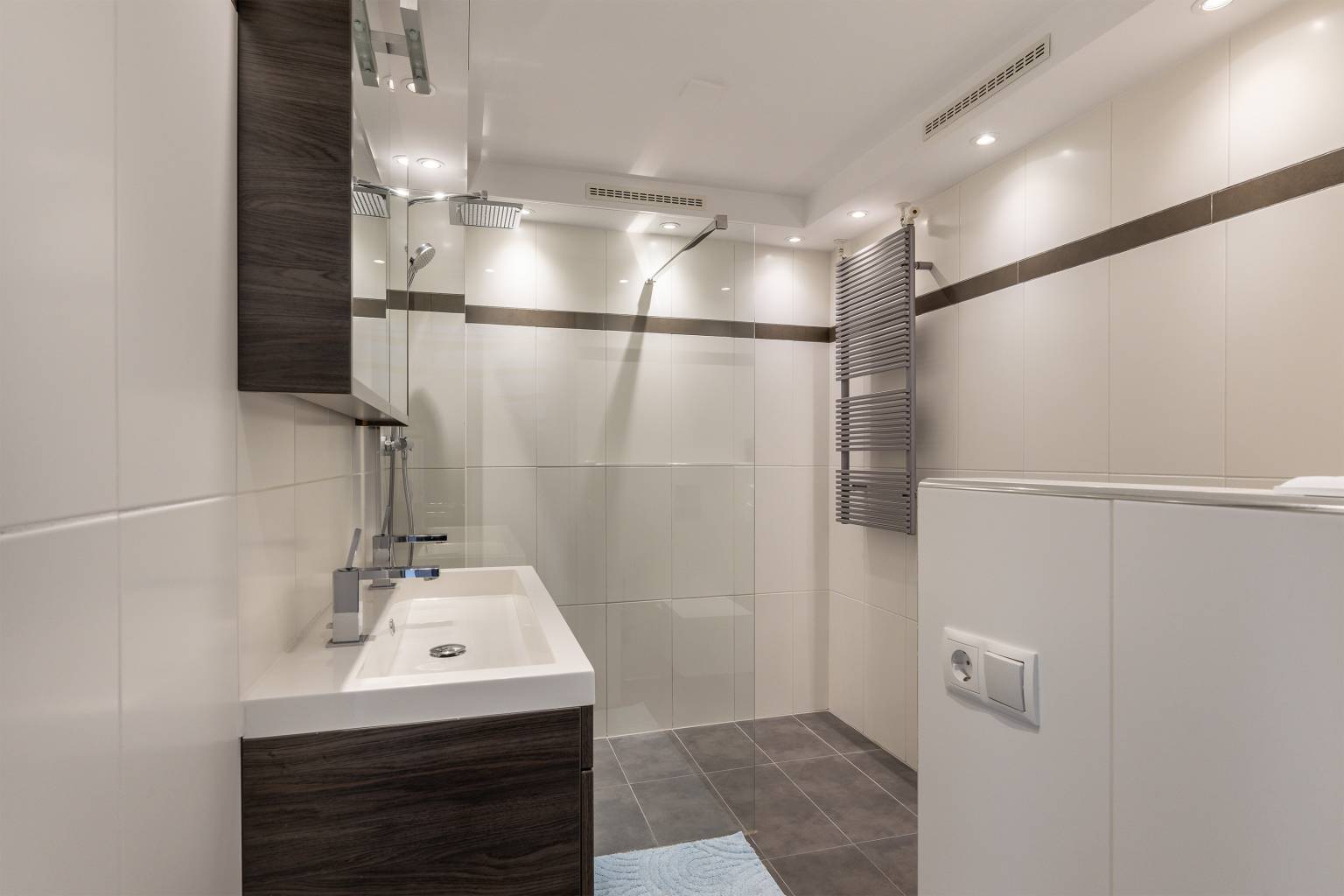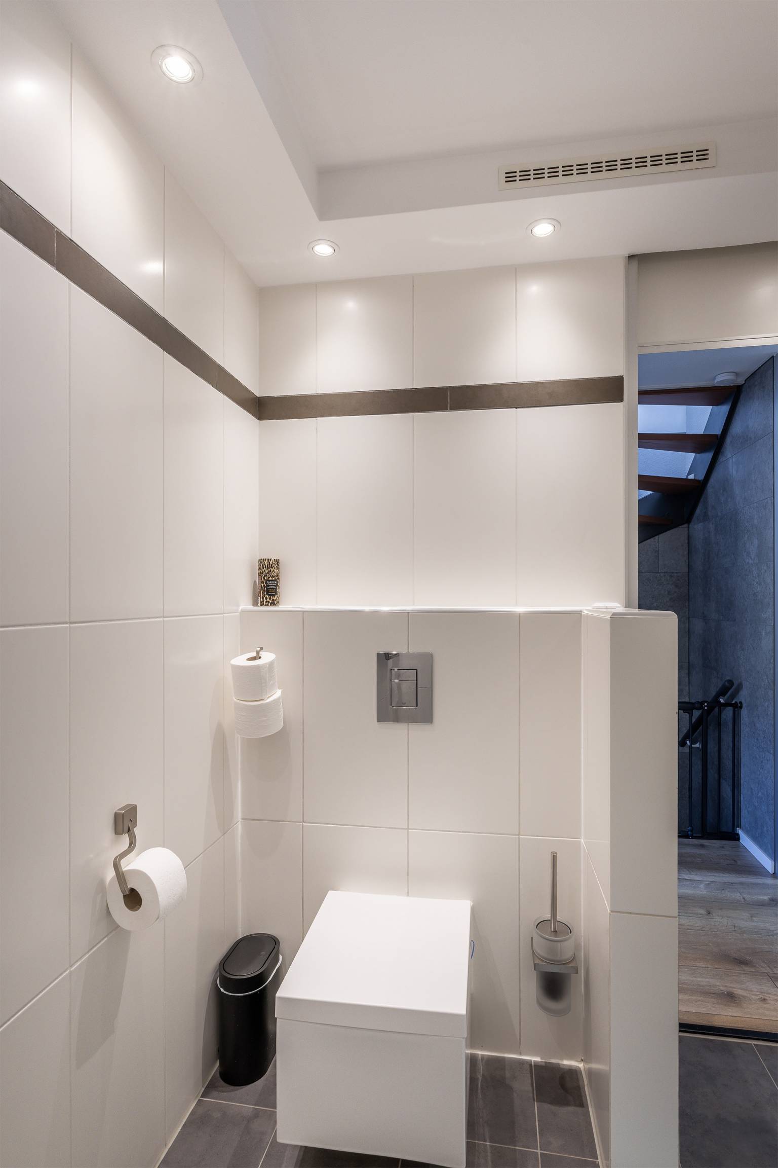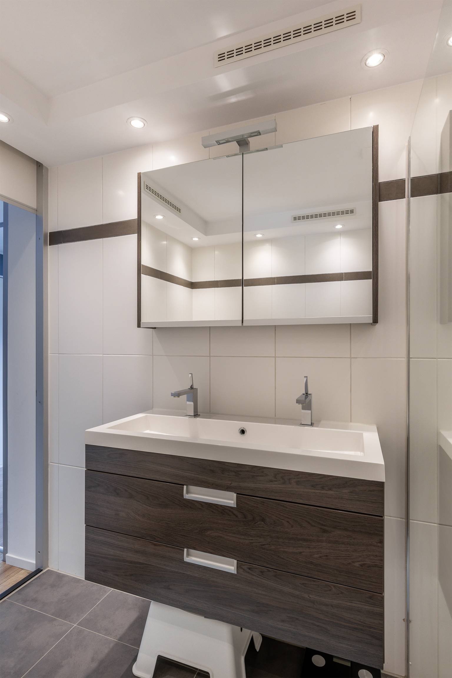 De inpandige badkamer is volledig betegeld en compleet uitgerust met een inloopdouche, een zwevend toilet en een dubbel wastafelmeubel met daarboven een spiegelkast met verlichting. Langs het plafond is een koof gemaakt met inbouw spots en er hangt een handdoeken radiator.