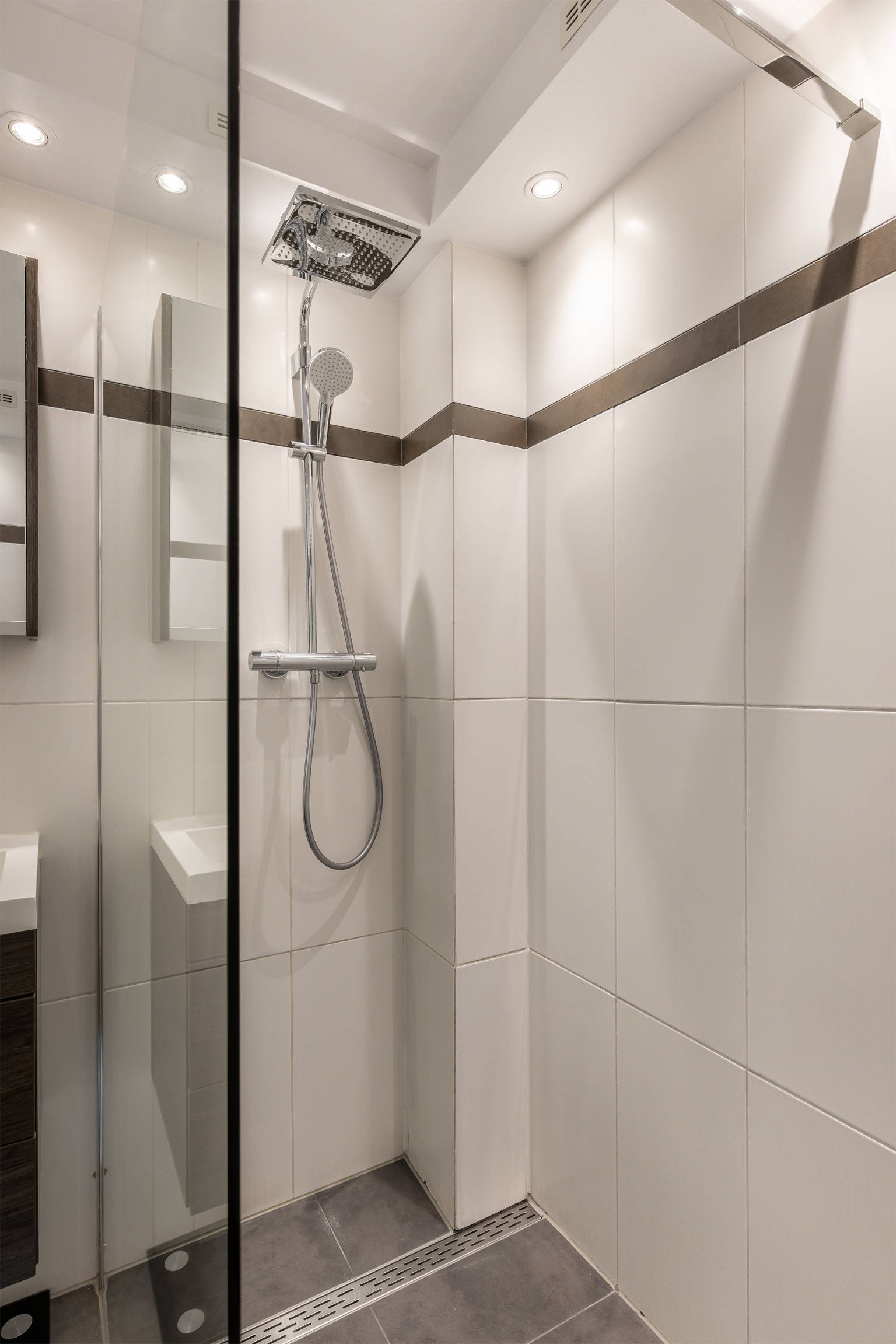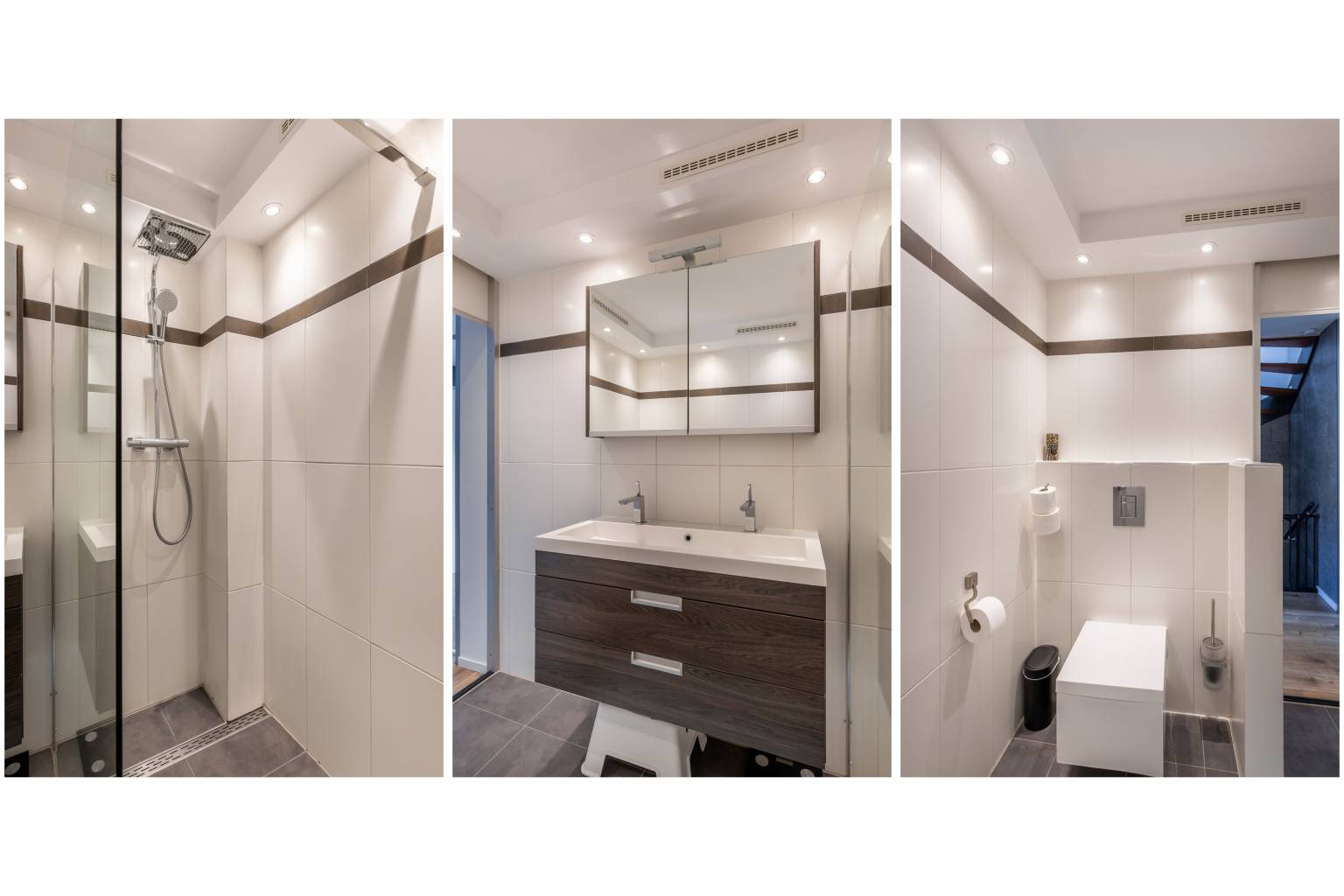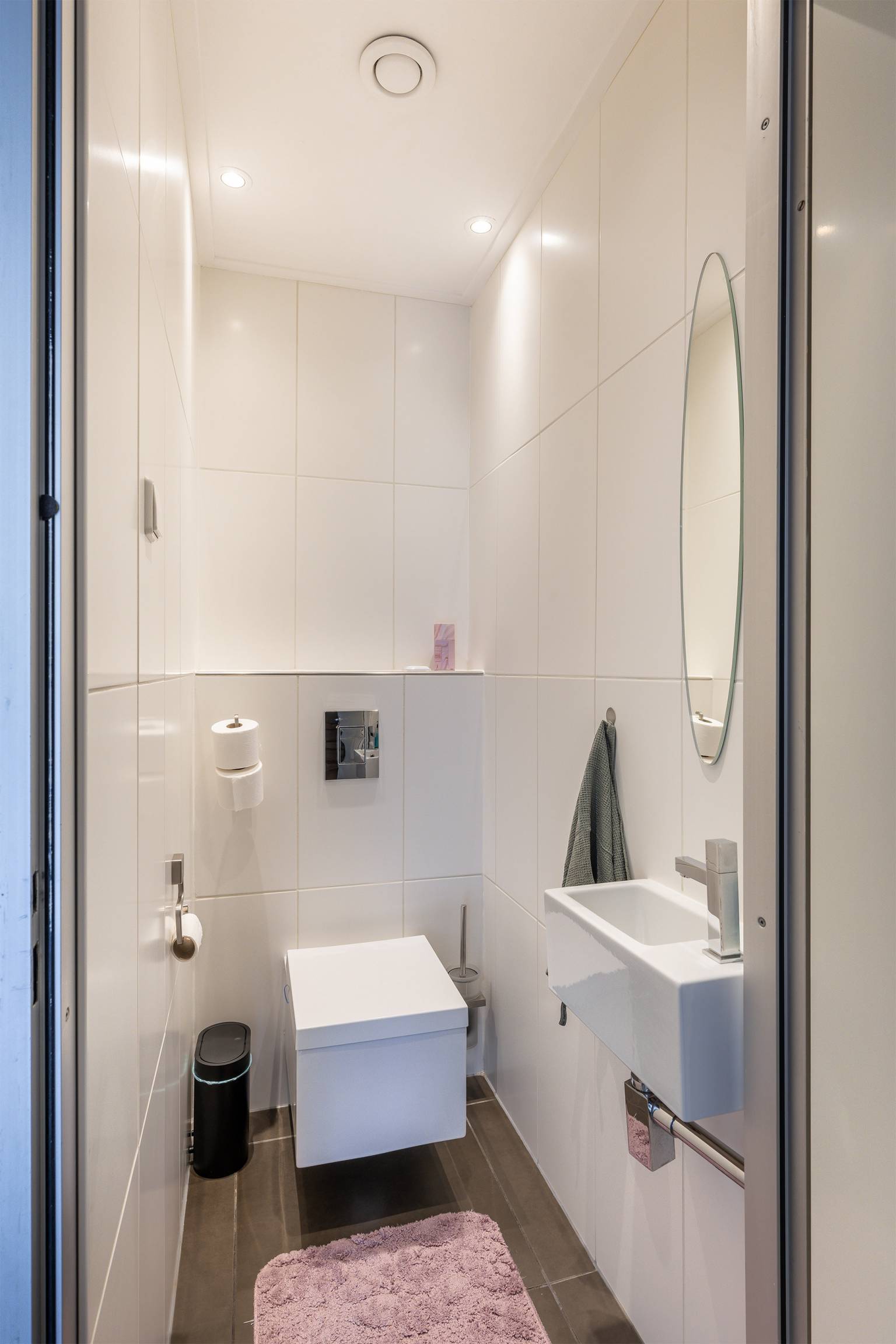 De inpandige badkamer is volledig betegeld en compleet uitgerust met een inloopdouche, een zwevend toilet en een dubbel wastafelmeubel met daarboven een spiegelkast met verlichting. Langs het plafond is een koof gemaakt met inbouw spots en er hangt een handdoeken radiator.