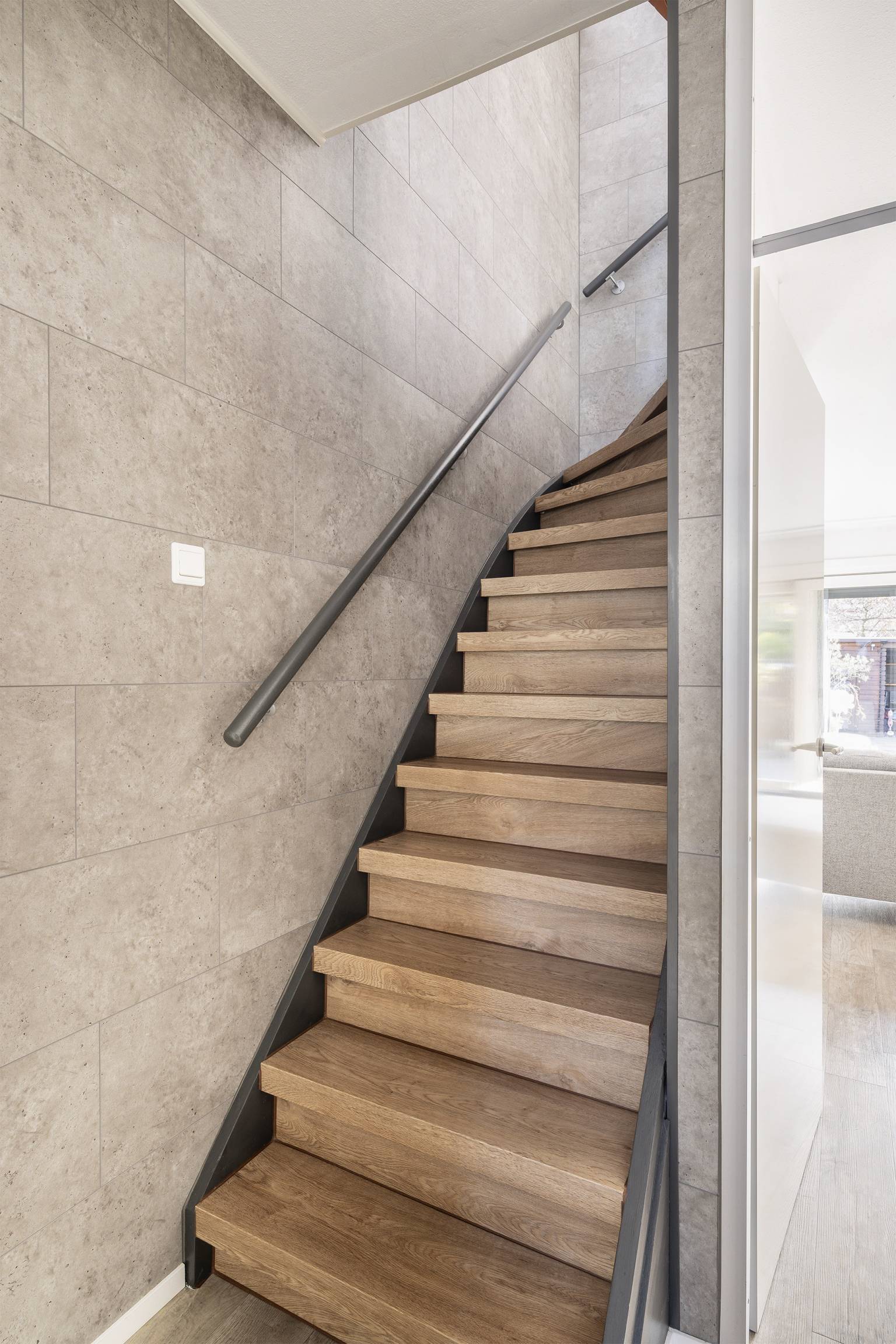 Na de voordeur is er een binnenkomst in de afsluitbare entreehal, waarbij de wanden deels zijn behangen en deels zijn afgewerkt met stucwerk. Op de vloer ligt een PVC vloer, die is doorgetrokken naar de woonkamer met open keuken en in de hal bevindt zich de trap naar de 1e verdieping, de meterkast, een grote vaste kast met schuifdeuren en het volledig betegelde toilet, dat is voorzien van een zwevend toilet, een fonteintje en inbouw spots.