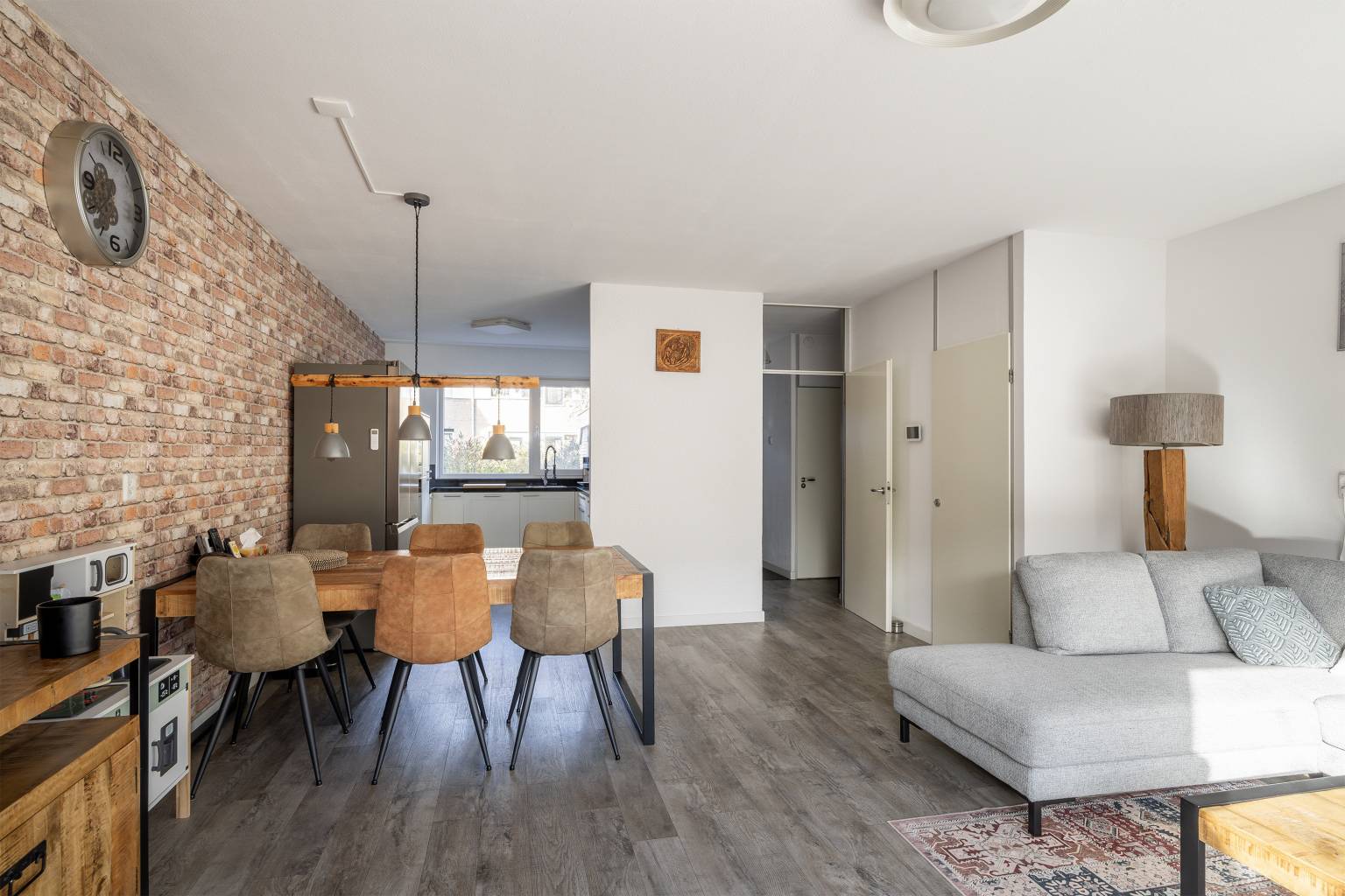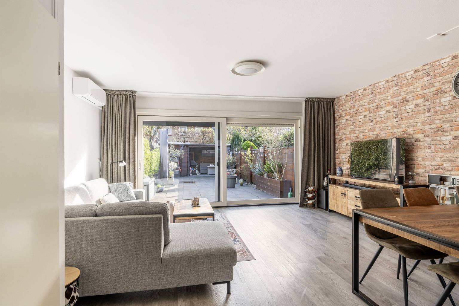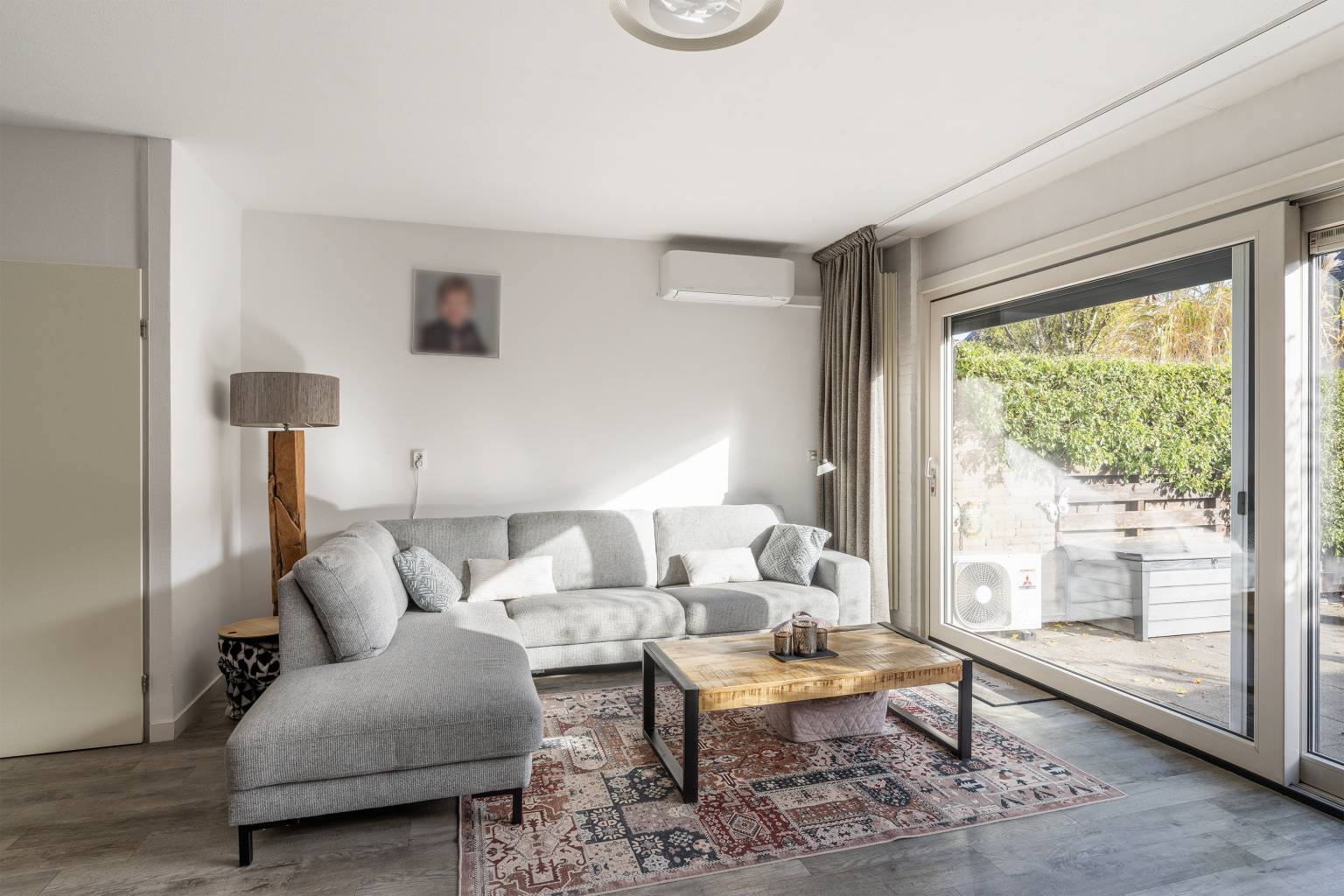 De woonkamer is gesitueerd aan de achterzijde en heeft via een grote schuifpui toegang tot de achtertuin. Er is een vaste kast aanwezig en er hangt airconditioning. De wanden zijn deels gesausd en behangen en aan de voorzijde bevindt zich de open keuken.