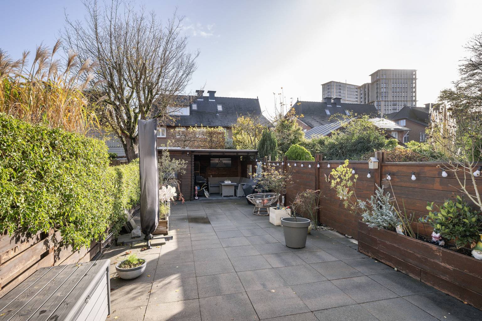 De diepe achtertuin is volledig voorzien van tegels en omheind door een houten schutting. Achterin de tuin staat een houten berging met een overkapping en aan de gevel hangt een rolluik.