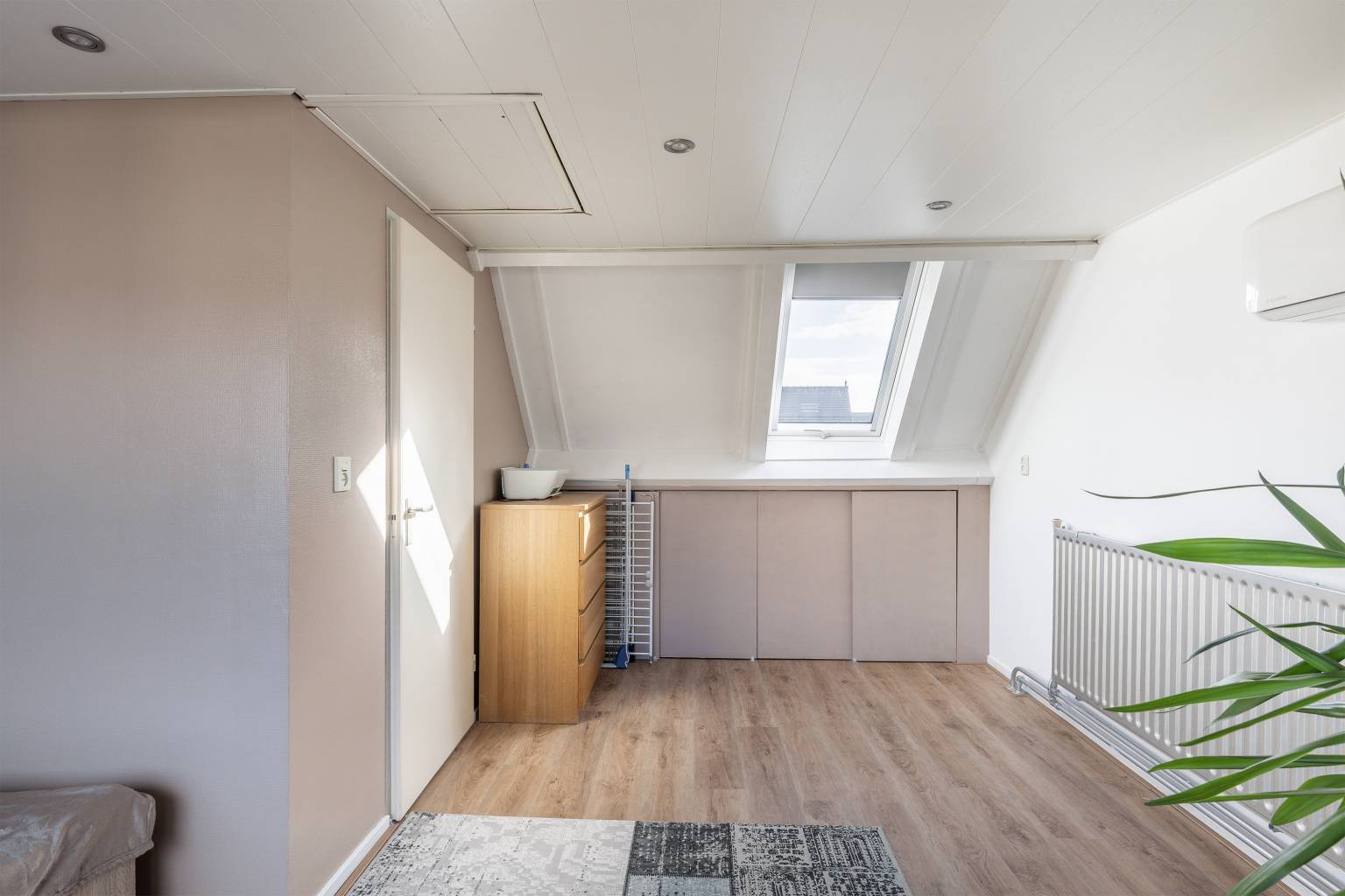 De vierde slaapkamer beschikt eveneens over een dakkapel, een dakraam met zonwering in de schuine kap en er zijn knieschotten aanwezig. Het plafond is voorzien van inbouw spots en er is een luik naar de vliering. Op de vloer ligt laminaat, de wanden zijn afgewerkt met glasweefselbehang en er is airconditioning aanwezig.