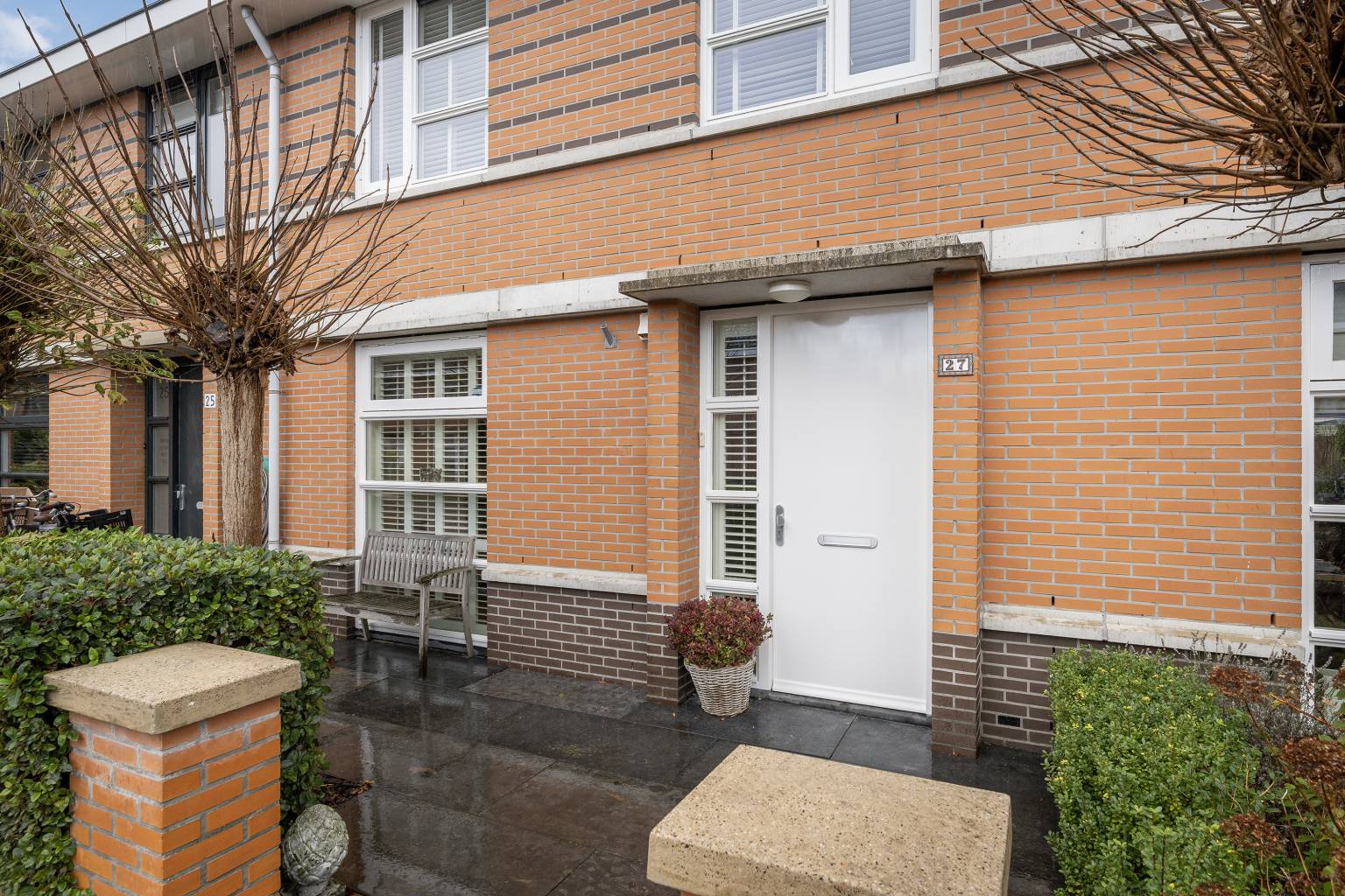 Vanaf de straat is er een open toegang tot de bestrate voortuin. Er is een lage stenen muur als afscheiding, die is onderbroken door een groene haag. De zijborder is voorzien van beplanting, er staat een kleine boom in de tuin en vanuit hier is de voordeur bereikbaar.