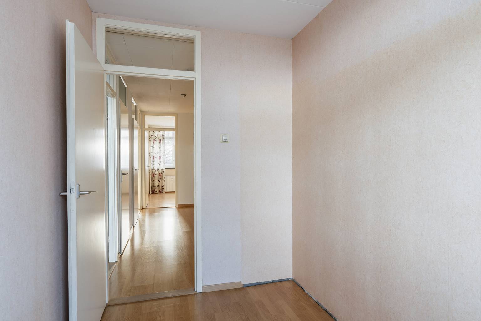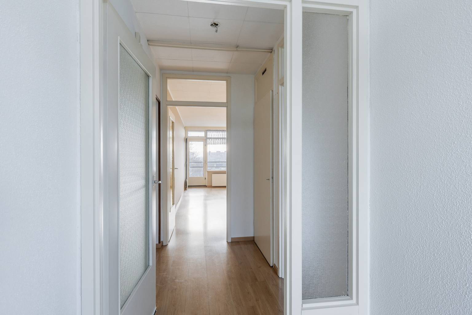 Via de vestibule is er toegang tot de woning. De ruime hal is voorzien van de meterkast, toegangsdeuren naar alle vertrekken van het appartement en de toiletruimte met fonteintje. De lichte woonkamer is aan de achterzijde gelegen en beschikt over een groot raam met deur naar het balkon en een ruime inbouwkast. De aparte keuken is gelegen aan de voorzijde en is voorzien van de geiser en een ruime bergkast. De vier slaapkamers zijn allen bereikbaar via de ruime hal. Twee slaapkamers zijn gelegen aan de achterzijde en twee slaapkamers zijn gelegen aan de voorzijde. De betegelde badkamer is voorzien van een wastafel, wasmachine-aansluiting en douchekop.
