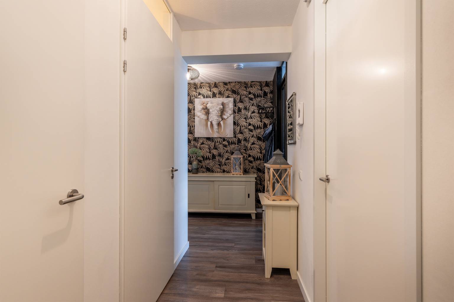 Na de voordeur is er een binnenkomst in de entreehal die toegang geeft tot de woonkamer, twee slaapkamers, de badkamer, de inpandige berging en het gedeeltelijk betegelde toilet. Daarnaast is er in de hal ook een vaste kast aanwezig. De wanden zijn afgewerkt met vliesbehang en op de vloer ligt PVC met daaronder vloerverwarming. Dit alles is terug te vinden in het gehele appartement.
