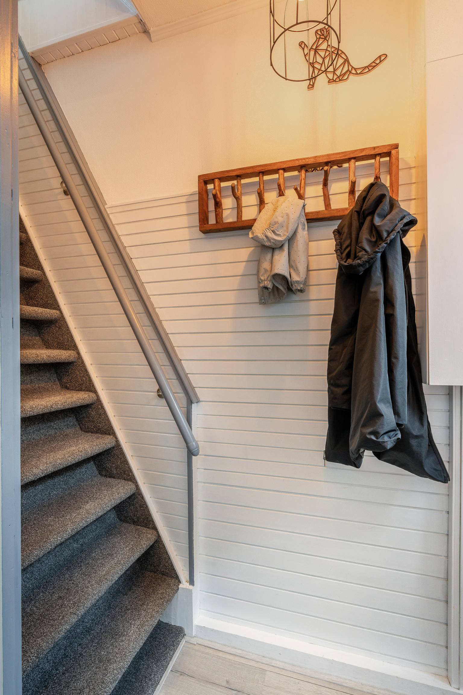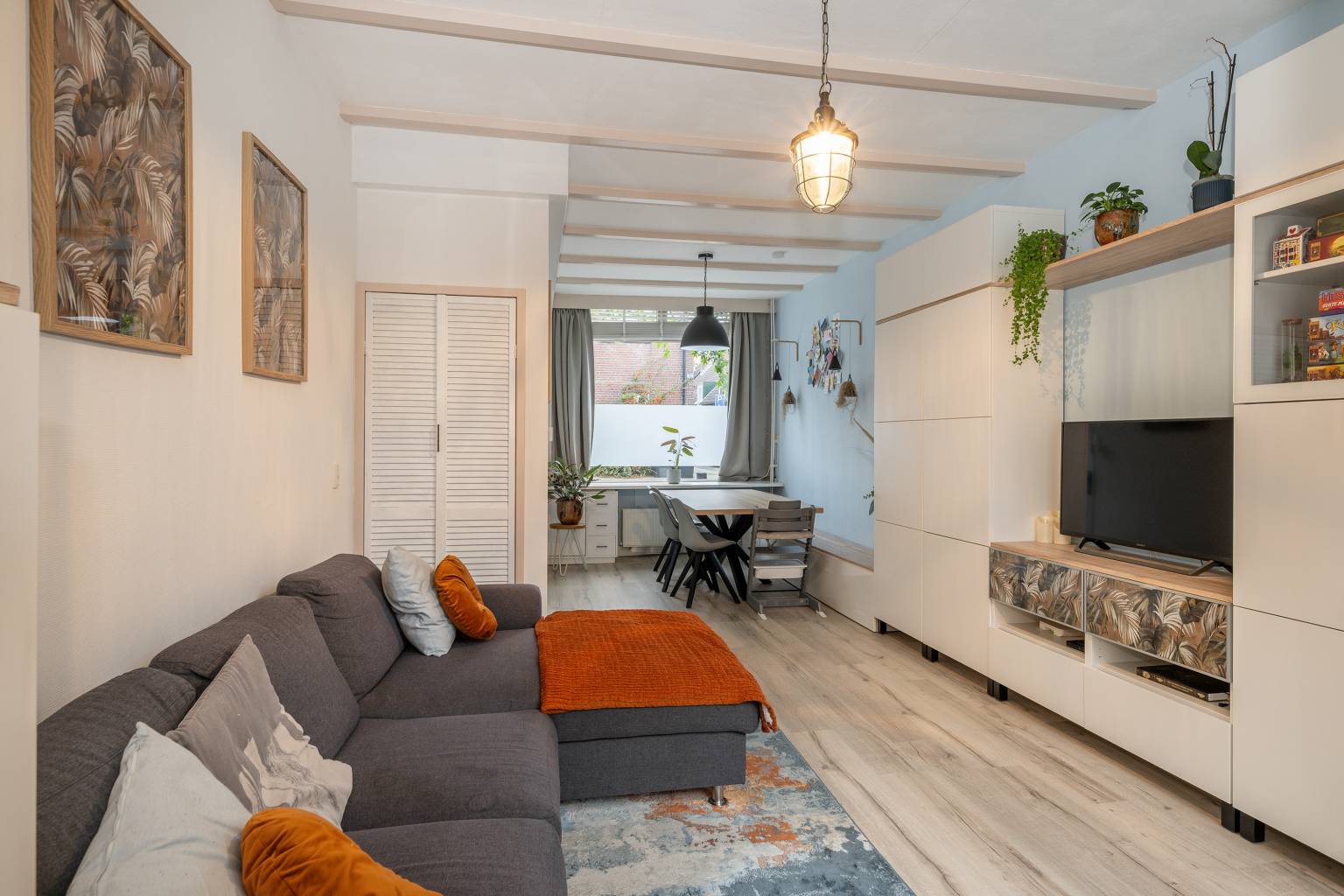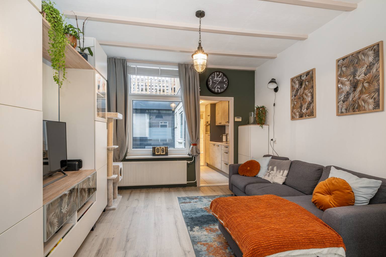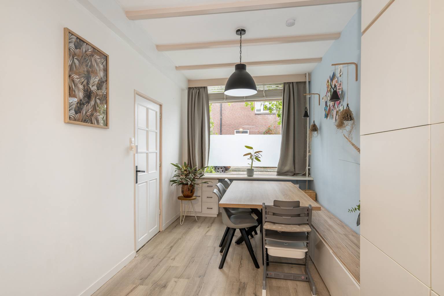 De voordeur is direct vanaf de straat bereikbaar en geeft toegang tot de afsluitbare entreehal met de meterkast en de gestoffeerde trap naar de verdieping. Op de vloer ligt laminaat en dat is doorgetrokken naar de woonkamer.