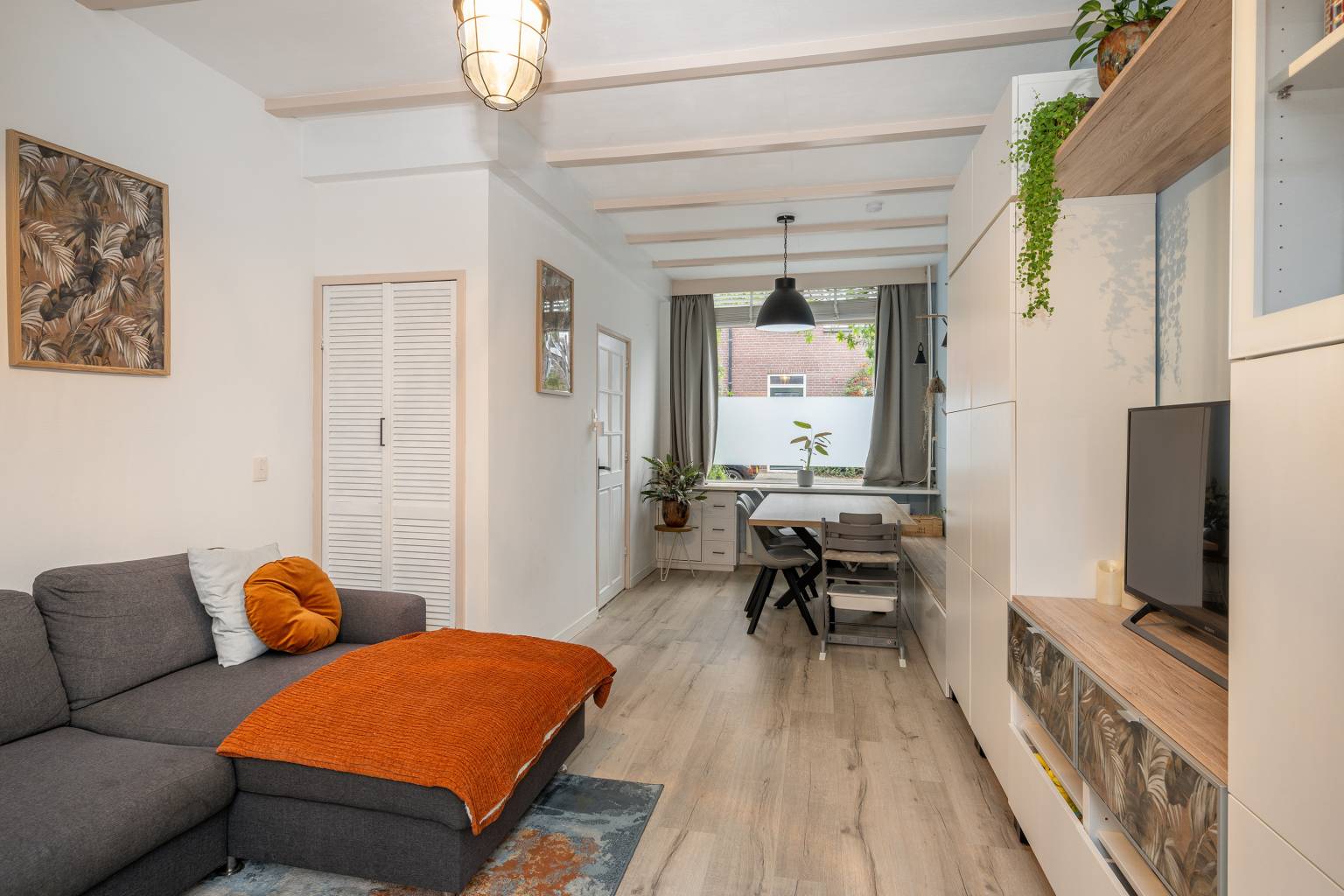 De woonkamer heeft een smal gedeelte aan de voorzijde, dat ruimte biedt aan een eethoek. In het verlengde is er een bredere zithoek, dat zicht heeft over de tuin. Onder de trap is er een trapkast gemaakt met openslaande deurtjes. Vanuit de woonkamer is er toegang tot de keuken. Alle wanden zijn glad en de balken aan het plafond zijn geschilderd.