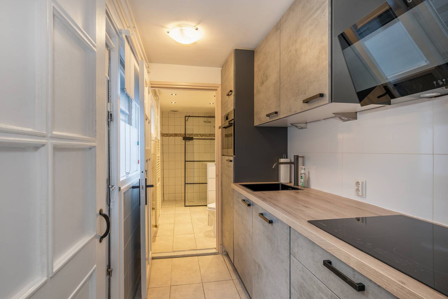 De keuken beschikt over een recht keukenblok met bovenkasten en een betegelde achterwand. Daarnaast is er diverse apparatuur aanwezig, zoals koelkast, een combi magnetron, een vaatwasser, een inductiekookplaat en een afzuigkap met afzuiging naar buiten. Er ligt een tegelvloer, die is doorgetrokken naar de aangrenzende badkamer en er is een deur naar de achtertuin.