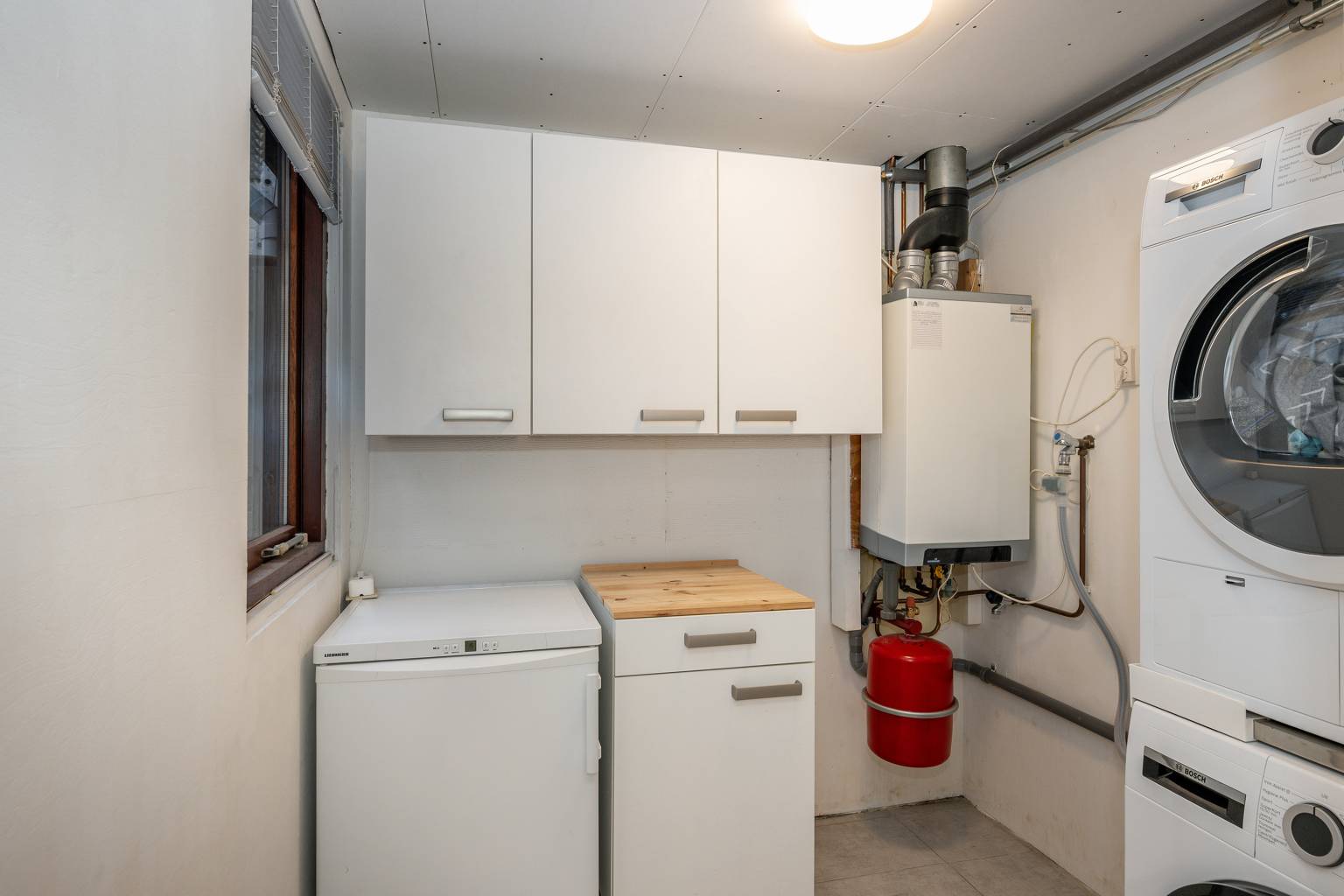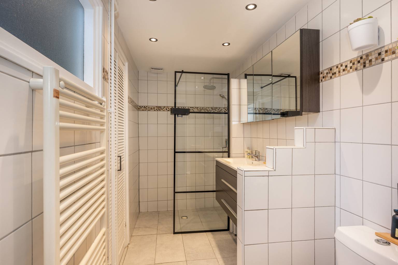 De volledig betegelde badkamer is uitgerust met een inloopdouche, een toilet en een dubbel wastafelmeubel met daarboven een spiegelkast. Ook hangt er een handdoeken radiator en is het plafond voorzien van inbouw spots en het afzuigpunt van de mechanische ventilatie. Het aanwezige raam zorgt voor daglichttoetreding en via openslaande deuren is er toegang tot de berging. Deze is voorzien van verlichting en elektra en is netjes afgewerkt. Het biedt plaats aan de opstelling van de Cv-ketel en de wasmachine aansluiting en er hangen kasten voor extra opbergmogelijkheden. Het raam biedt zicht naar de tuin en de vloer is betegeld.