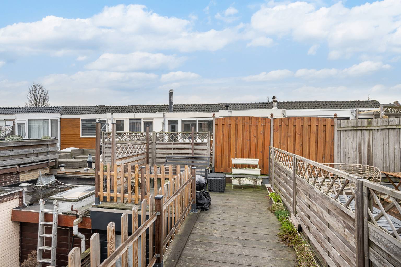 De knusse achtertuin is beschut gelegen en biedt veel privacy. De houten schutting zorgt voor de afscheiding met de buren en de ondergrond is voorzien van tegels.