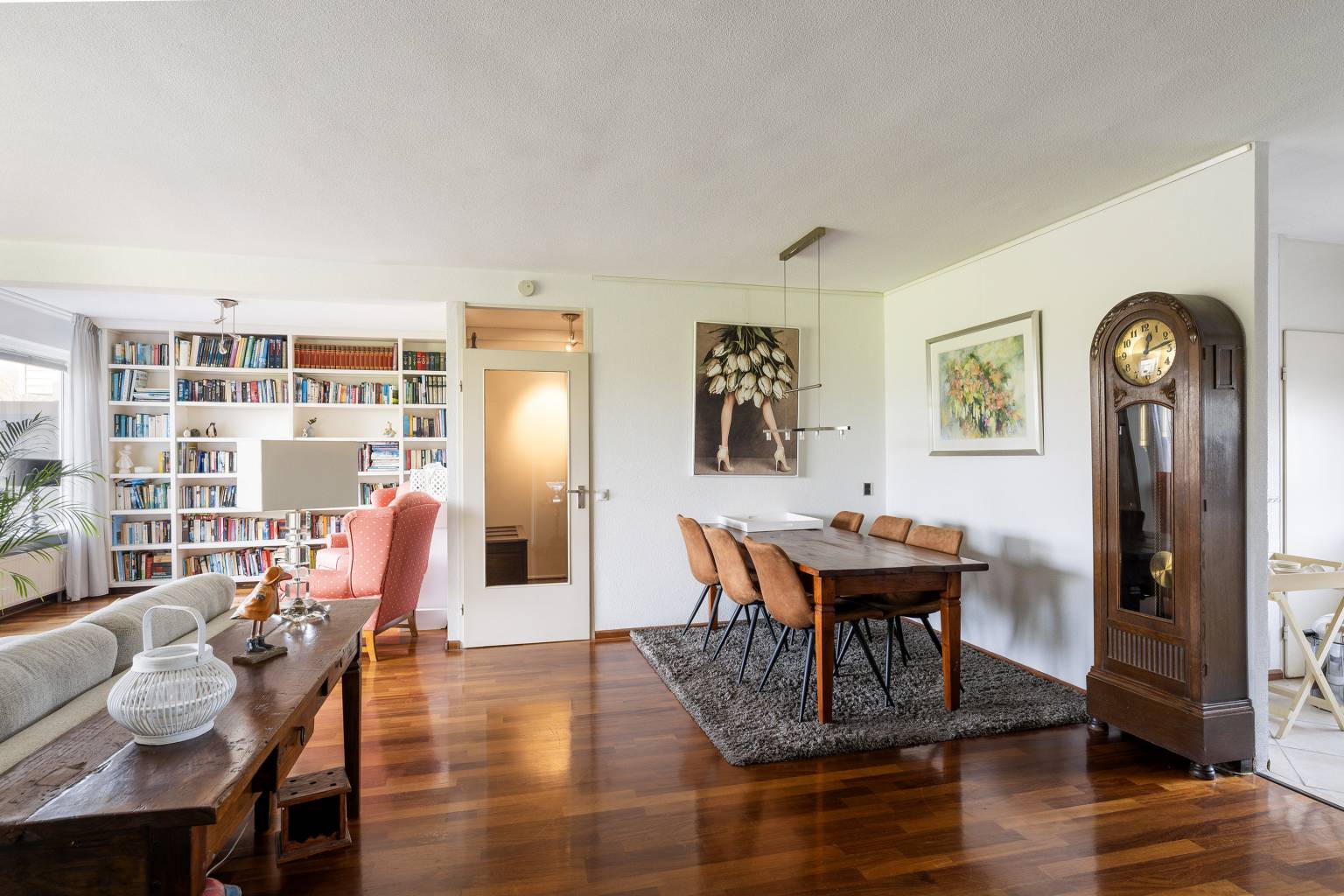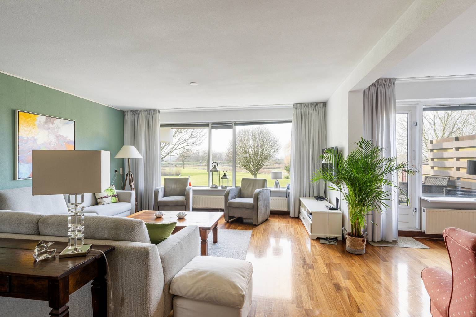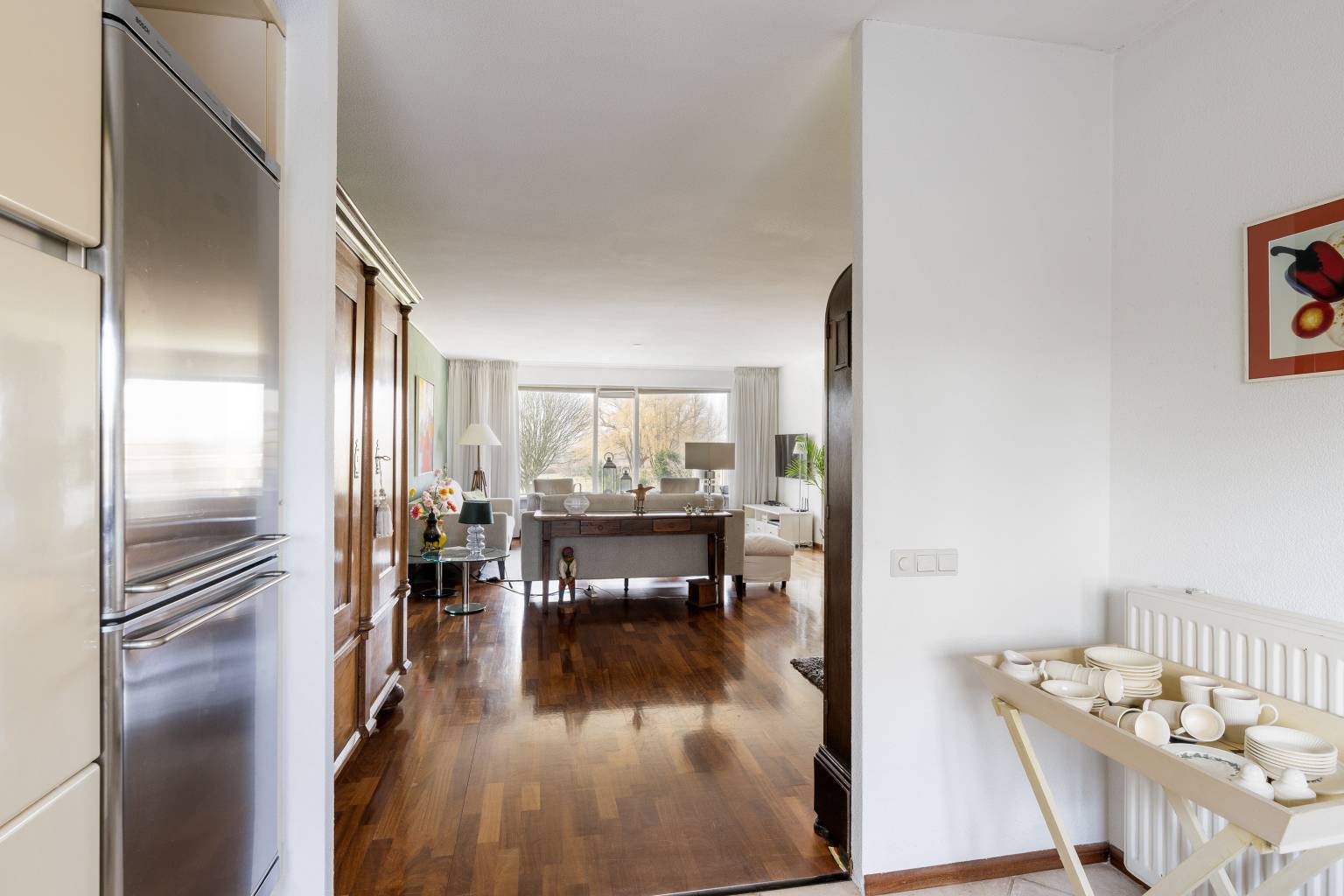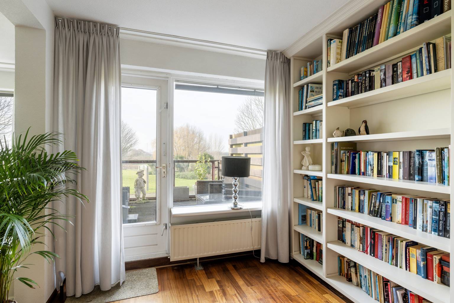 De riante woonkamer biedt de mogelijkheid voor het creëren van meerdere zithoeken en heeft een vrij en rustgevend uitzicht. Vanuit de woonkamer is de tussenhal bereikbaar en is er een open toegang tot de keuken. De, bij de woonkamer betrokken, zijkamer is eventueel naar wens dicht te zetten, waardoor er een extra kamer kan ontstaan en vanuit hier is er een deur naar het balkon, met eveneens een vrij uitzicht.