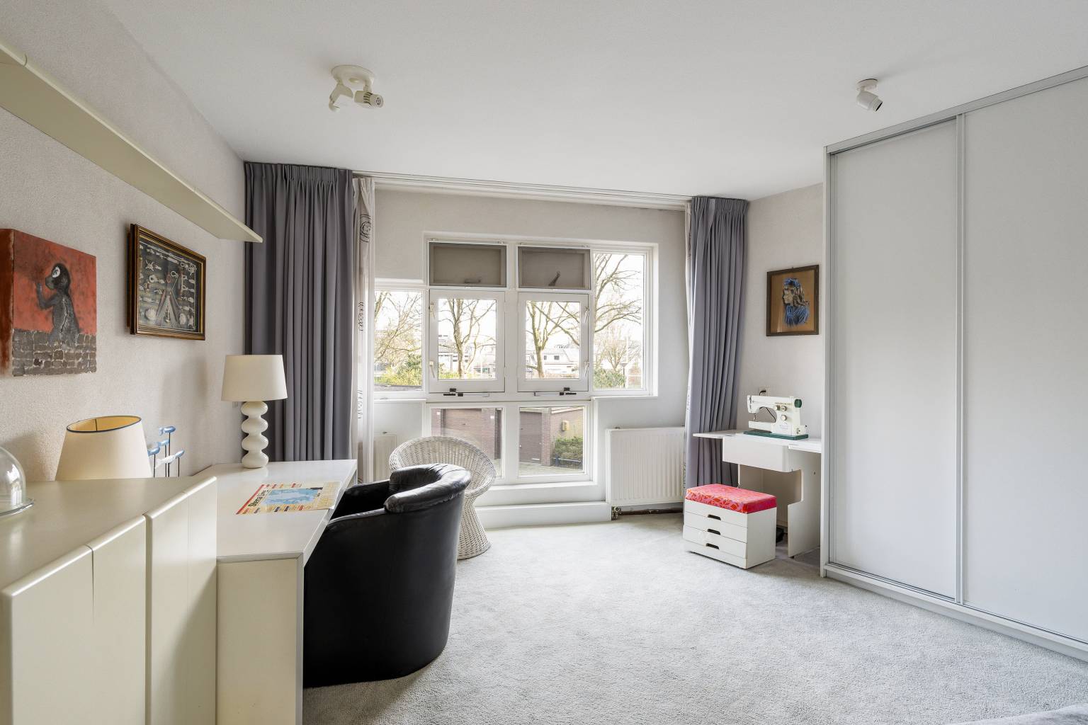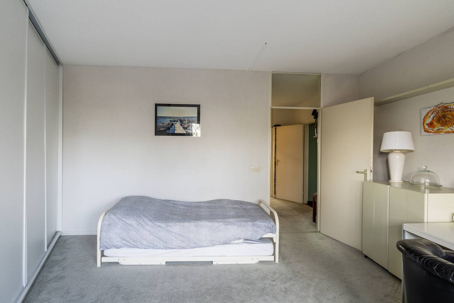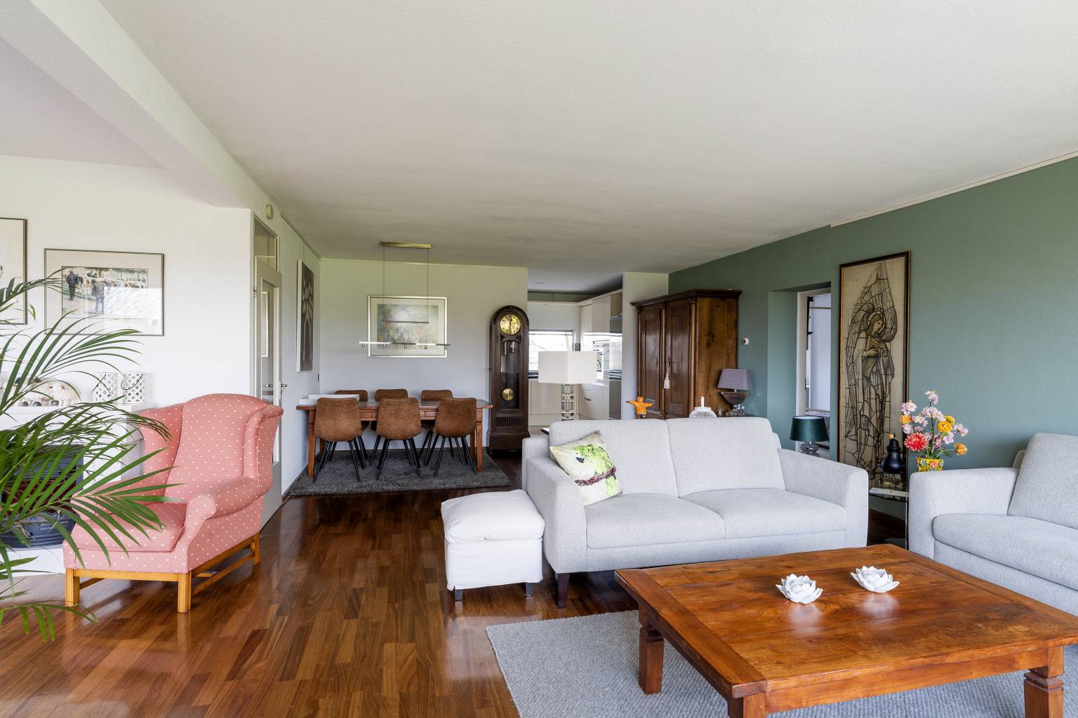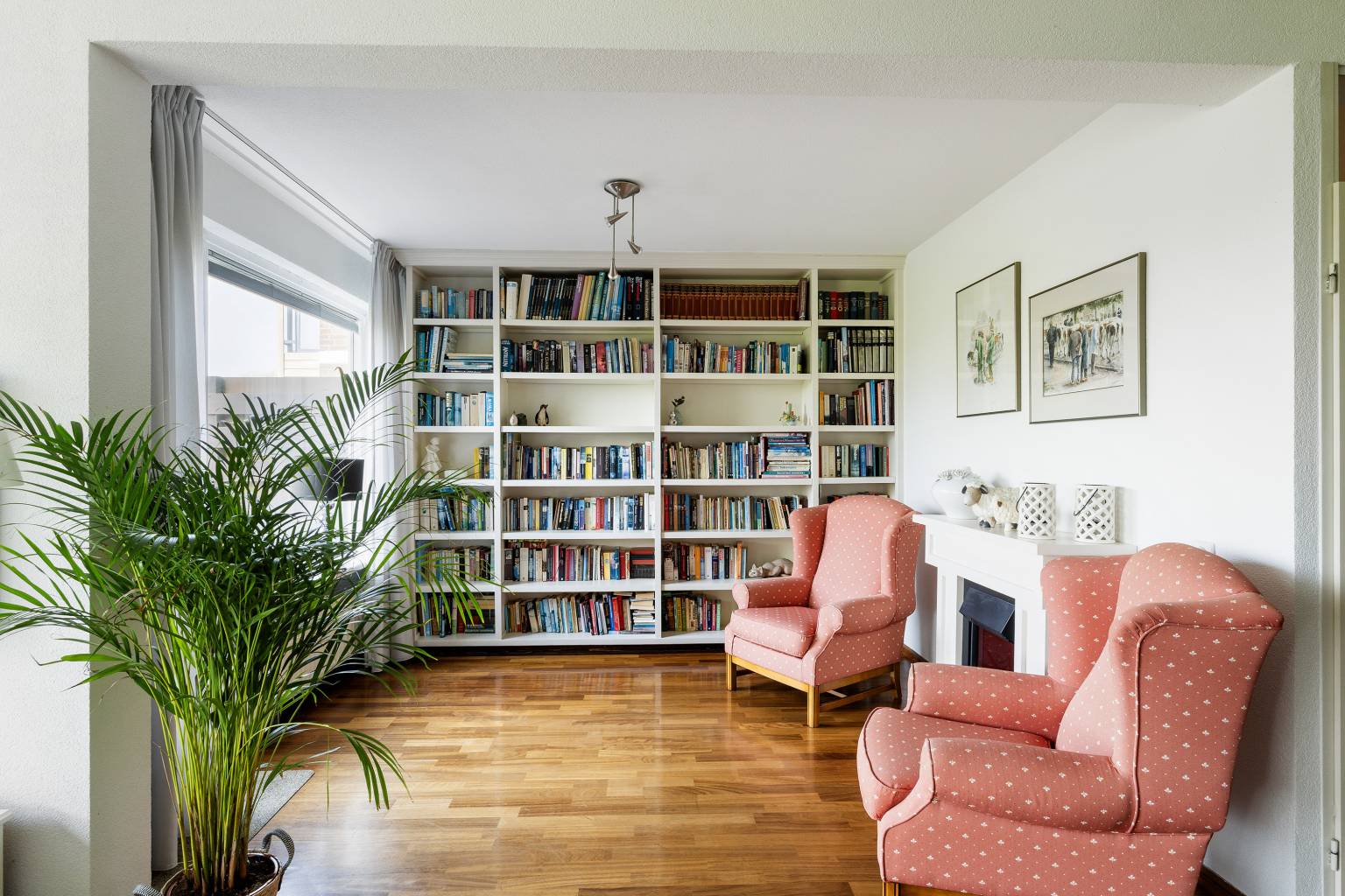 De riante woonkamer biedt de mogelijkheid voor het creëren van meerdere zithoeken en heeft een vrij en rustgevend uitzicht. Vanuit de woonkamer is de tussenhal bereikbaar en is er een open toegang tot de keuken. De, bij de woonkamer betrokken, zijkamer is eventueel naar wens dicht te zetten, waardoor er een extra kamer kan ontstaan en vanuit hier is er een deur naar het balkon, met eveneens een vrij uitzicht.