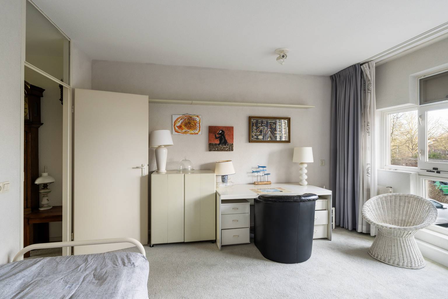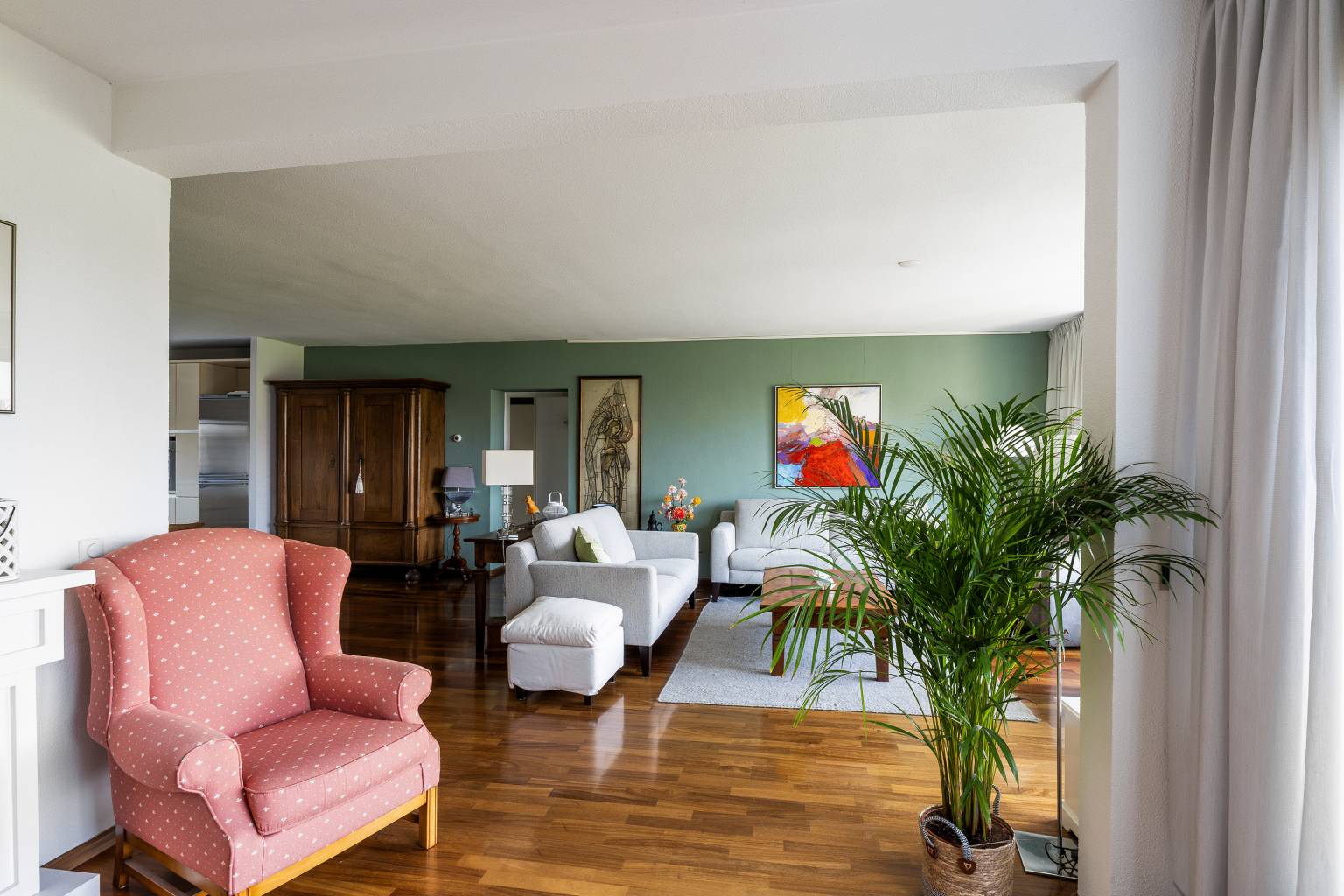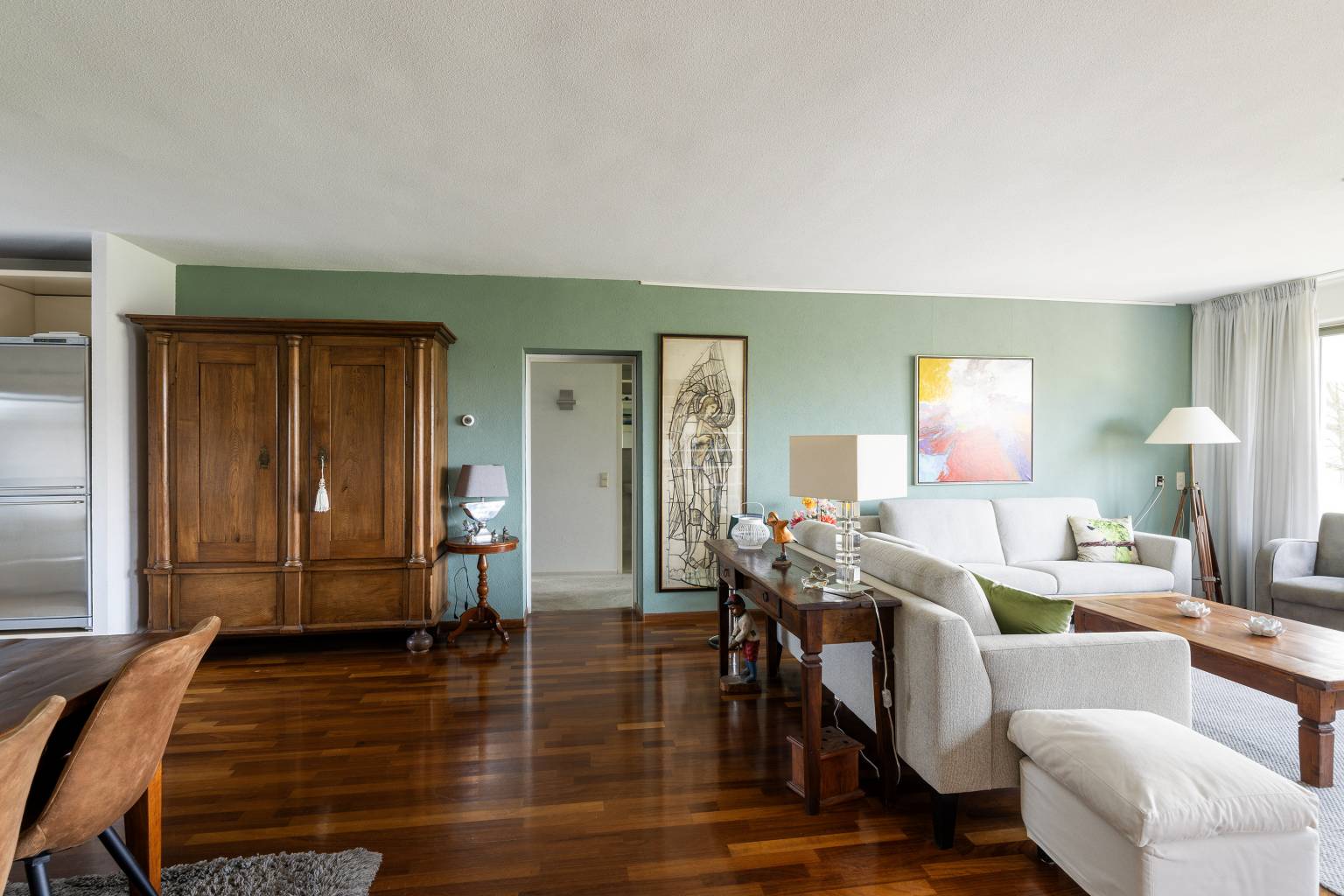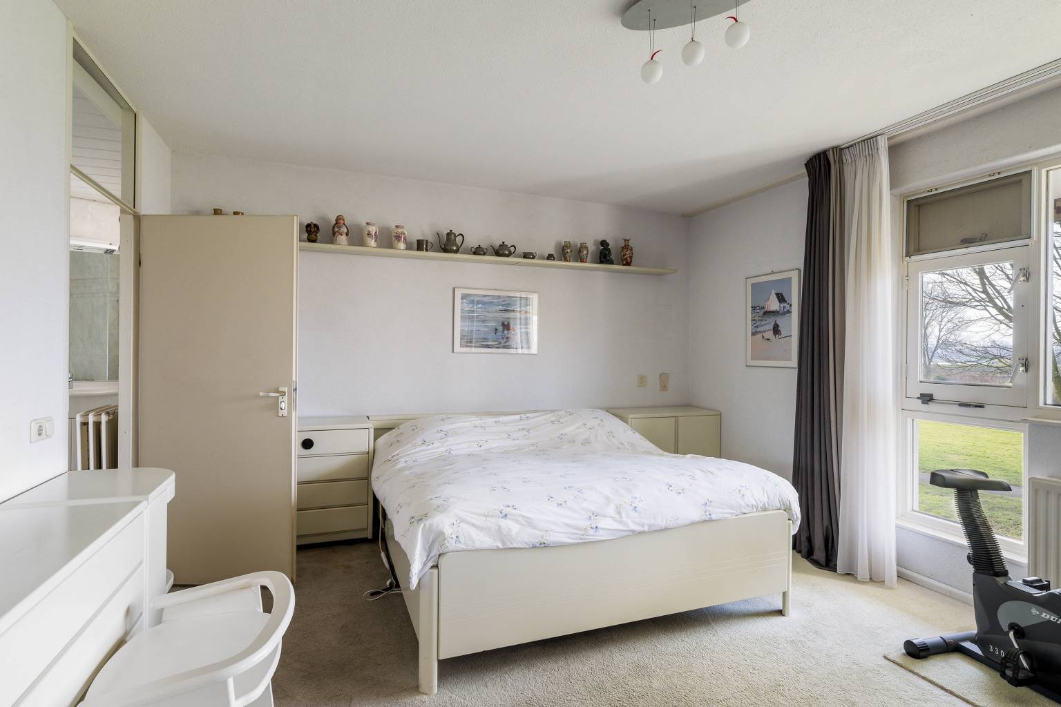De riante woonkamer biedt de mogelijkheid voor het creëren van meerdere zithoeken en heeft een vrij en rustgevend uitzicht. Vanuit de woonkamer is de tussenhal bereikbaar en is er een open toegang tot de keuken. De, bij de woonkamer betrokken, zijkamer is eventueel naar wens dicht te zetten, waardoor er een extra kamer kan ontstaan en vanuit hier is er een deur naar het balkon, met eveneens een vrij uitzicht.
