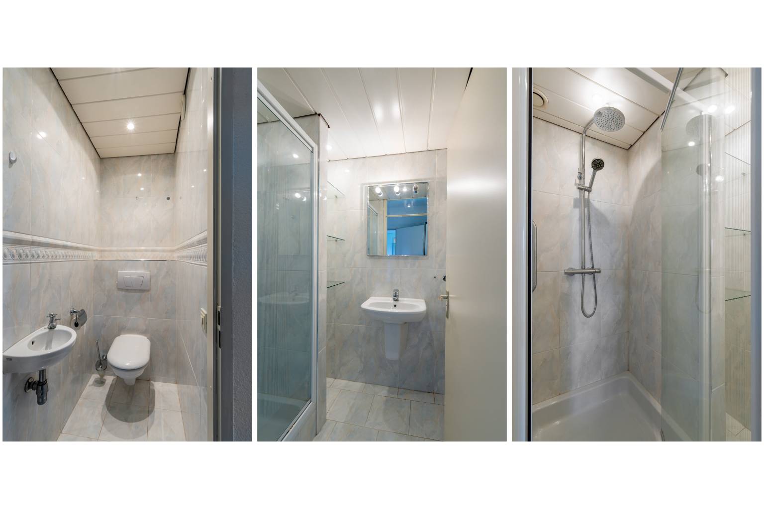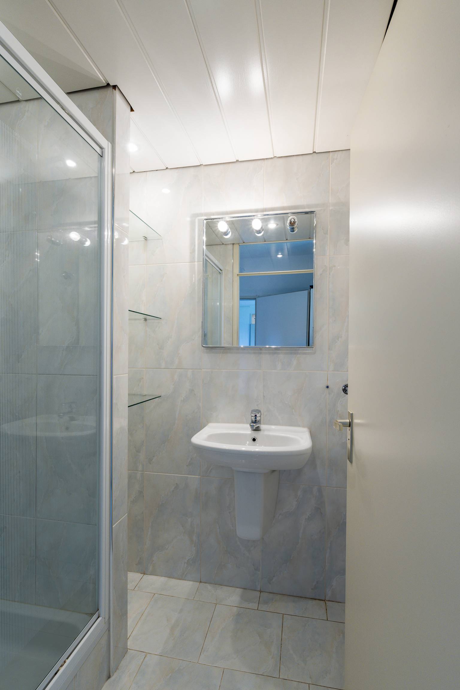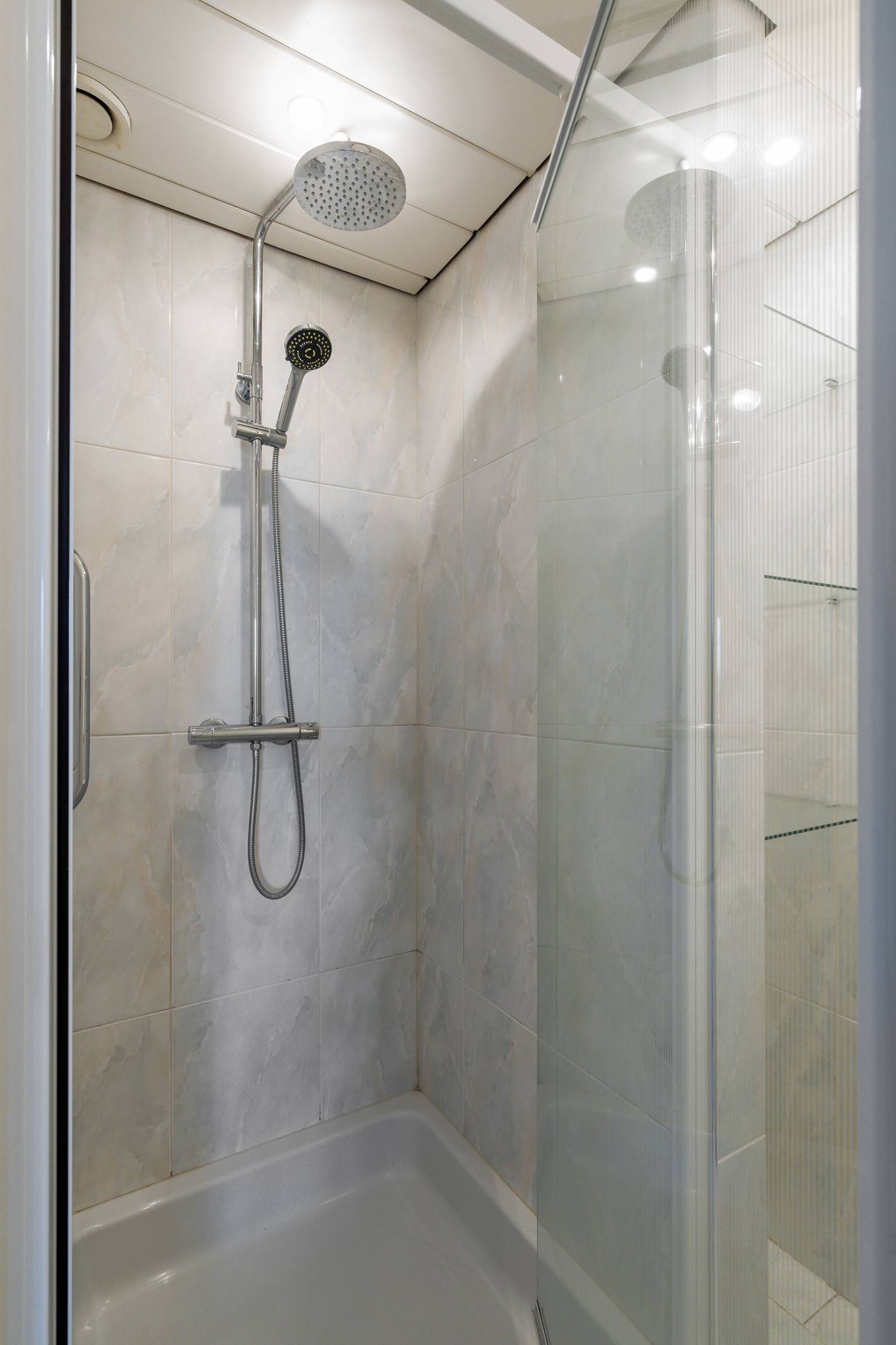 De eerste badkamer is volledig betegeld en uitgerust met een douchecabine, een wastafel en een plafond dat is voorzien van inbouw spots.