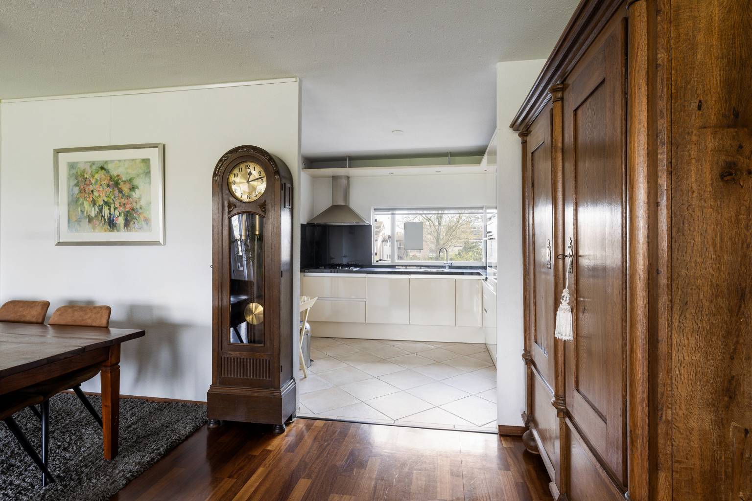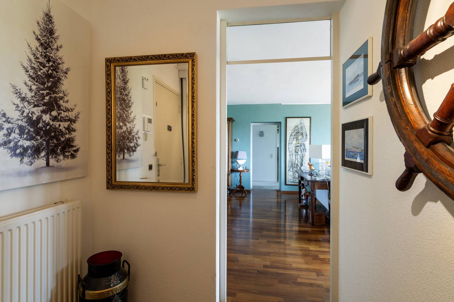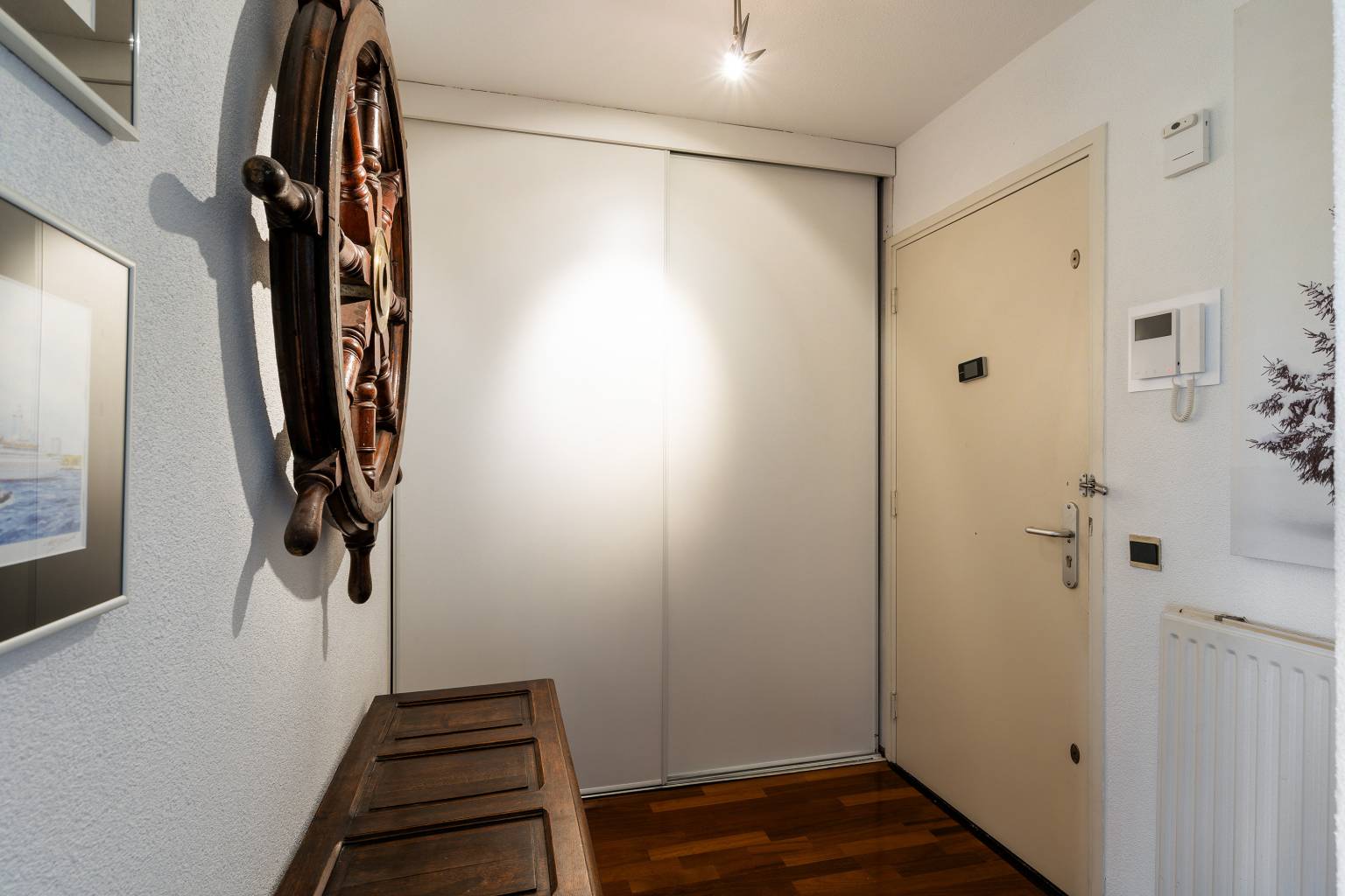 Binnenkomst in de entreehal, die toegang geeft tot de woonkamer. In de hal bevindt zich een vaste kast met schuifdeuren, met daarin de meterkast. De wanden zijn afgewerkt met spachtelputz en op de vloer ligt parket, dat geheel drempelloos is doorgetrokken naar de woonkamer.