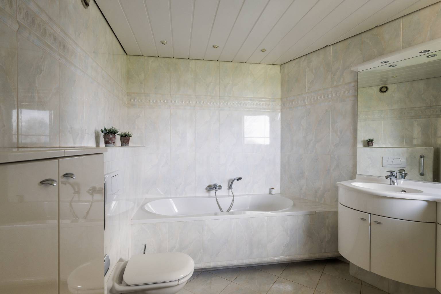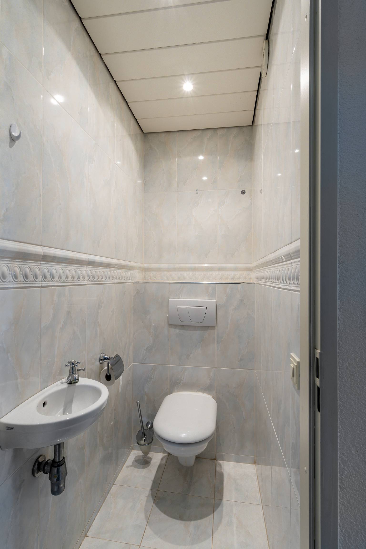 Het toilet is volledig betegeld en voorzien van een zwevend toilet, een fonteintje en een plafond dat is voorzien van inbouw spots.