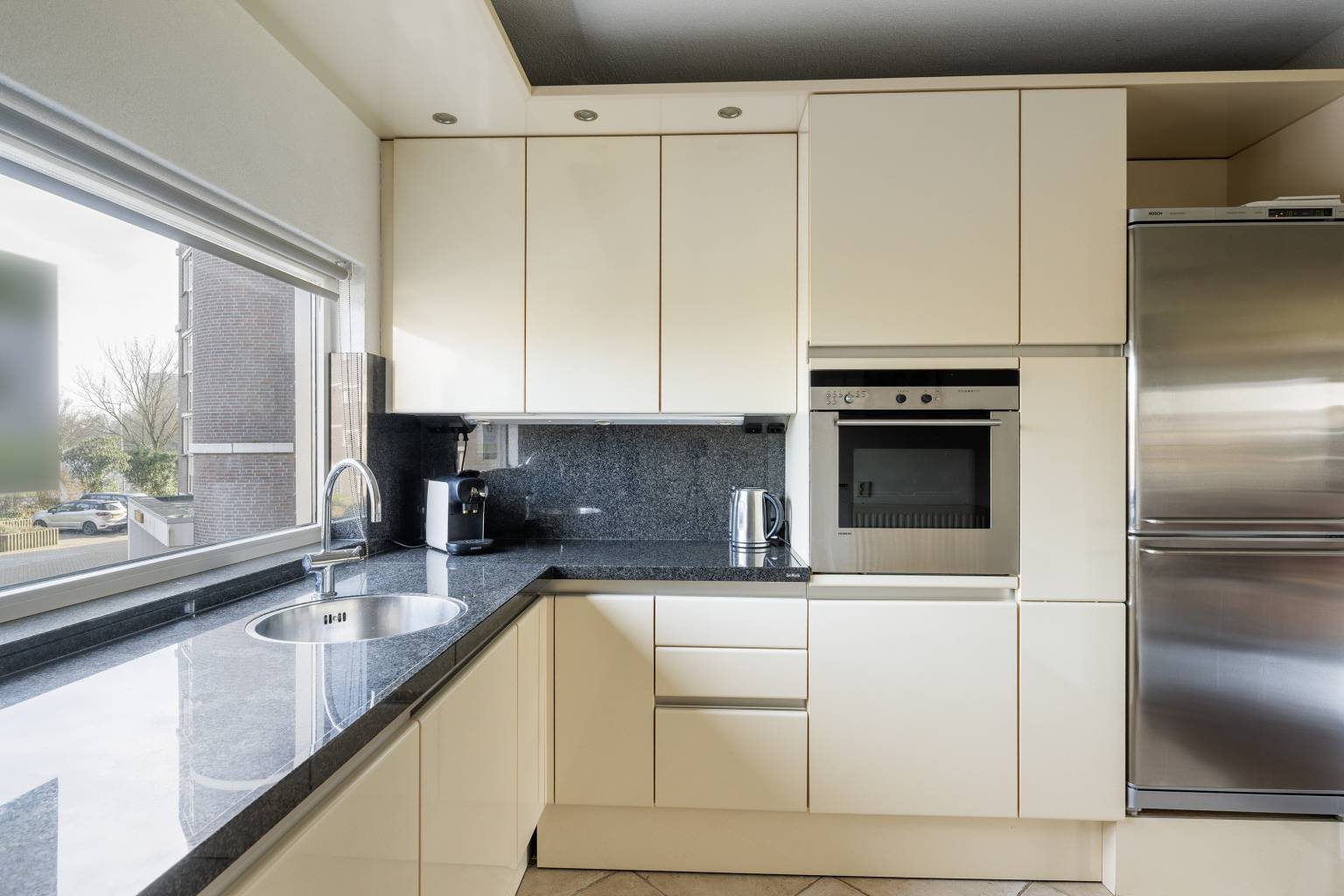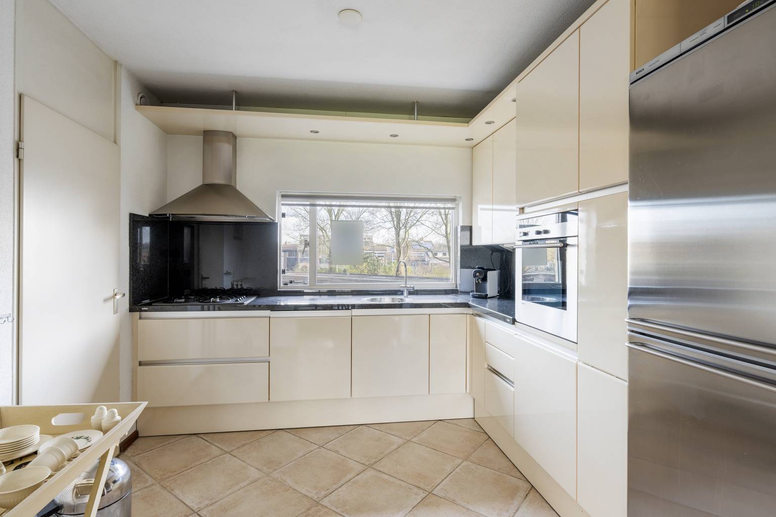 De keuken is opgesteld in een ruime hoek, waarbij de bovenkasten zijn voorzien van verlichting en het aanrechtblad doorloopt naar de achterwand. De aanwezige koof is voorzien van inbouw spots en er is diverse apparatuur aanwezig, waaronder een koelkast, een vriezer, een oven, een vaatwasser een kookplaat en een afzuigkap. Vanuit de keuken is er een deur naar de bijkeuken en de vloer is hier voorzien van tegels.