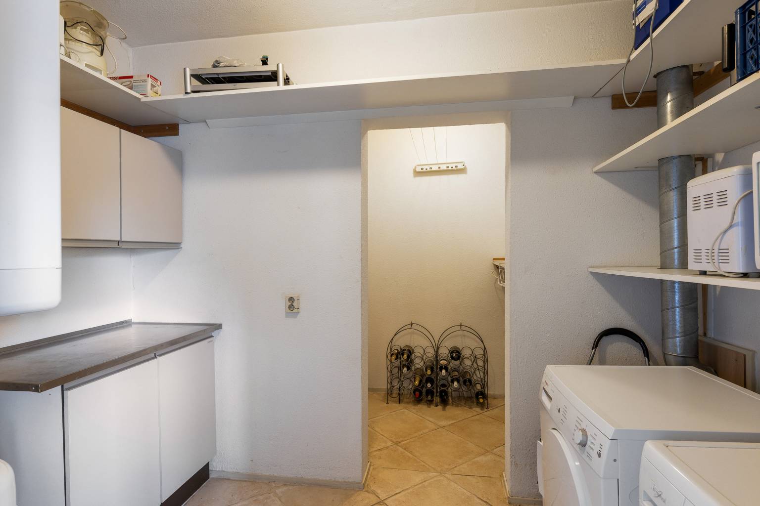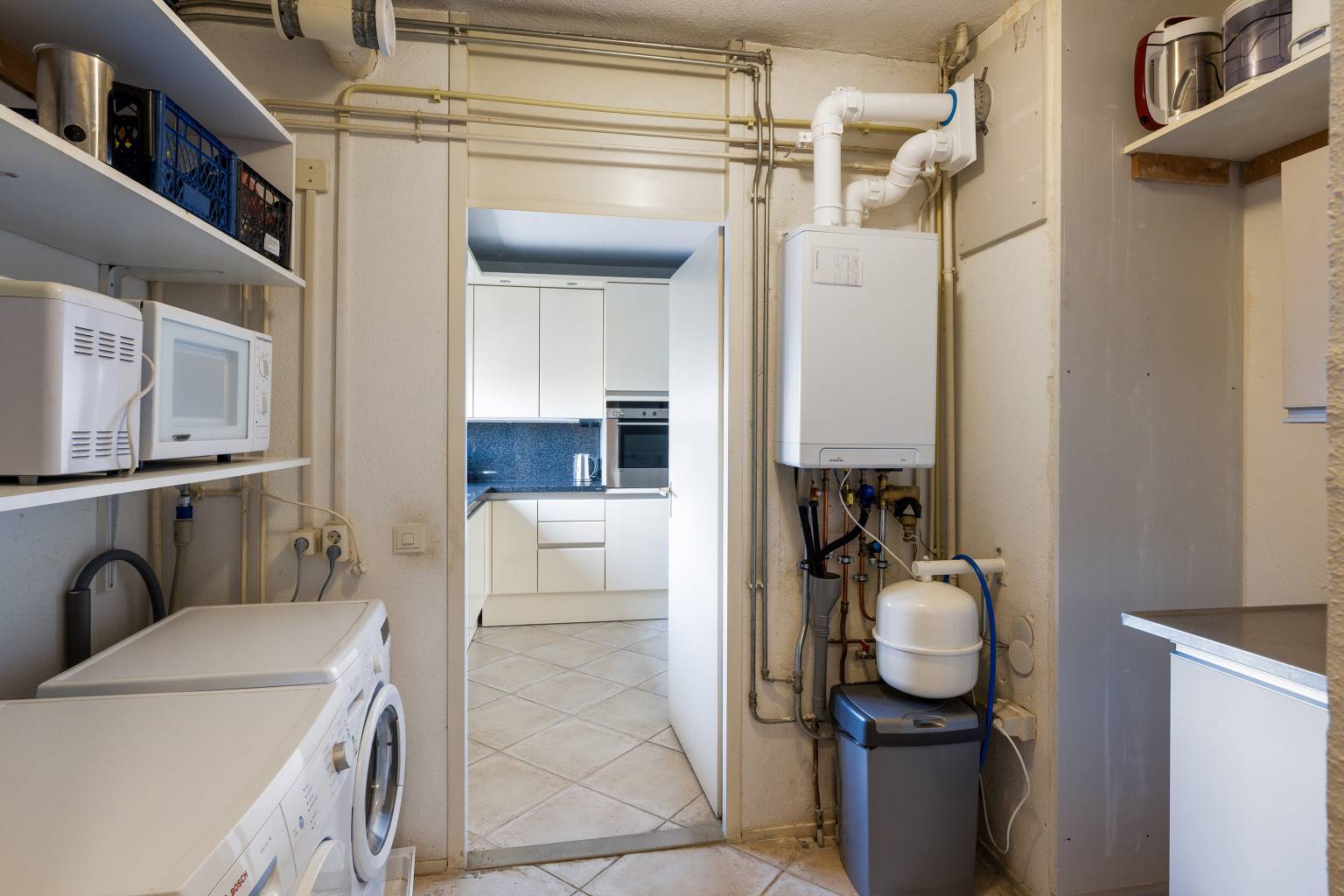 De bijkeuken is opgedeeld in twee delen, waarbij in het voorste gedeelte de opstelling van de Cv-ketel en de aansluitingen voor de wasmachine en de droger zich bevinden. Daarnaast zorgt het aanwezige werkblad met boven- en onderkasten voor extra berg- en werkruimte en is er in het achterste gedeelte ruimte voor kasten.