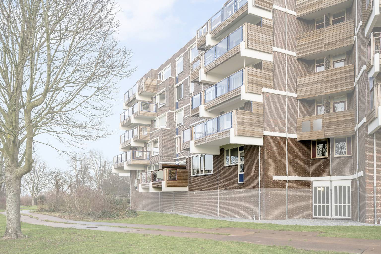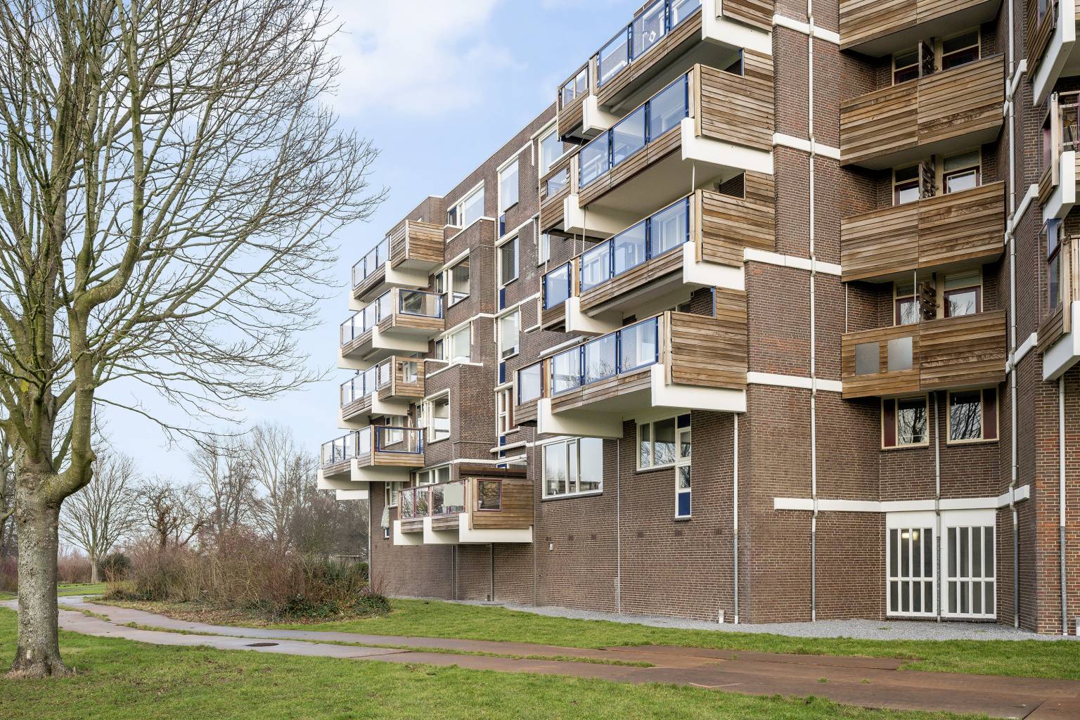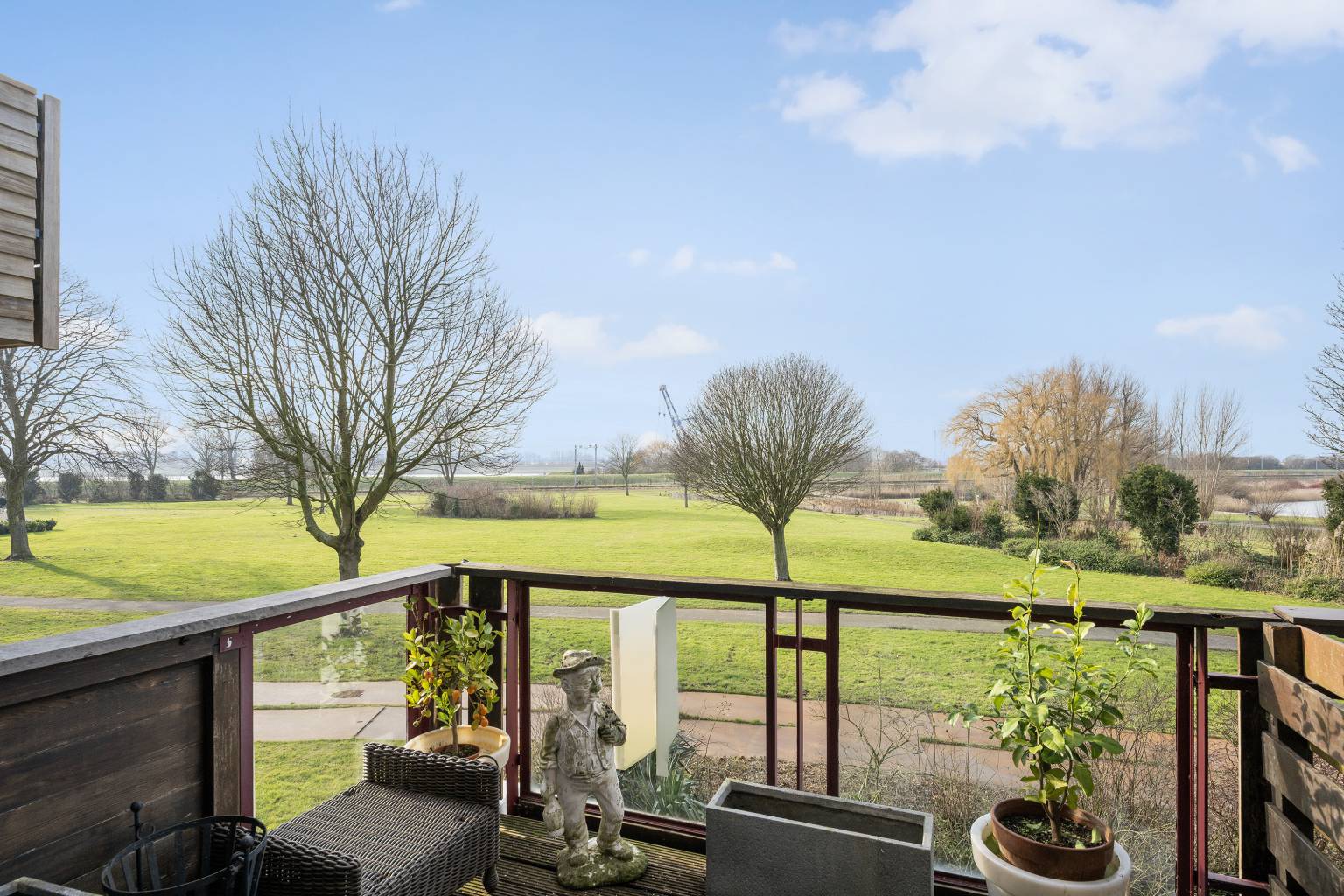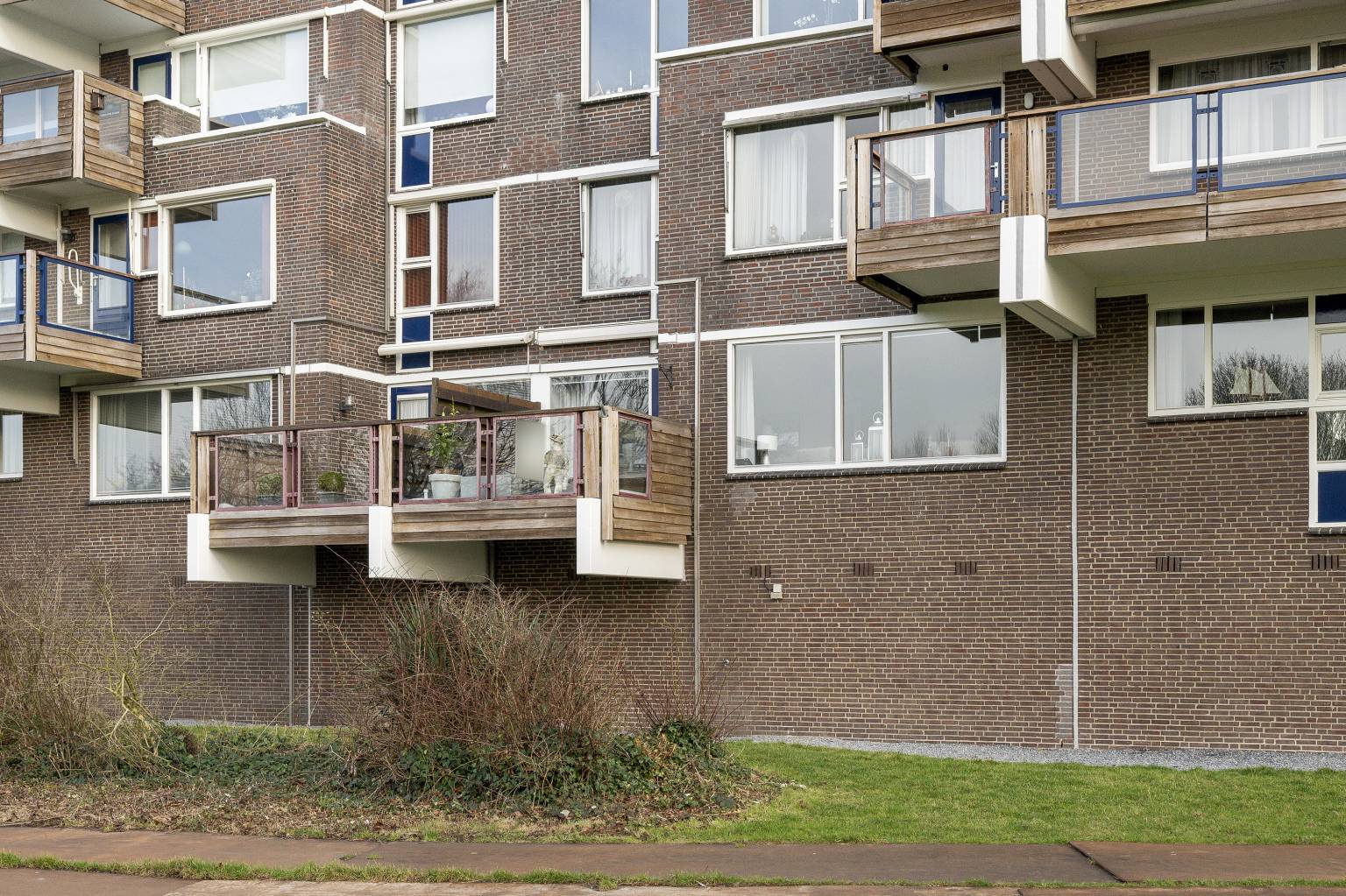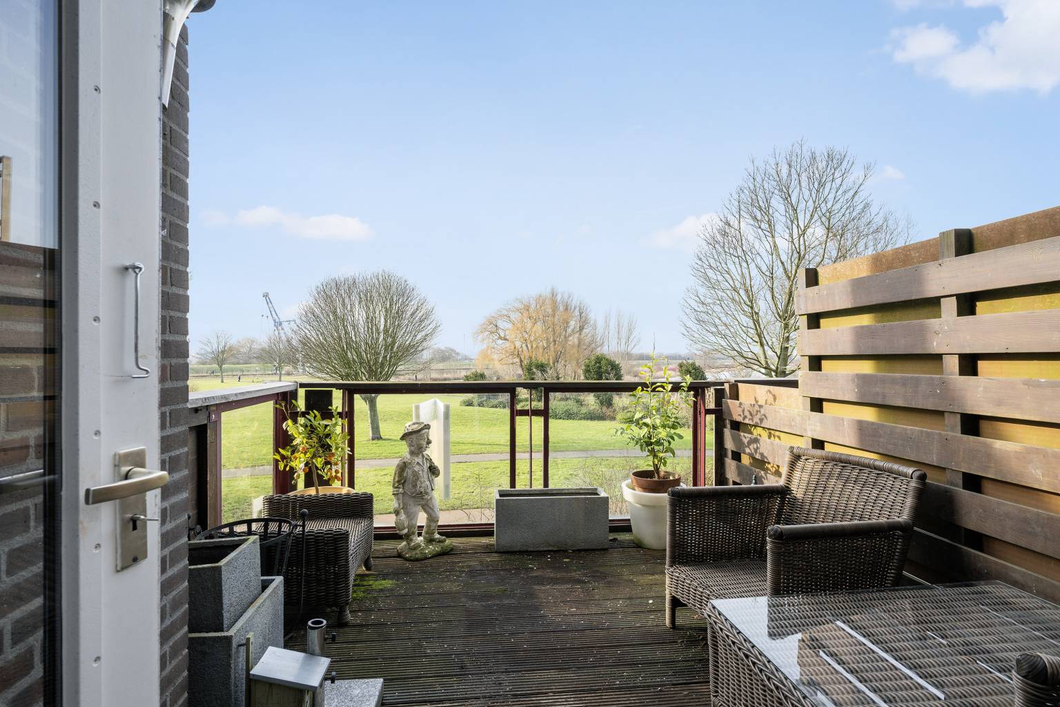 Het balkon heeft een houten schutting als afscheiding naar de buren, waardoor het privacy geeft. De balustrade met glazen panelen zorgt ervoor dat het uitzicht niet wordt belemmerd en de ondergrond van het balkon is voorzien van houten vlonderplanken.