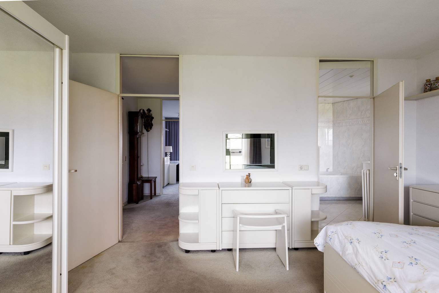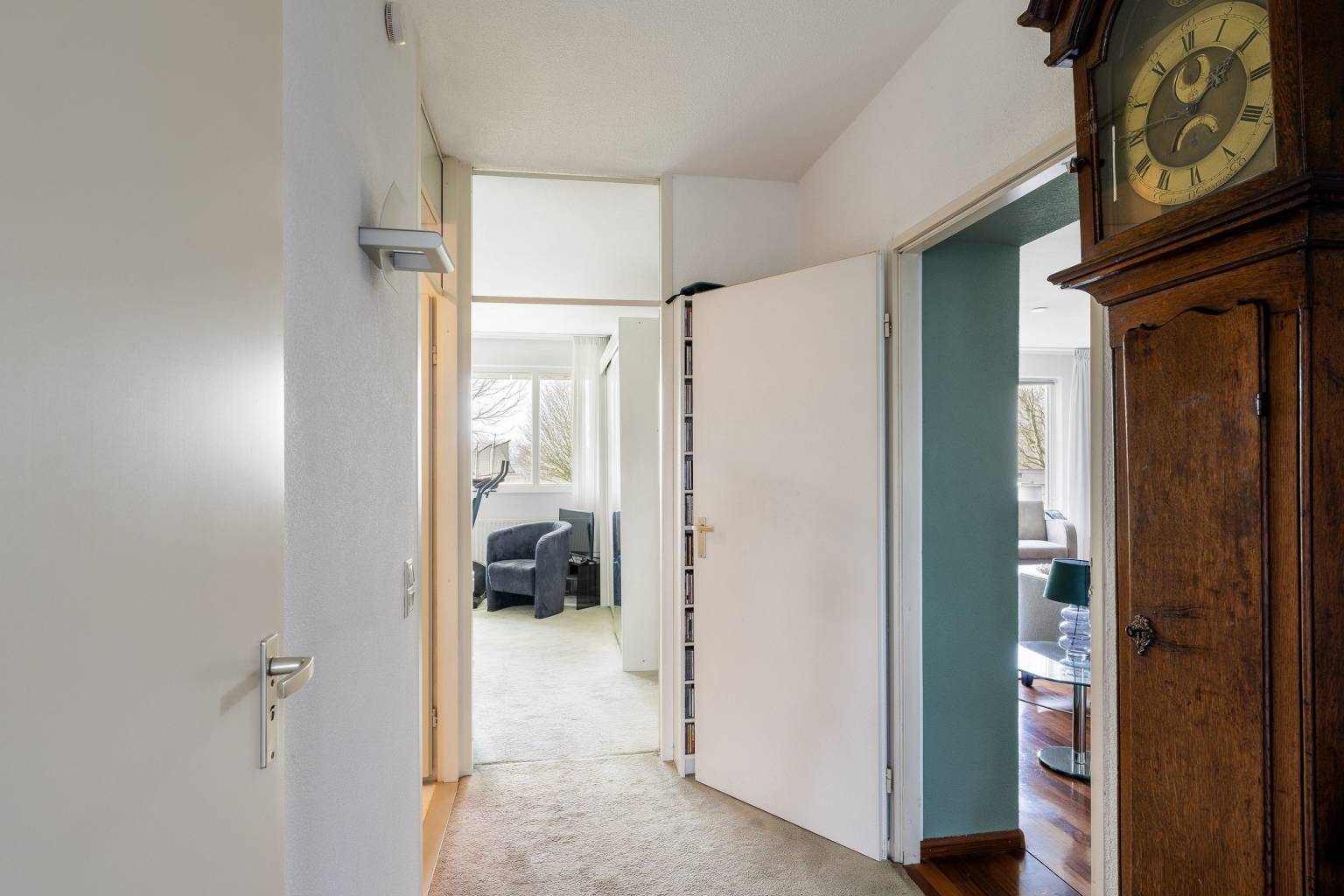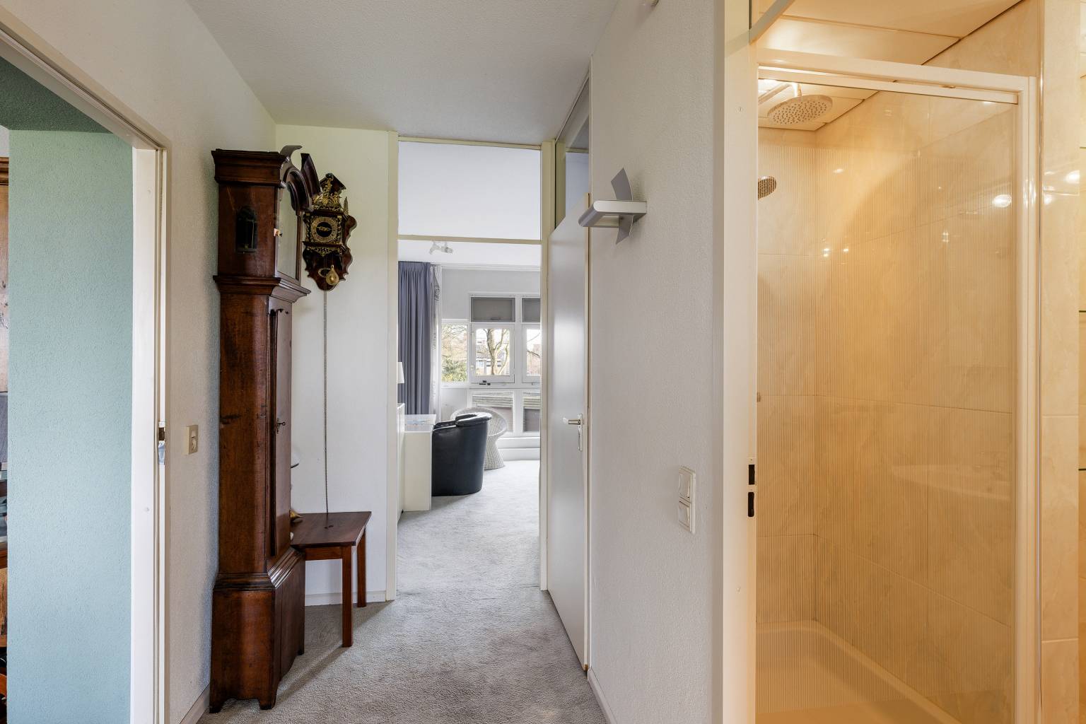 De tussenhal is een verbindingsruimte naar de twee slaapkamers, de eerste badkamer en het toilet.