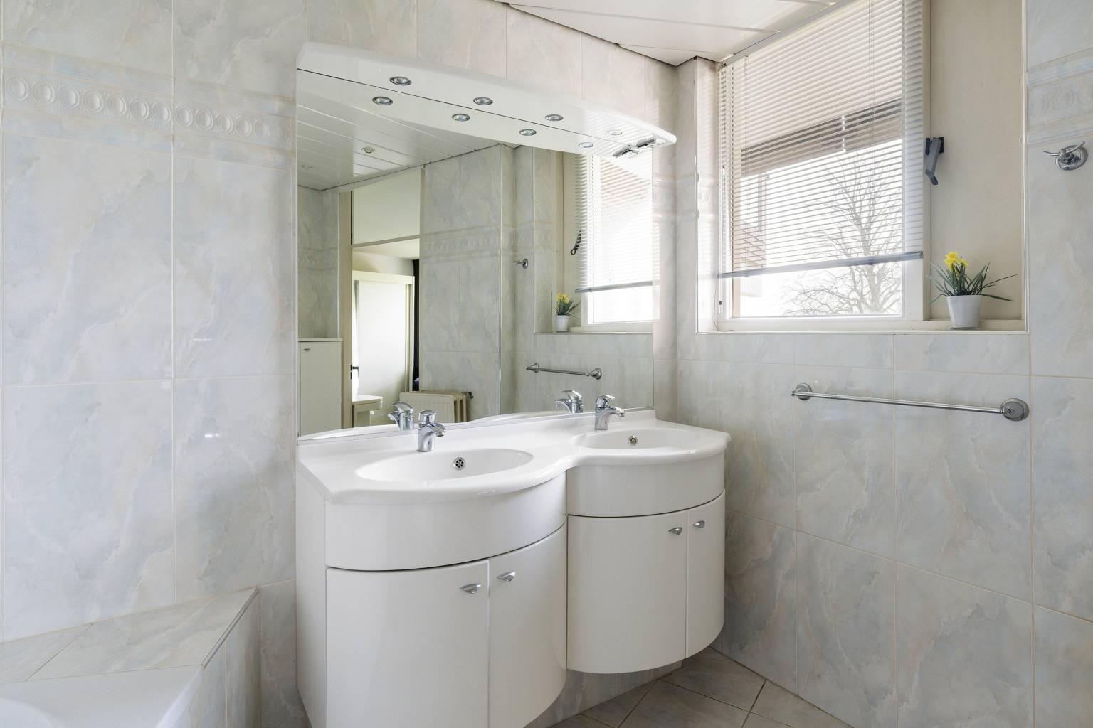 De hoofdslaapkamer is rustig gelegen aan de achterzijde en beschikt over een en-suite badkamer. Deze badkamer is volledig betegeld in dezelfde stijl als de eerste badkamer en is uitgerust met een ligbad met een handdouche, een toilet en een dubbel wastafelmeubel met een spiegel en verlichting. Het plafond is voorzien van inbouw spots en er is een te openen raam voor natuurlijke ventilatie. De tweede slaapkamer is ruim van opzet en heeft een speelse schuine wand met een grote vaste kast met schuifdeuren. In beide slaapkamers zijn de wanden afgewerkt met spachtelputz en is de vloer voorzien van vloerbedekking.