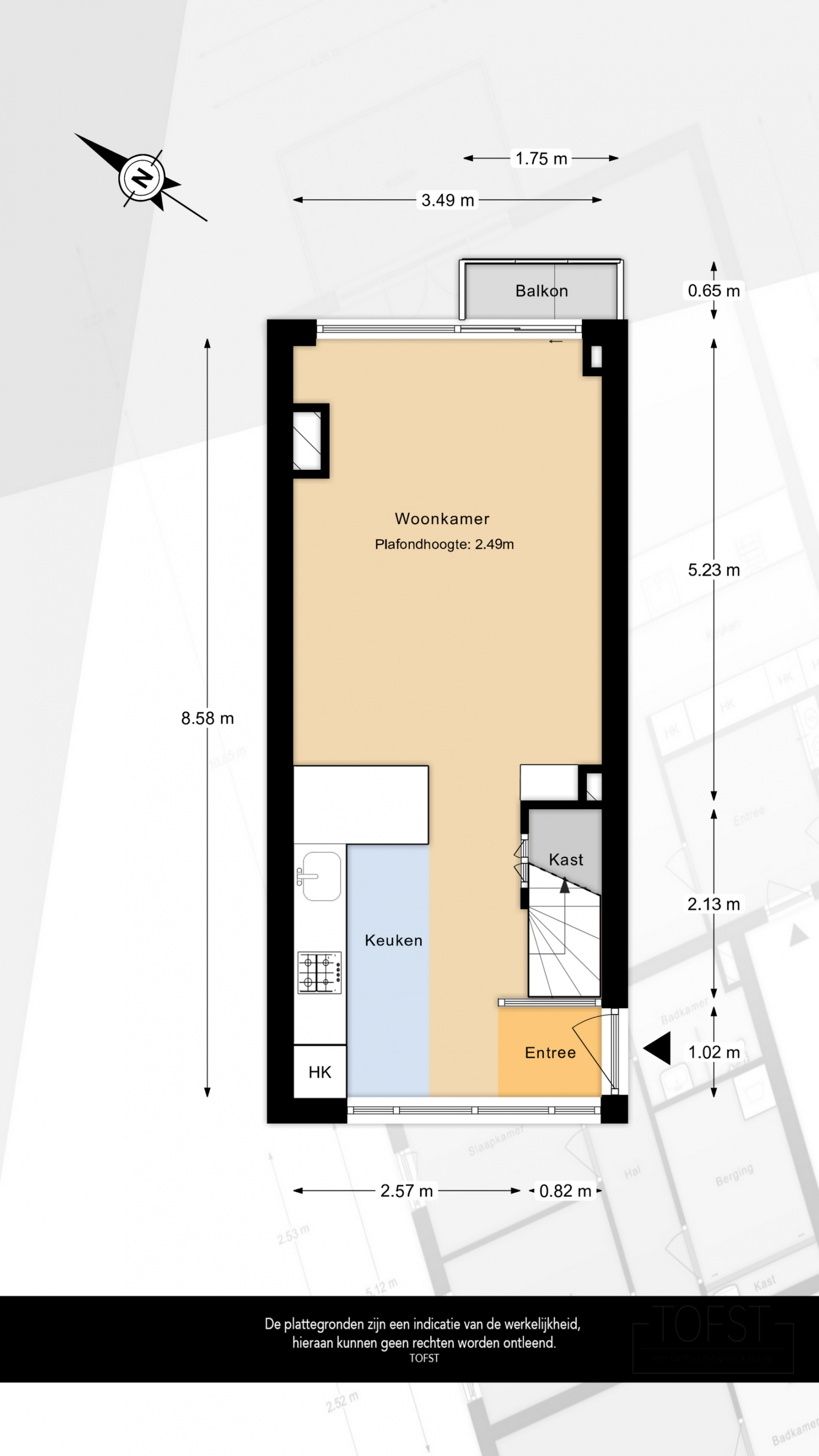 Na de voordeur is er een binnenkomst in de entree die in open verbinding staat met de keuken en de aangrenzende woonkamer. De glaswand zorgt voor een scheiding met de trap naar de 2e verdieping met trapkasten en deze gehele ruimte is voorzien van strakke wanden, een plafond voorzien van inbouw spots en een laminaatvloer.