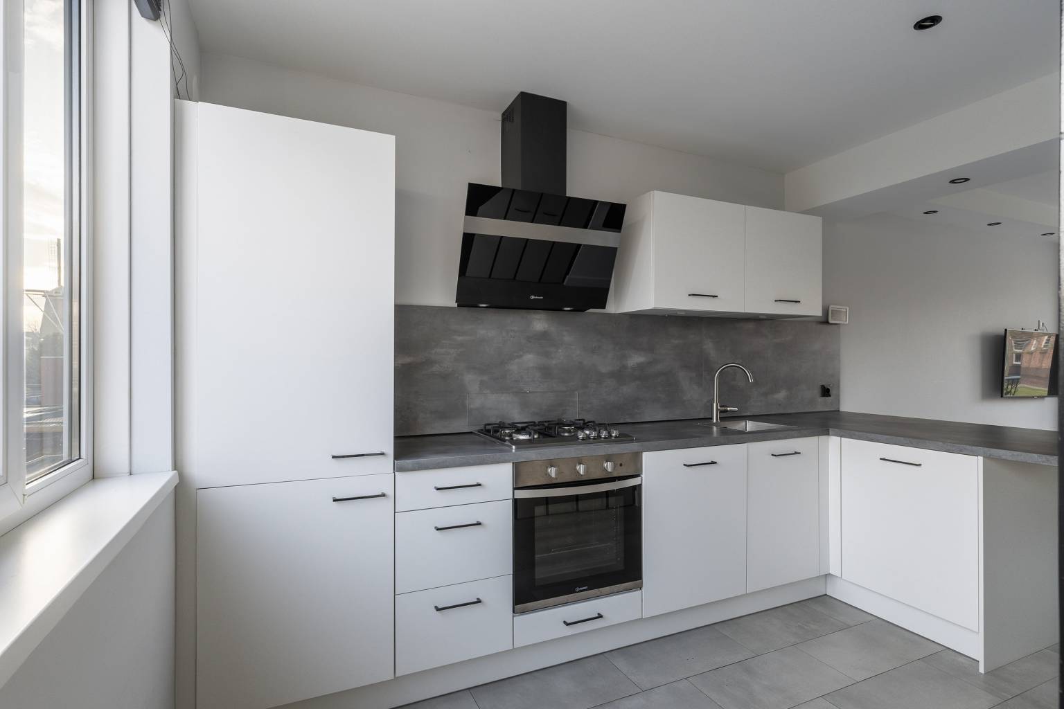 De keuken is opgesteld in een L-vorm met bovenkasten en een bar richting de woonkamer. Het aanrechtblad loopt over in de achterwand en de keuken is voorzien van diverse inbouwapparatuur.