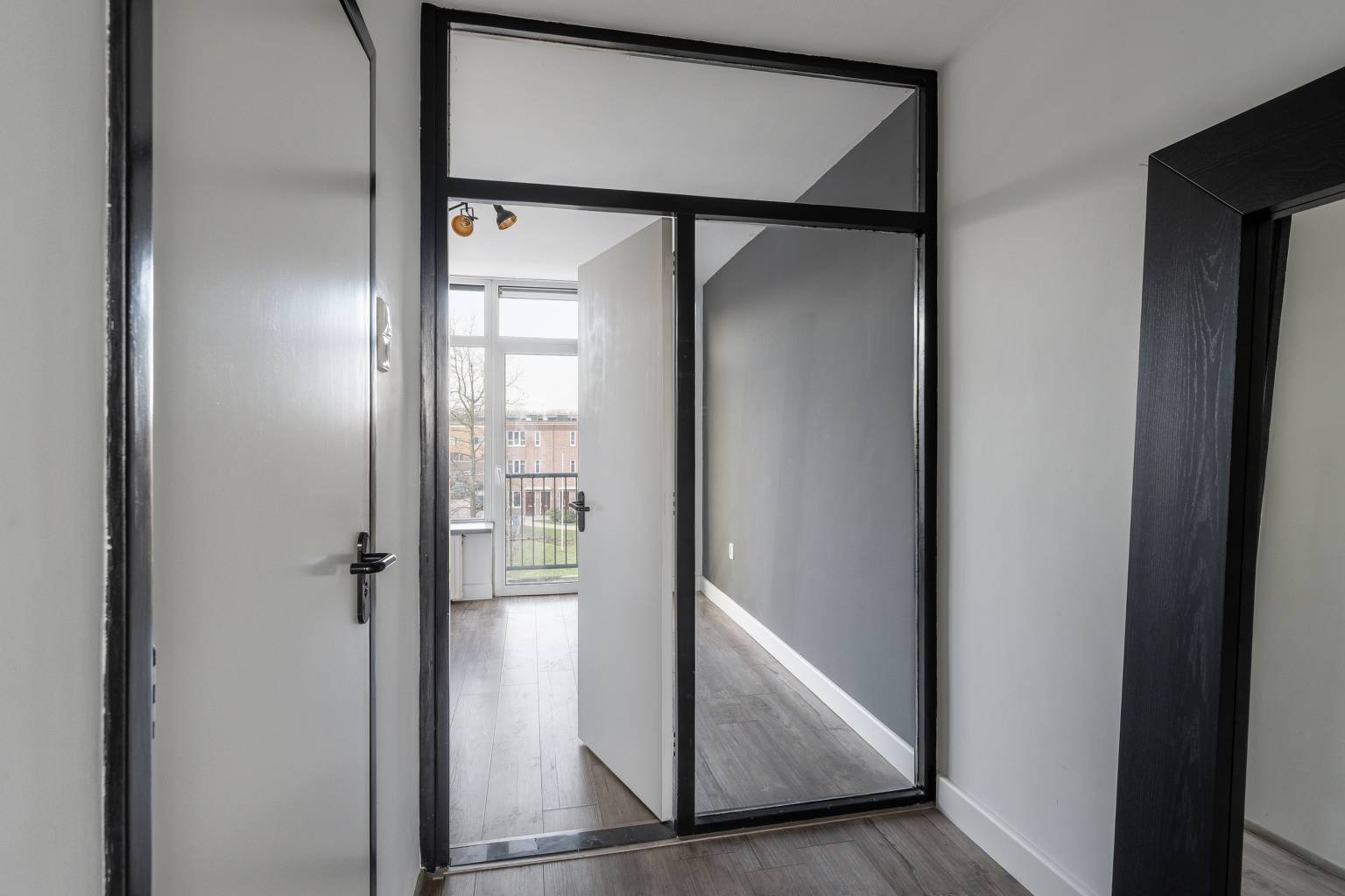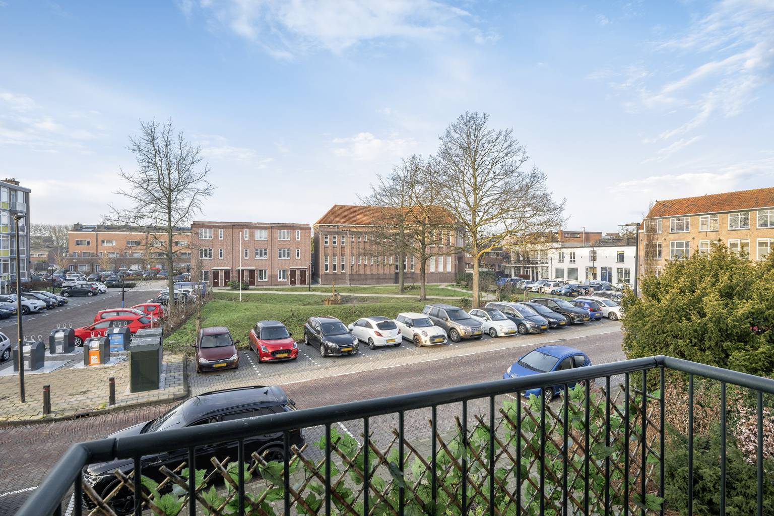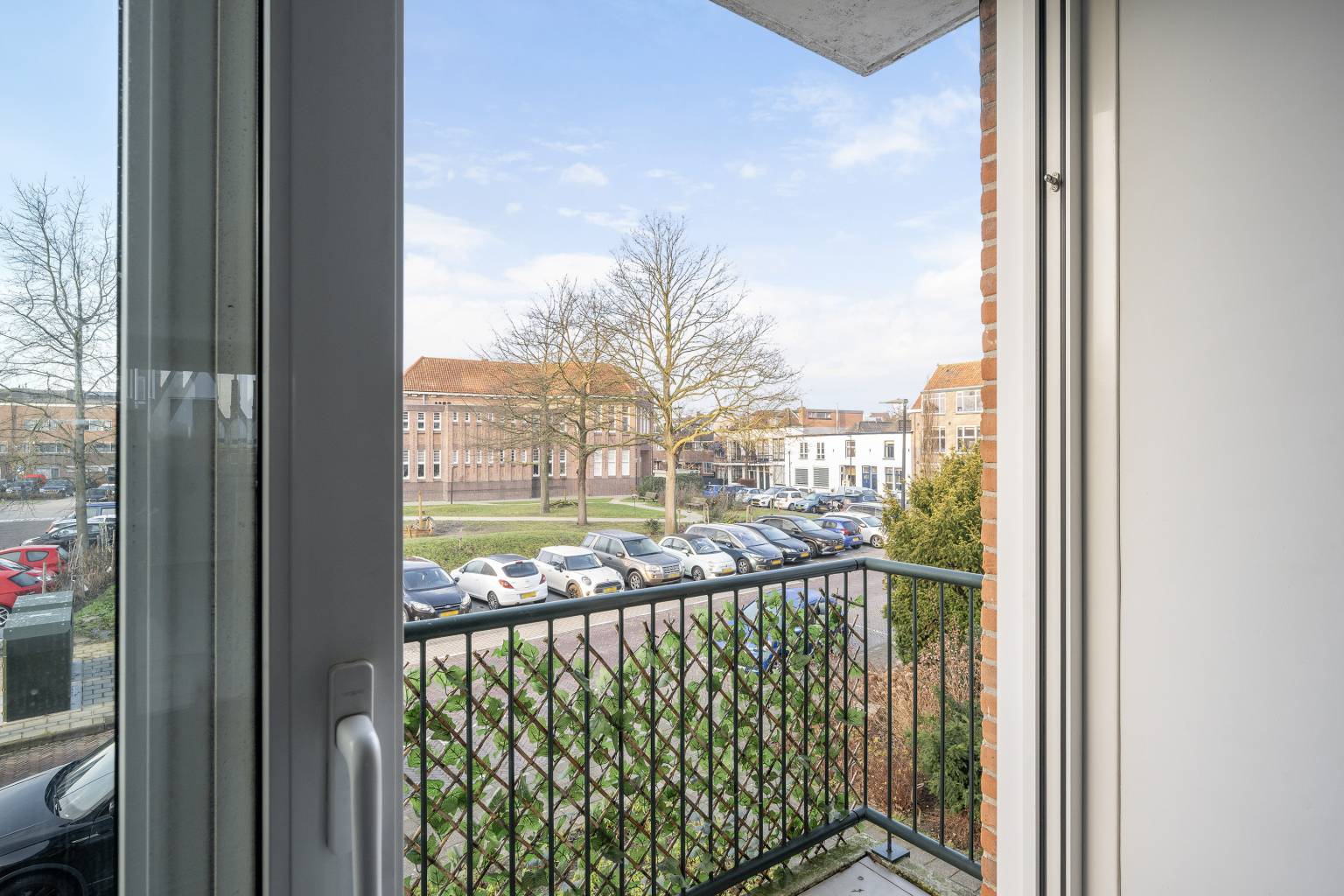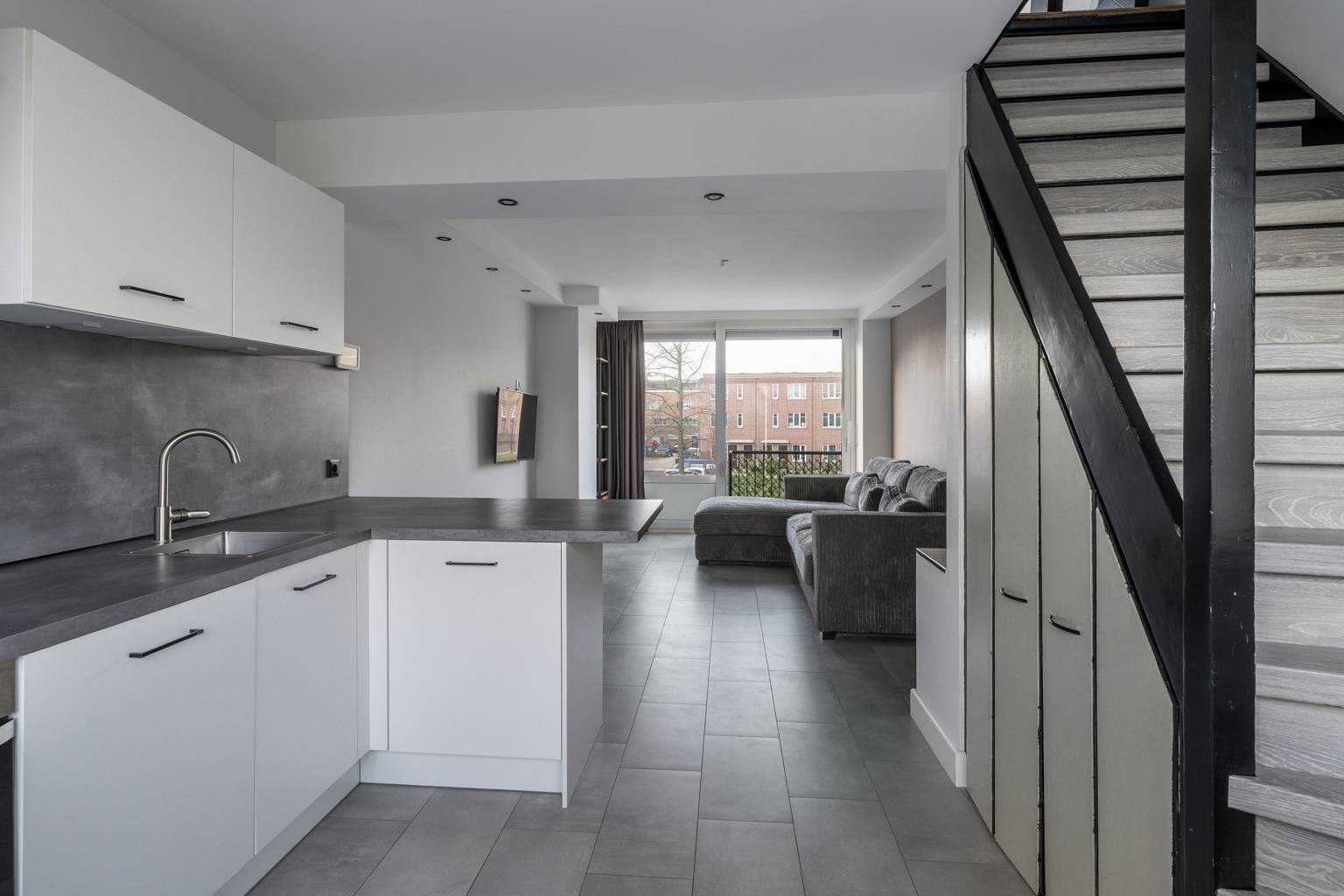 De woonkamer is gesitueerd aan de voorzijde en beschikt over een schuifpui naar het overdekte balkon, dat uitzicht bied over de straat.