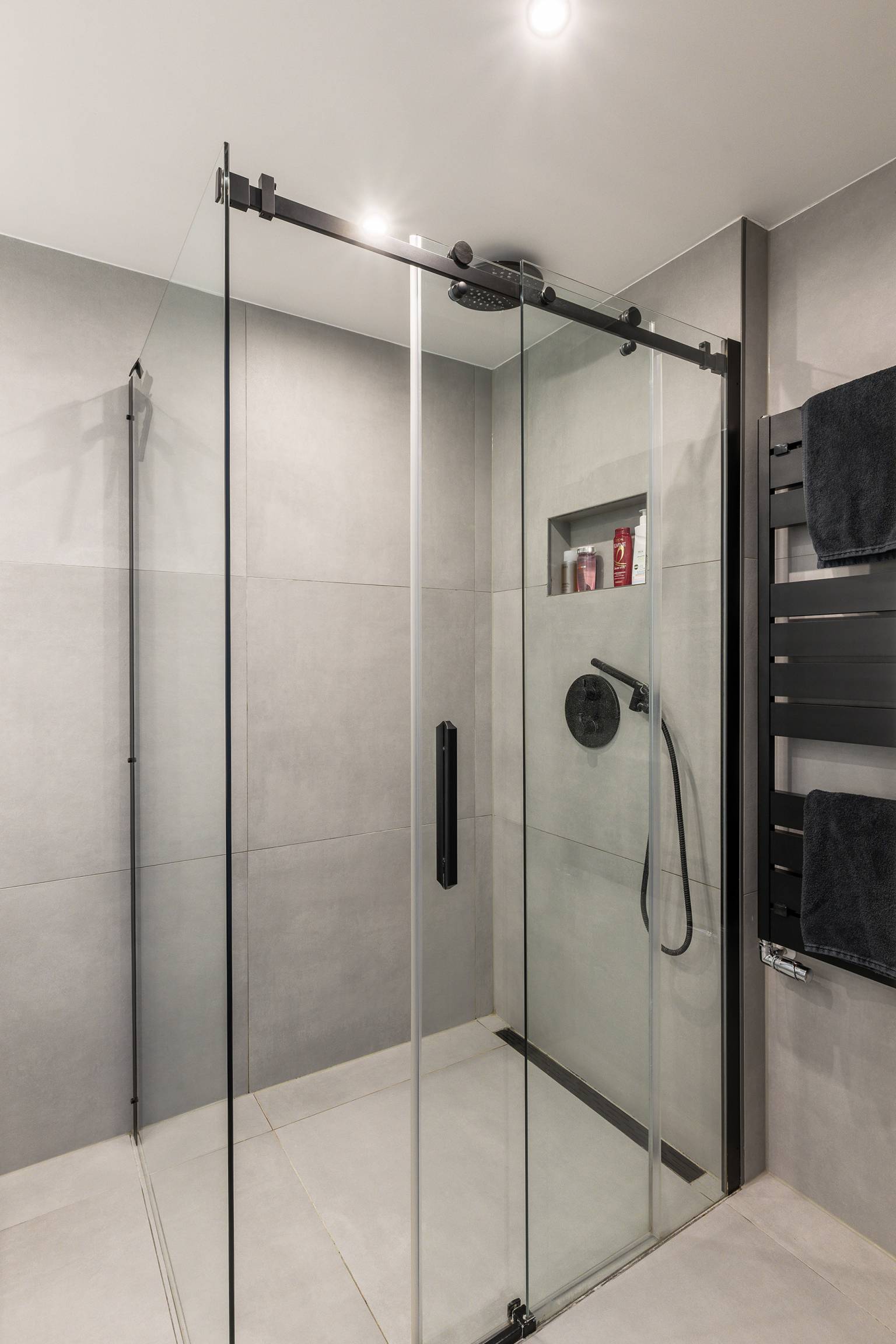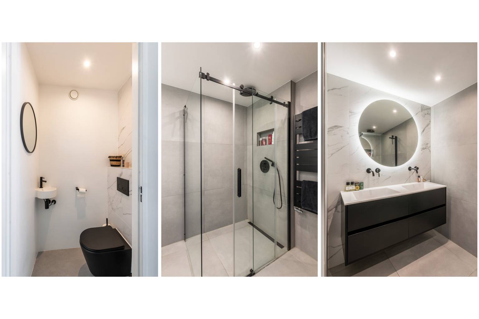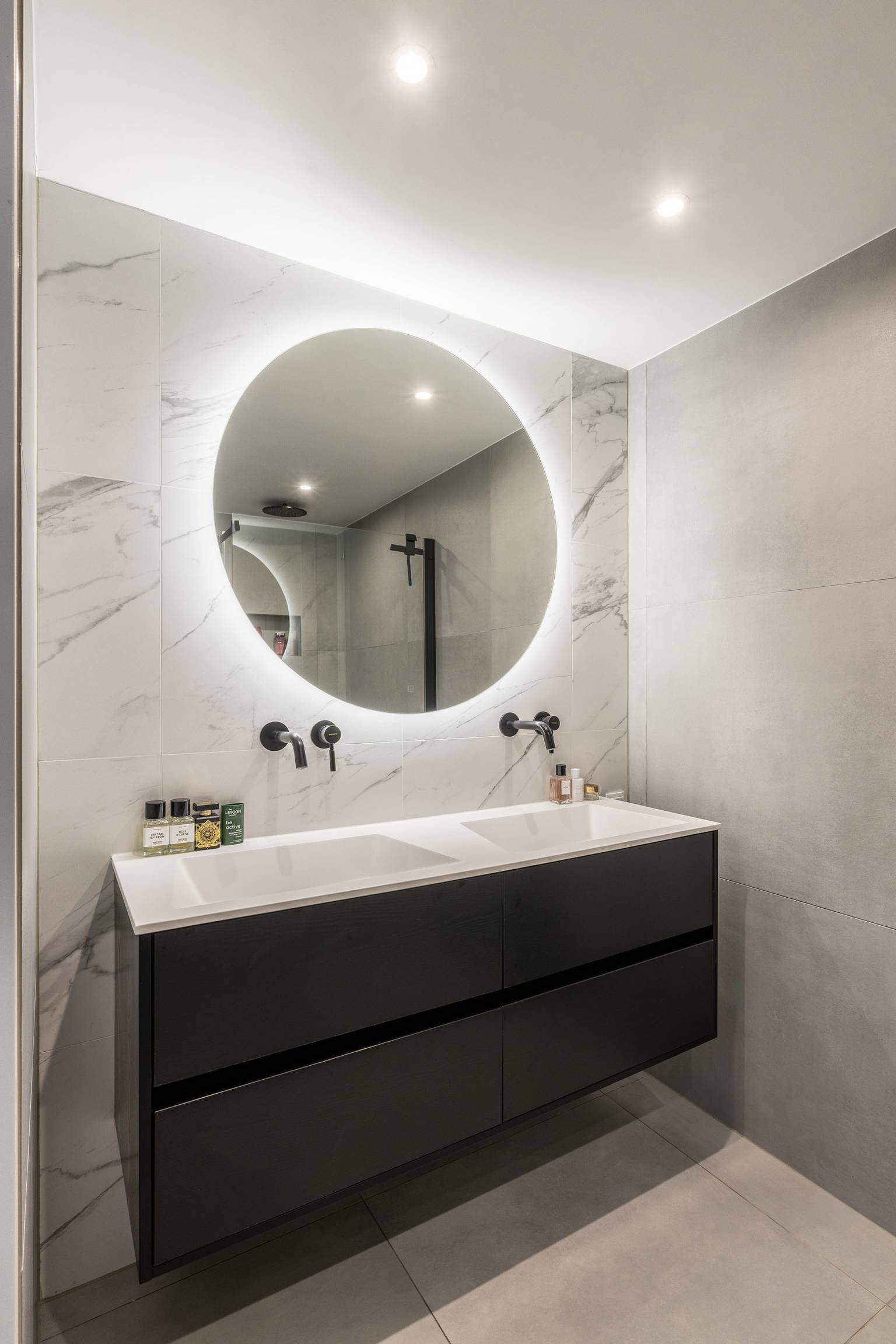 De nette badkamer is volledig betegeld en uitgerust met een douche en een dubbel wastafelmeubel met daarboven een spiegel. De achterwand van de douche is voorzien van een nis voor badproducten en het plafond is voorzien van inbouw spots.