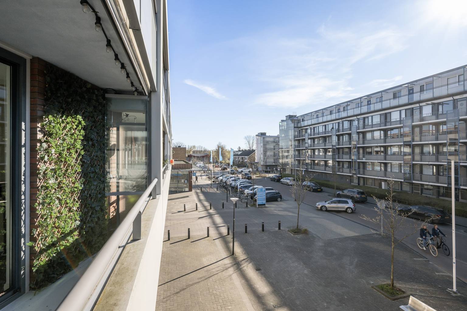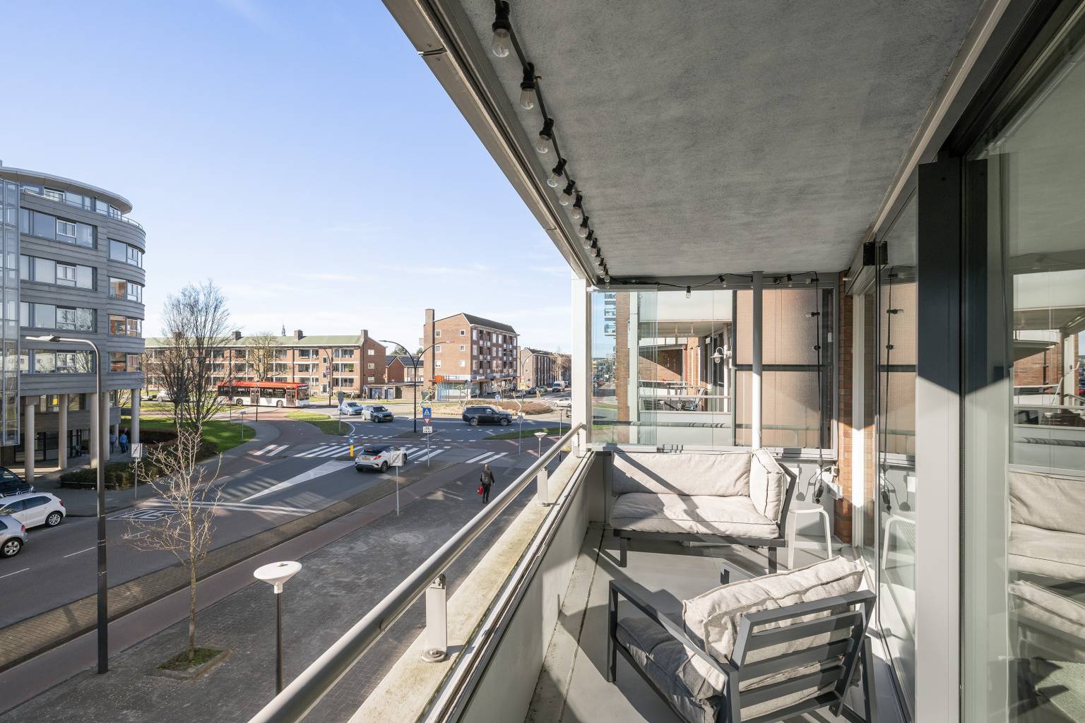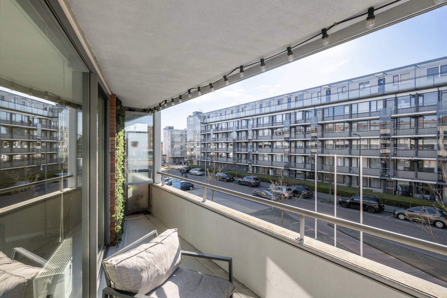 Het overdekte balkon zorgt voor een levendig uitzicht over de straat, waarbij vanuit de rechterkant het een vrij uitzicht biedt. Met de glazen schuifpanelen is er een mogelijkheid om er een serre van te maken, echter is het in het midden niet volledig afsluitbaar.