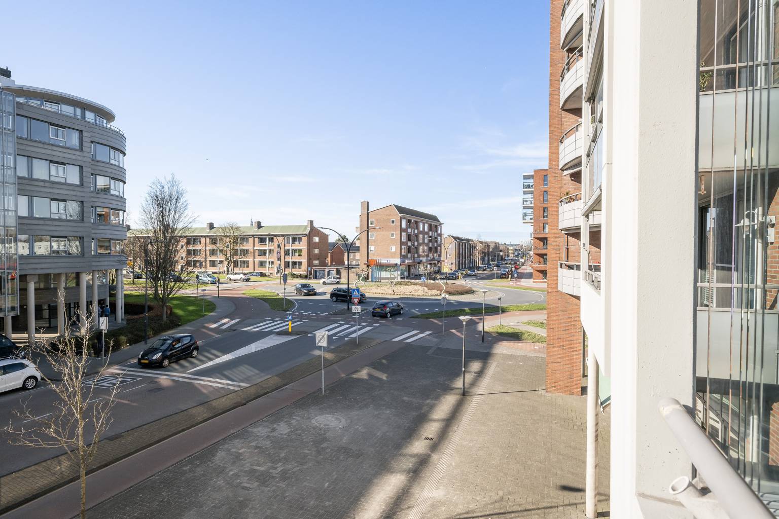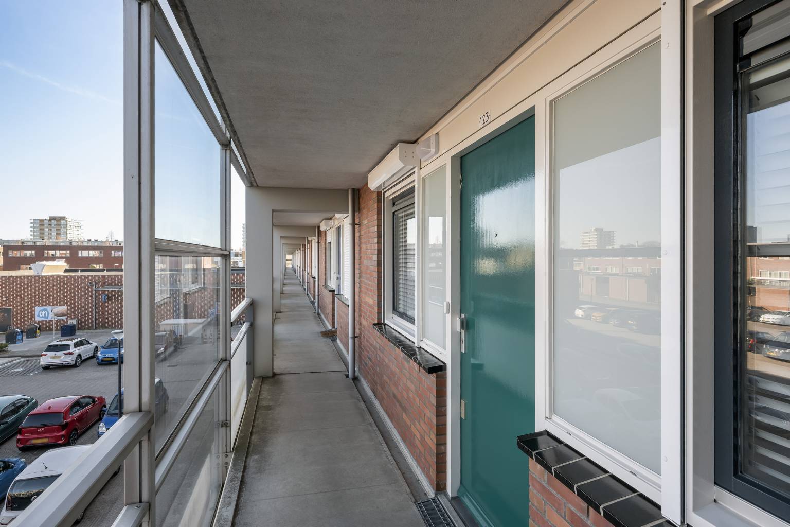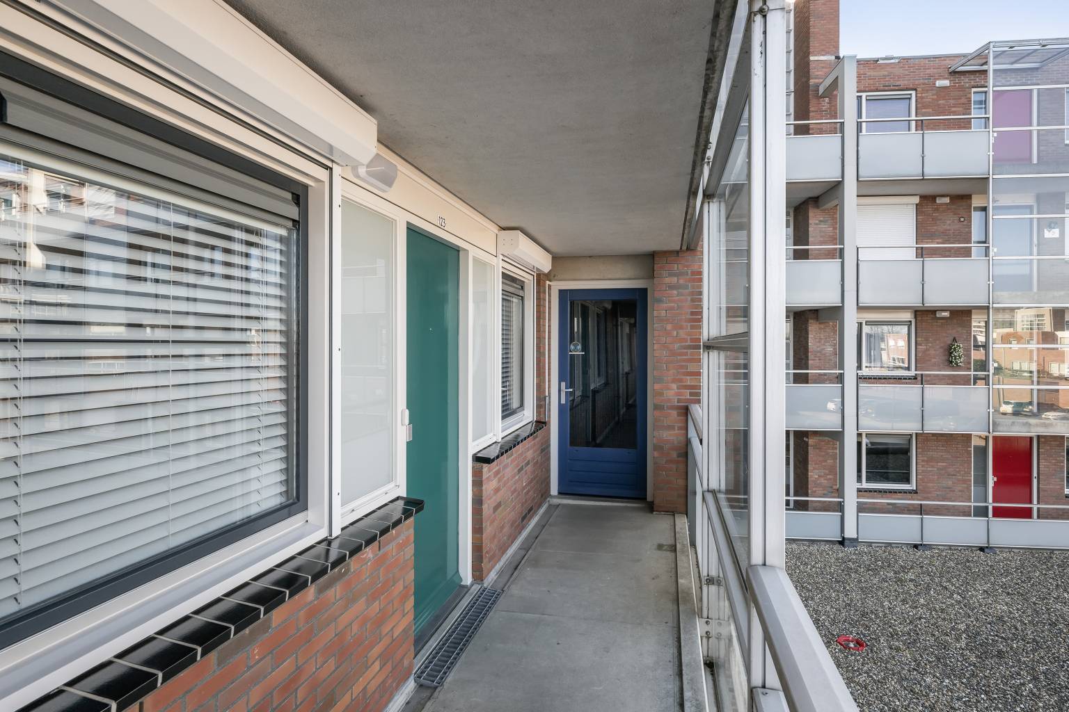 Het overdekte balkon zorgt voor een levendig uitzicht over de straat, waarbij vanuit de rechterkant het een vrij uitzicht biedt. Met de glazen schuifpanelen is er een mogelijkheid om er een serre van te maken, echter is het in het midden niet volledig afsluitbaar.
