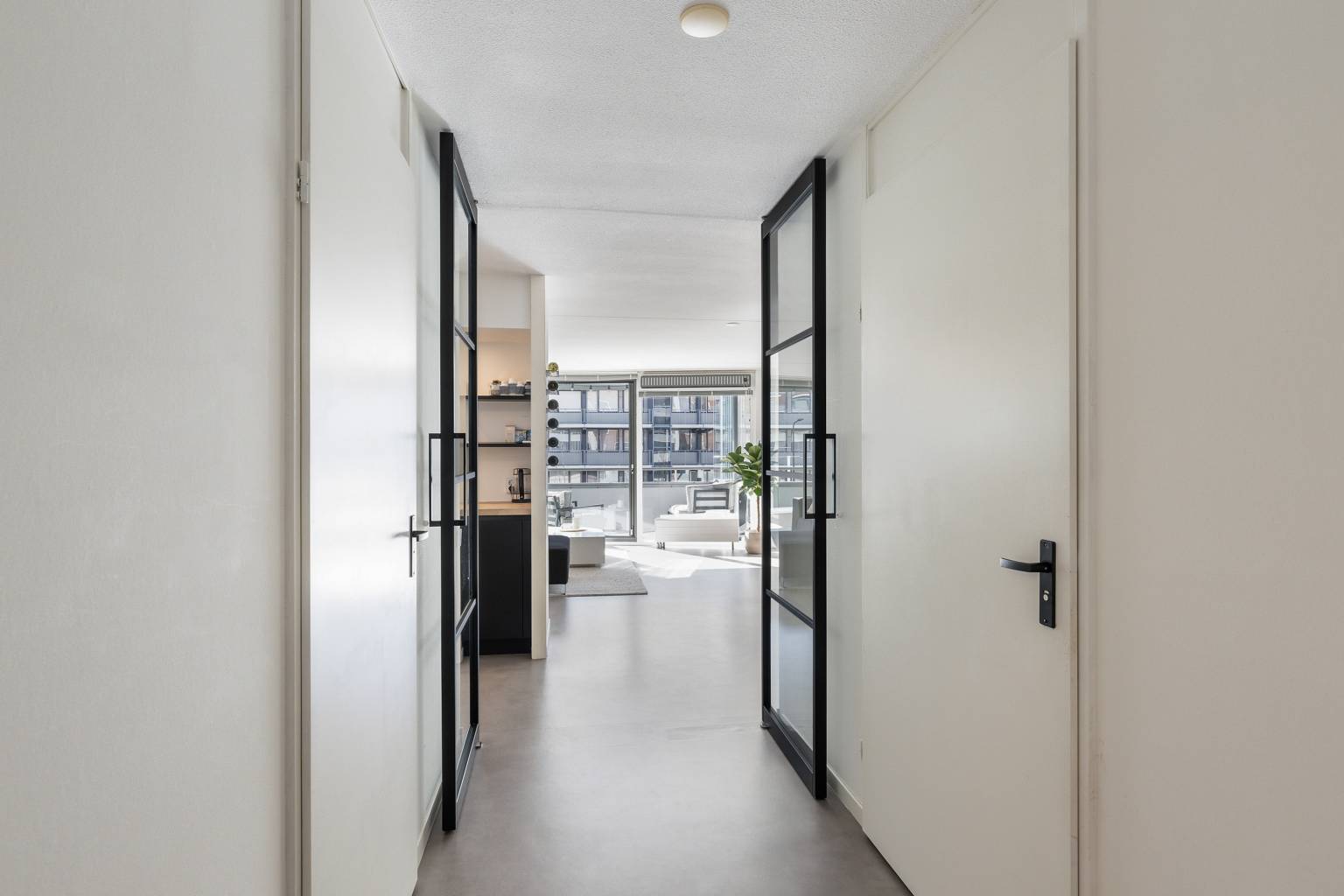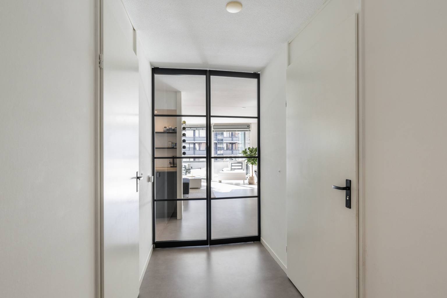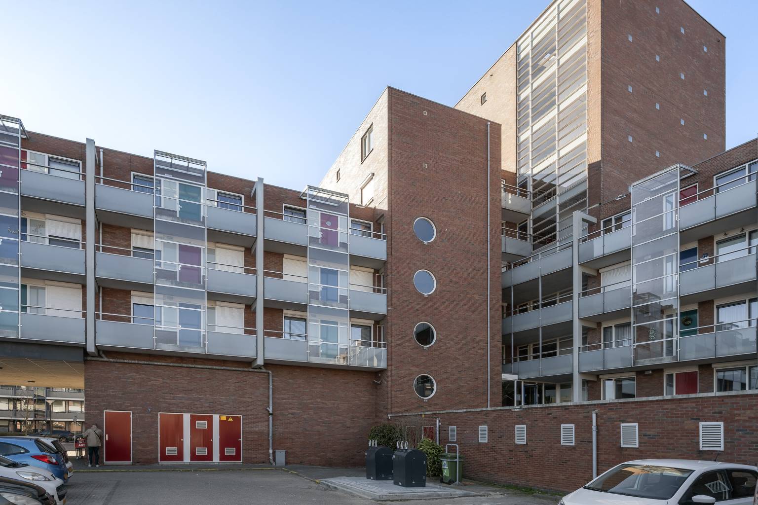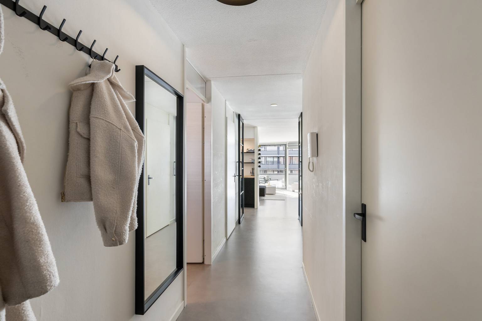 Het appartement zelf is modern en strak afgewerkt, met geschilderde Renovlies wanden en stijlvolle zwarte taatsdeuren met glas die een mooie verbinding vormen tussen de hal en de woonkamer. Vanuit de lichte woonkamer met grote schuifpui loopt u zo het gezellige overdekte balkon op, waar u een levendig uitzicht heeft over de straat en dankzij de glazen schuifpanelen zelfs de mogelijkheid heeft om er een beschutte serre van te maken. De woonkamer biedt daarnaast ruimte voor een praktische werkplek en staat in open verbinding met de halfopen keuken in L-opstelling, uitgevoerd in een donkere kleur met een houten werkblad en voorzien van diverse inbouwapparatuur. Via de hal zijn twee comfortabele slaapkamers bereikbaar, beide gelegen aan de galerijzijde en voorzien van elektrische rolluiken. De hoofdslaapkamer beschikt bovendien over een praktische vaste kast met schuifdeuren en een strakke wand met houten panelen. De badkamer is modern, volledig betegeld en voorzien van een douche en een dubbel wastafelmeubel, terwijl het toilet, net als de badkamer, in 2019 is vernieuwd. Een inpandige berging met de opstelling van de cv-ketel en aansluiting voor de wasmachine zorgt voor extra gemak, terwijl er daarnaast nog een externe berging aanwezig is met verlichting en elektra.