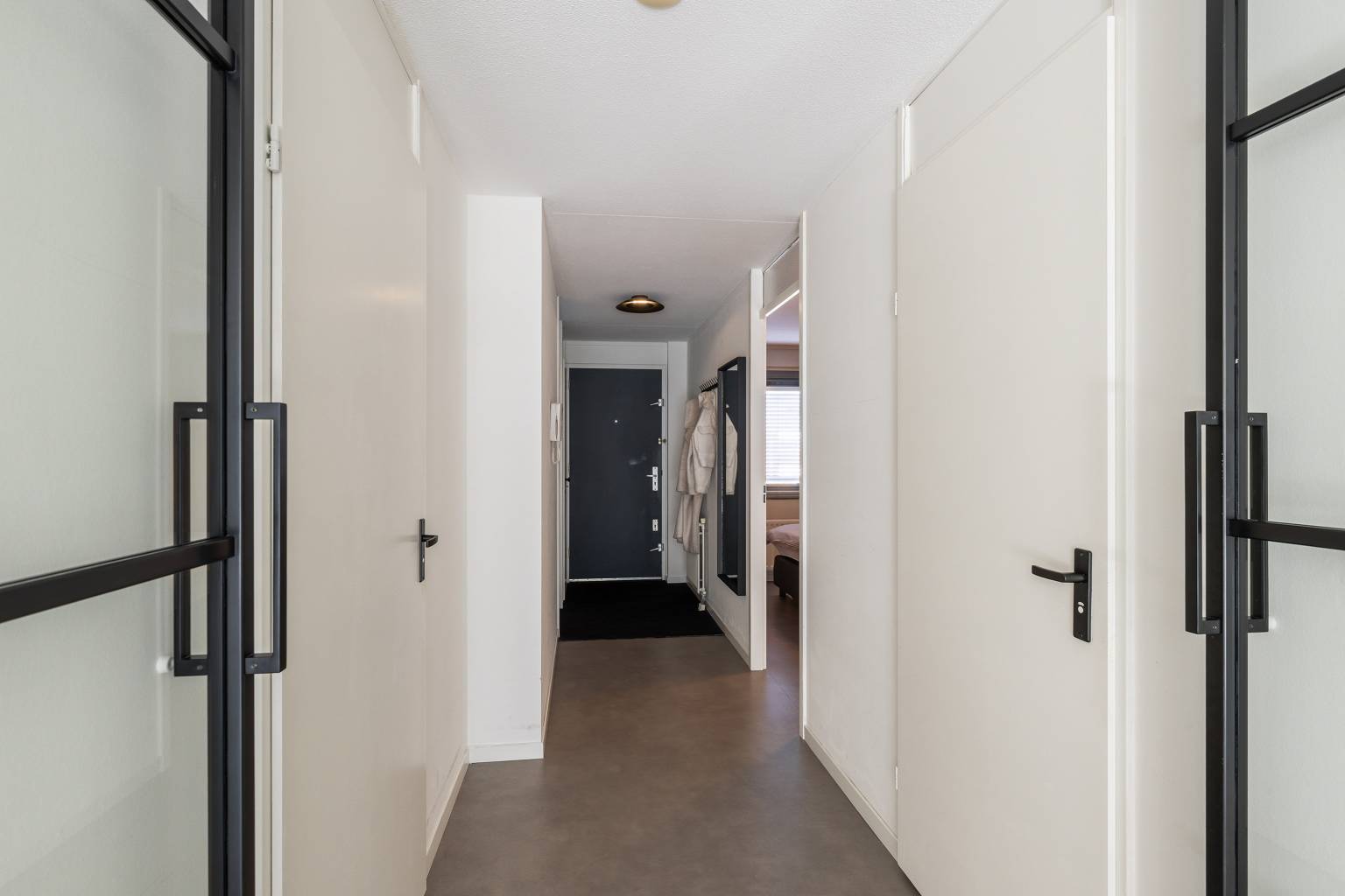Vanaf de overdekte galerij is de voordeur bereikbaar, waarna er een binnenkomst is in de hal, die toegang geeft tot twee slaapkamers, de badkamer, de woonkamer met open keuken en het gedeeltelijk betegelde toilet. Alle wanden zijn afgewerkt met Renovlies en op de vloer ligt vinyl.